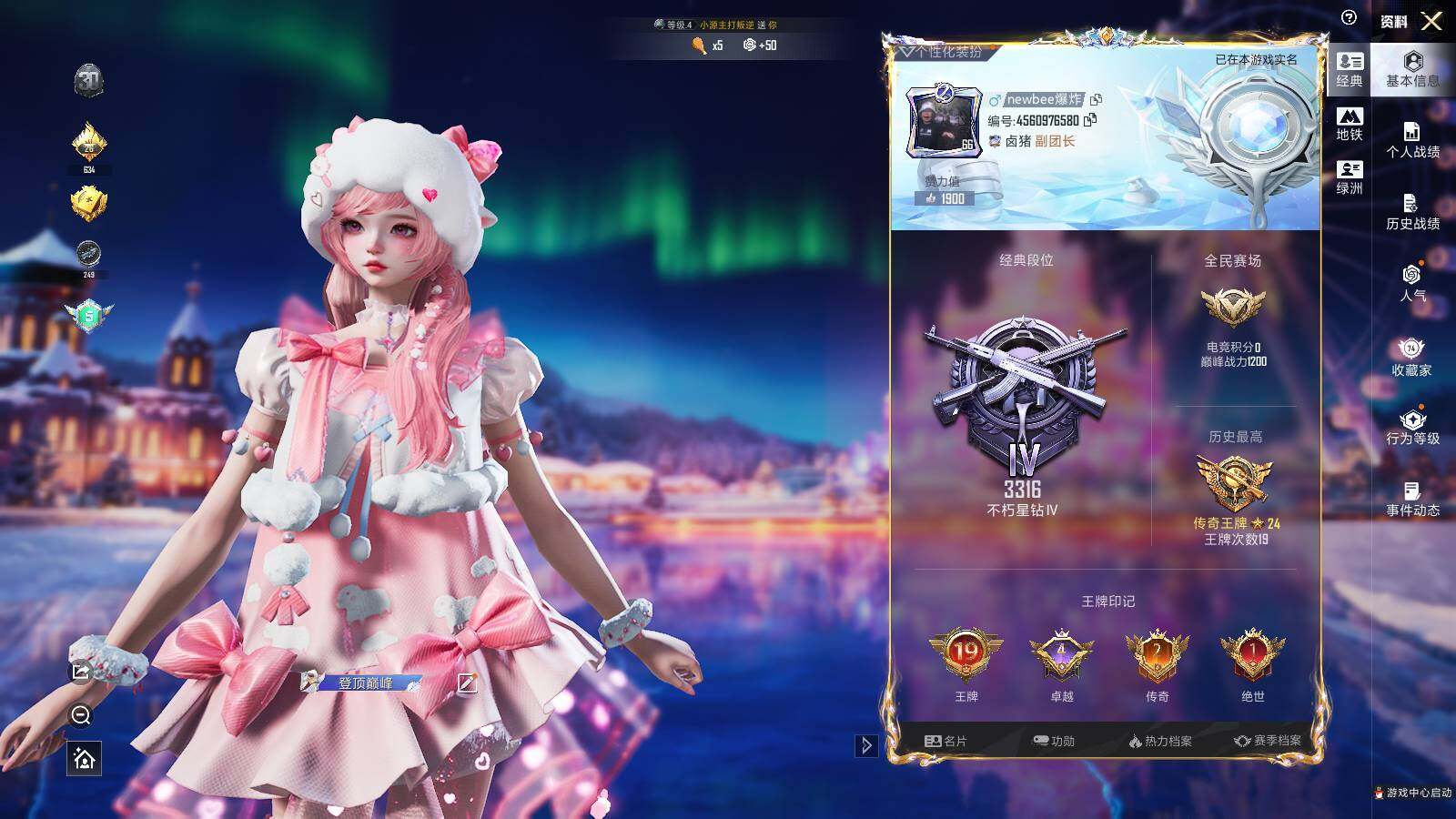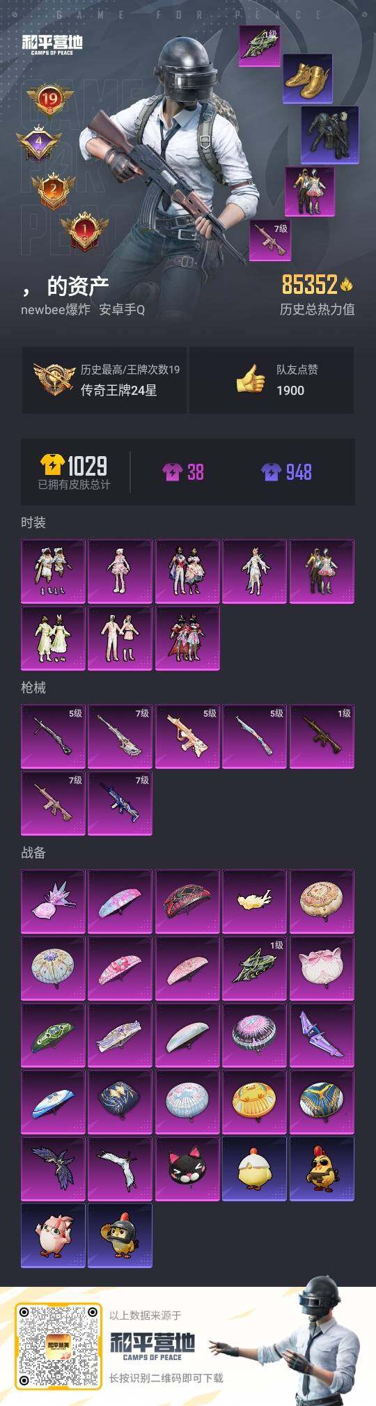 - PX_2095318- 安卓手Q-3王牌印记-3粉装-3特效枪-0载具-40787热力值-111套装-137枪皮-0卓越印记-0传奇印记 【3粉装】,绯穹魔姬,萨利娅,鎏金朋克 【3特效枪】GROZA-镜光银凌-5级 Kar98K-巳巳如意-5级 MK12-雪月幻音-6级 【3稀有紫装】,深海小丑鱼,龟仙人,临安公主, 【111稀有时装】,SS31特训,SS33特训,SS32特训,蓝冰羽,极速光