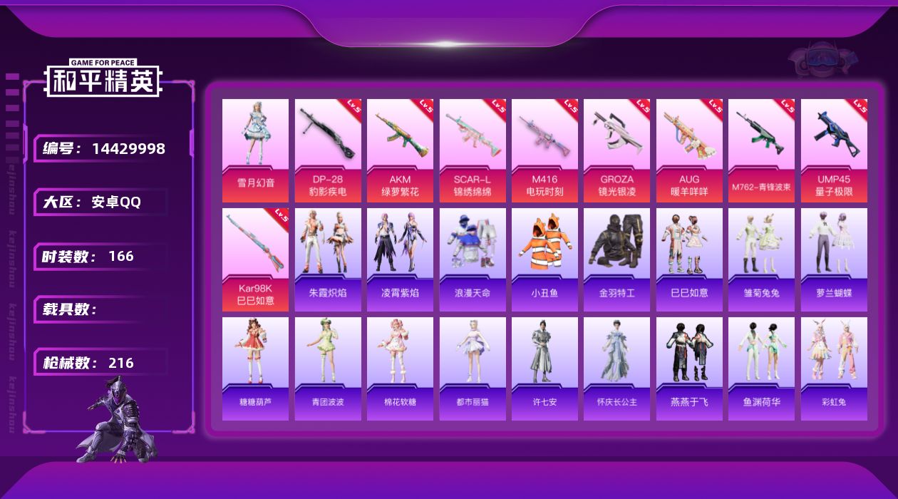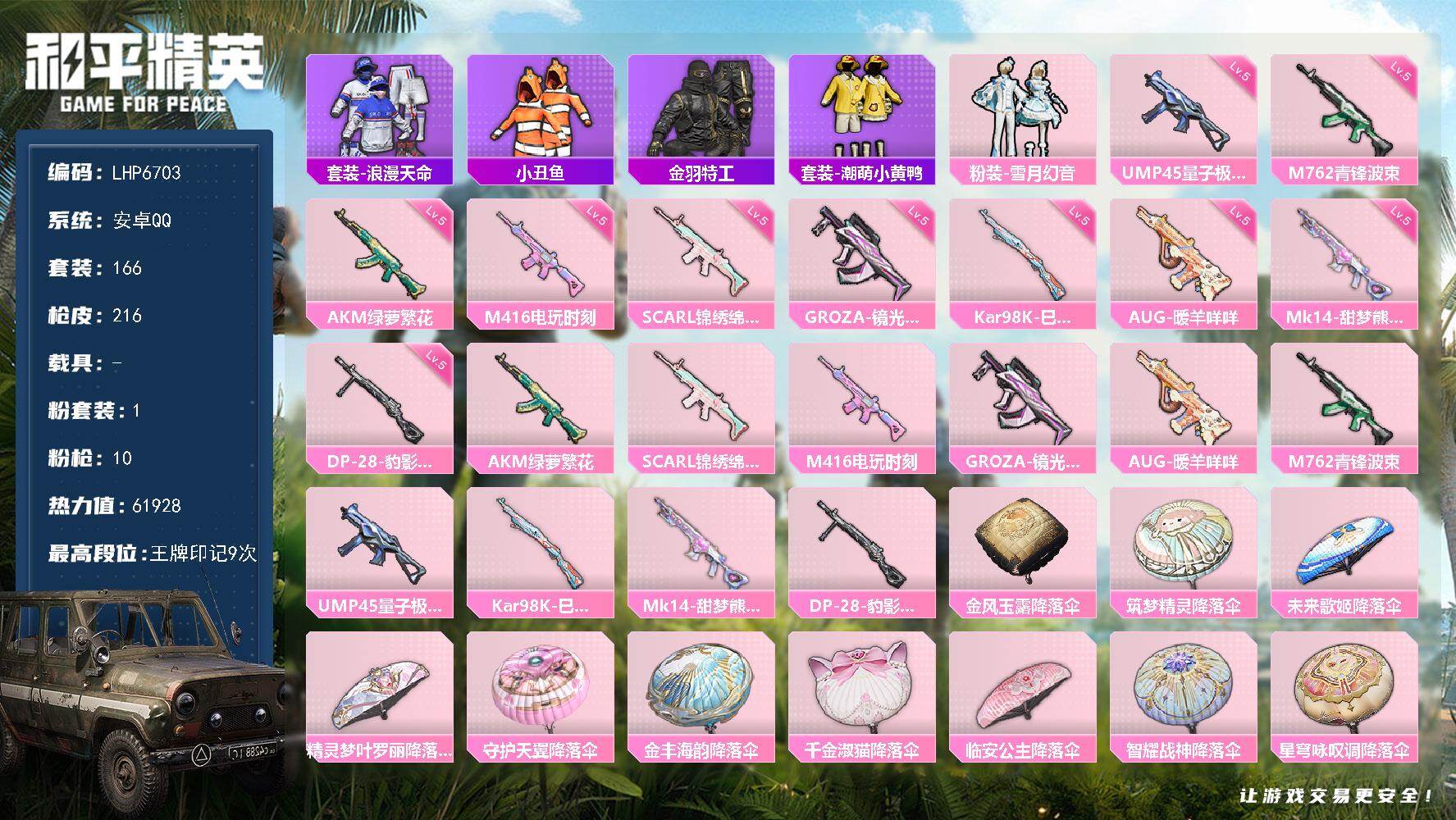 [14429998]可二次【店主推荐捡漏号!可直接换绑】/地铁满天赋 安卓 手Q-1粉装-10特效枪-1粉色飞行器-6.1w热力值-9王牌印记-166套装-216枪皮【热门品类】:套装-浪漫天命,套装-小丑鱼,套装-金羽特工,套装-潮萌小黄鸭【粉色套装】:粉装-雪月幻音【粉色枪皮等级】:AKM-绿萝繁花(五级),SCAR-L-锦绣绵绵(五级),M416-电玩时刻(五级),GROZA-镜光银凌(五级),AUG-暖羊咩咩(五级),M762-青锋波束(五级),UMP45-量子极限(五级),Kar98K-巳巳如意(五级),Mk14-甜梦熊击(五级),DP-28-豹影疾电(五级)