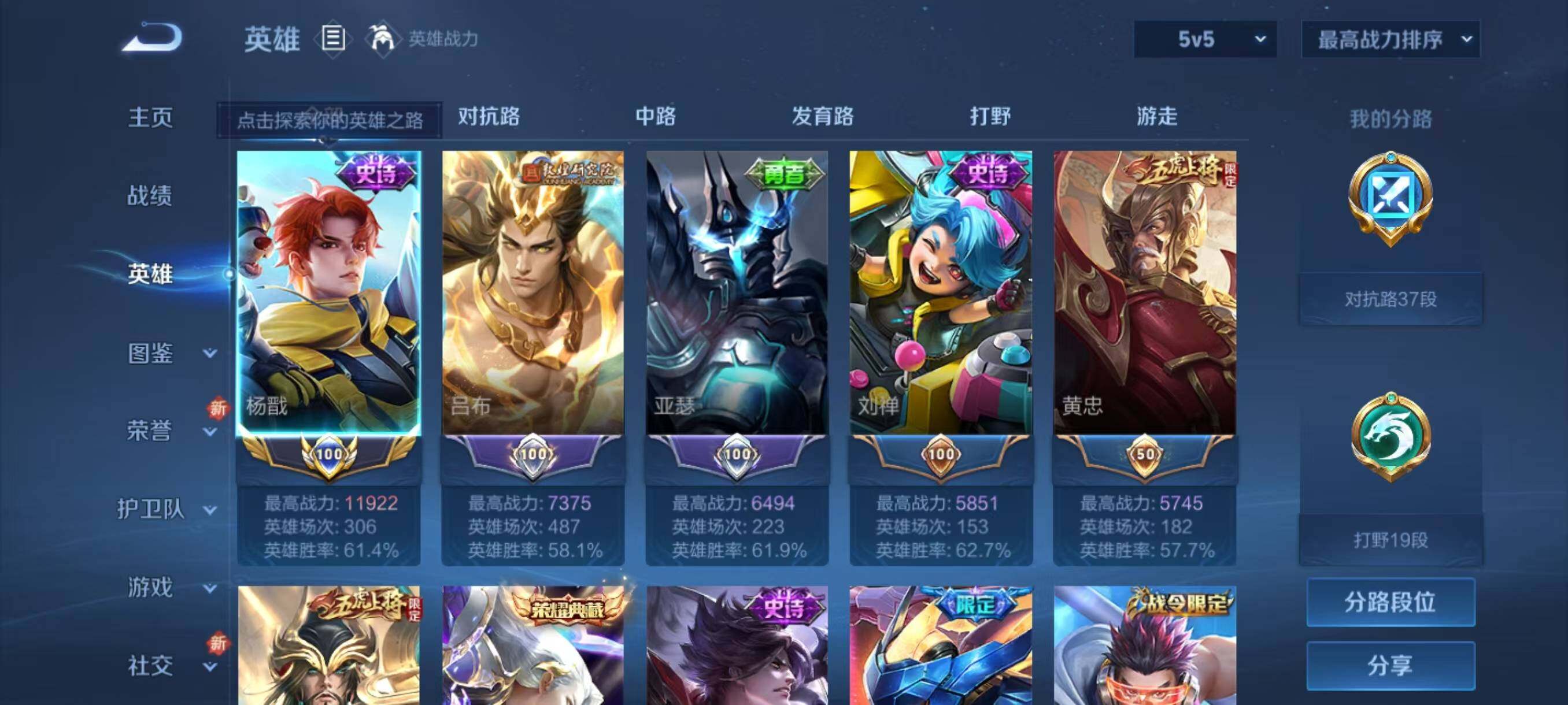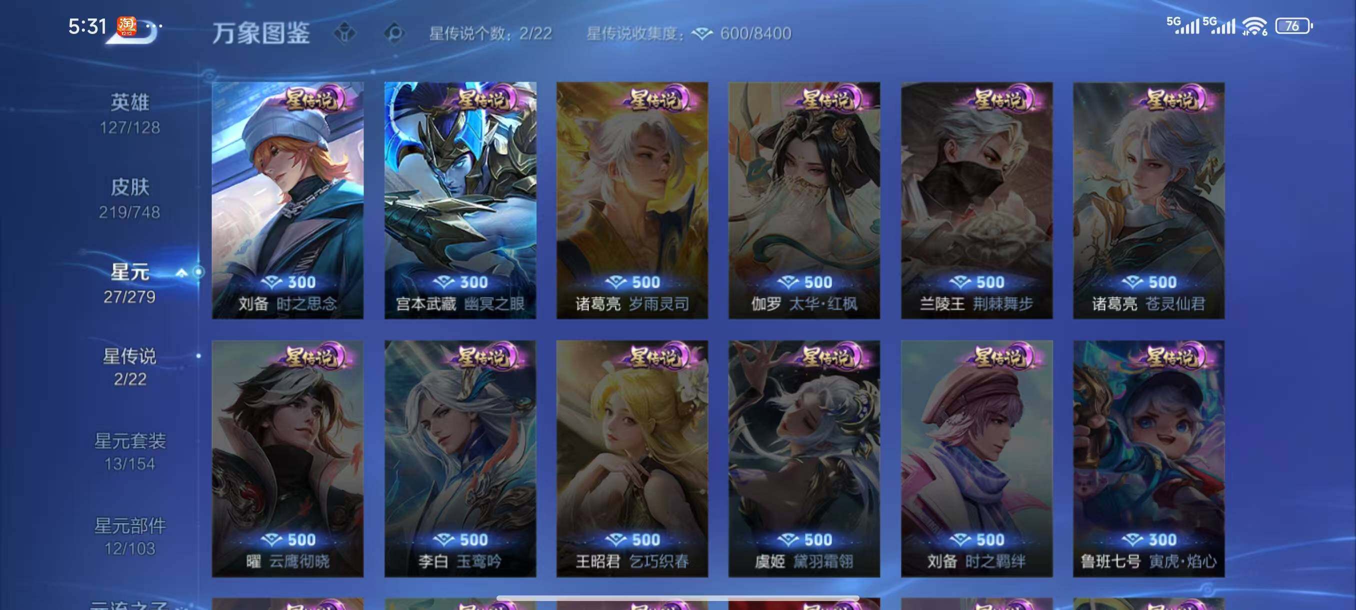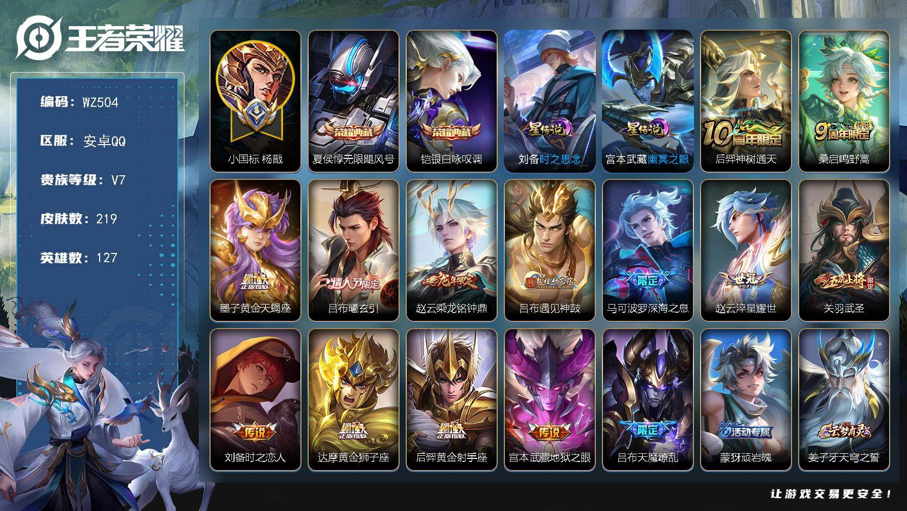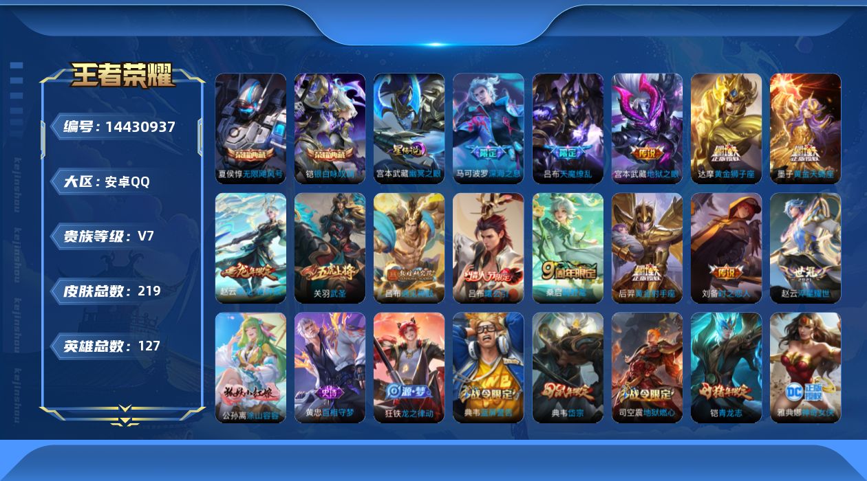 - [11603981]V7 8传说 122英雄 192皮肤 可修改实名 优质装备:云鹰飞将(小将军),久胜战神,一念神魔,乞巧织情,画中仙,记忆之芯(机甲兔),鹤羽星尊 珍宝阁皮:优雅恋人 限定皮:鸣野蒿,五谷丰年,游园惊梦,梁祝,天狼绘梦者,李小龙,大圣娶亲,云端筑梦师 史诗皮:龙之律动,黄金分割率,江河有灵,蒙恬荣光圣徽,偶像歌手,魅语,青蛇,末日机甲-吕布,时之恋人-孙尚香,乱世虎臣,节奏热浪,女仆咖啡,摇滚巨星,水果甜心,星夜王子,心灵骇客,德古拉伯爵,幽灵船长,鬼剑武藏,繁星吟游(呼啦呼啦),曙光守护者,金属风暴,圣诞狂欢,鹰眼统帅,魅力维加斯,未来纪元-赵云