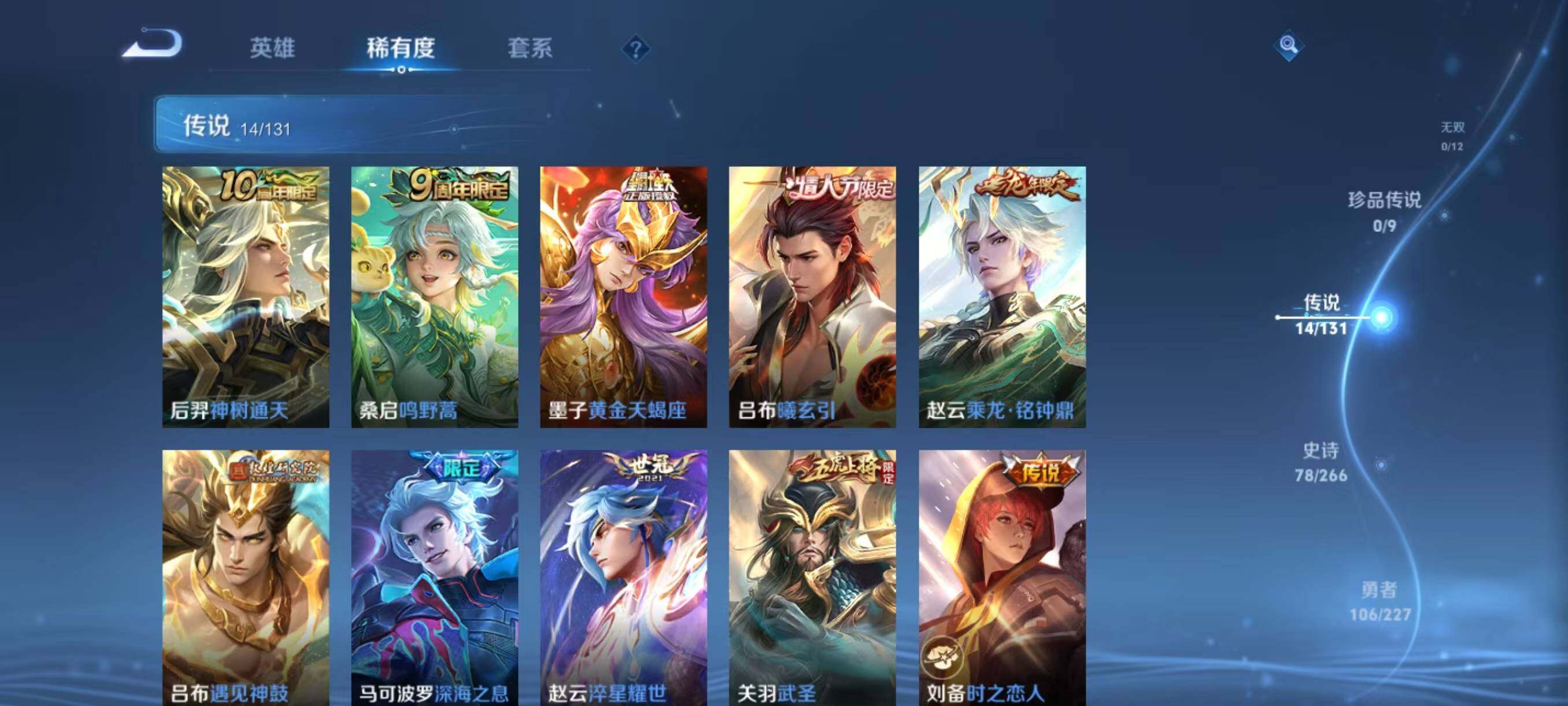 【传说皮肤】:后羿神树通天,桑启鸣野蒿,墨子黄金天蝎座,吕布曦玄引,赵云乘龙铭钟鼎,吕布遇见神鼓,马可波罗深海之息,赵云淬星耀世,关羽武圣,刘备时之恋人,达摩黄金狮子座,后羿黄金射手座,宫本武藏地狱之眼,吕布天魔缭乱