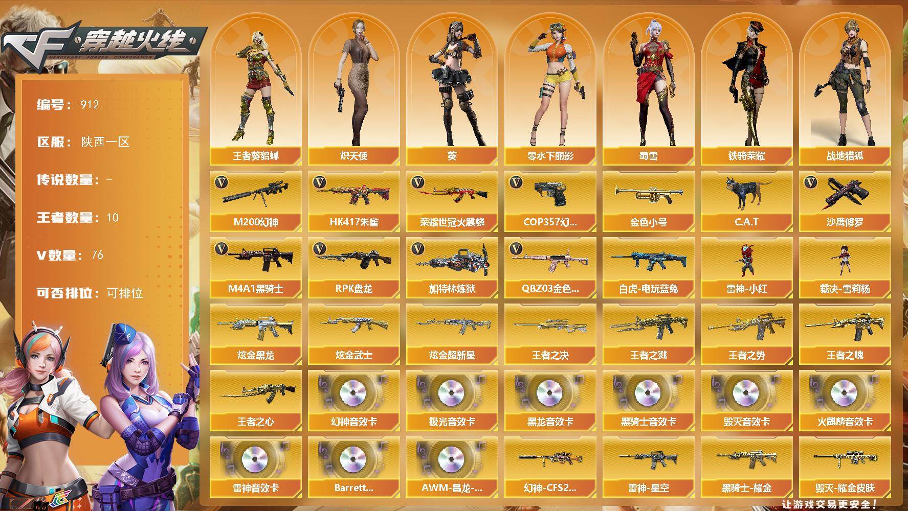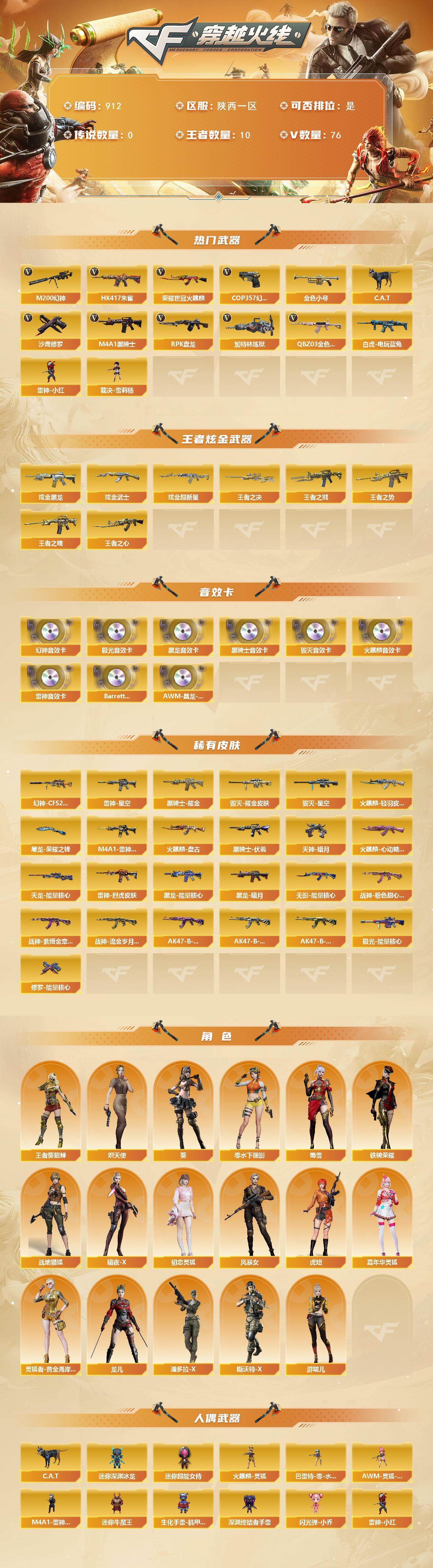 [14440162]陕西一区-76V-10王者-3炫金 【热门武器】:QBZ03-金色蔷薇,HK417-朱雀,M200-幻神,荣耀世冠-火麒麟,白虎-电玩蓝兔,金色小号,C.A.T,M4A1-黑骑士*3,RPK-盘龙,加特林-炼狱,雷神-小红,裁决-雪莉杨,COP 357-幻灵,沙鹰-修罗*5 【王者炫金武器】:王者之戮,王者之势,王者之魄,王者之心,王者之决,炫金黑龙,炫金武士,炫金超新星 【音效卡】:M200-幻神音效卡,AK47-火麒麟音效卡,M4A1-雷神音效卡,M4A1-黑龙音效卡,M4A1-黑骑士音效卡,Barrett-毁灭音效卡,Barrett-极光音效卡,Barrett-碧霄极光音效卡,AWM-昌龙-怀旧音效卡 【皮肤】:幻神-CFS2022,雷神-星空,M4A1-雷神-CFS 2019,雷神-烈虎皮肤,火麒麟-轻羽皮肤,火麒麟-盘古,火麒麟-心动糖果,毁灭耀金皮肤,毁灭-星空,黑龙-能量核心,黑龙-暗月,黑骑士耀金皮肤,黑骑士-伏羲,无影-能量核心,战神-粉色甜心皮肤,战神-紫绶金章皮肤*2,战神-流金岁月皮肤*3,AK47-B-常胜将军-曹操*3,AK47-B-常胜将军-刘备,AK47-B-常胜将军-孙权,天龙-能量核心,极光-能量核心,修罗-能量核心,天神-暗月,屠龙-荣耀之锋 【角色】:葵,战地猎狐,王者-葵-貂蝉,炽天使,暗夜-X,初恋灵狐,风暴女,虎妞,嘉年华灵狐,零-水下丽影,灵狐者-黄金海岸,龙儿,潘多拉-X,斯沃特-X,蜀雪,铁骑荣耀,游珑儿 【人偶武器】:雷神-小红,裁决-雪莉杨,火麒麟-灵狐,M4A1-雷神-精英刀锋,巴雷特-零-水下丽影,AWM-灵狐-15周年嘉年华,C.A.T,迷你深渊冰龙,迷你牛魔王,生化手雷-机甲核心,深渊终结者手雷,闪光弹-小乔,迷你超能女侍 【挑战大师】:神圣爆裂者III,AK47-冰龙粉碎者,激光毁灭者III,神圣爆裂者-末日III 【英雄级武器】:AK47-火麒麟*2,M4A1-黑龙,M4A1-雷神*2,M4A1-黑骑士*3,AK47-无影,M4A1-武圣,AK47-黑鲨,M4A1-龙血,HK417-朱雀,无影-神兵利器,黑武士-锦绣游龙,QBZ03-金色蔷薇,王者之武-觉醒版,AK-47-猩红传说*2,AK47-B-战神,王者冰魄-觉醒版,AK47-B-常胜将军,白虎-电玩蓝兔,荣耀世冠-火麒麟,AWM-天龙*2