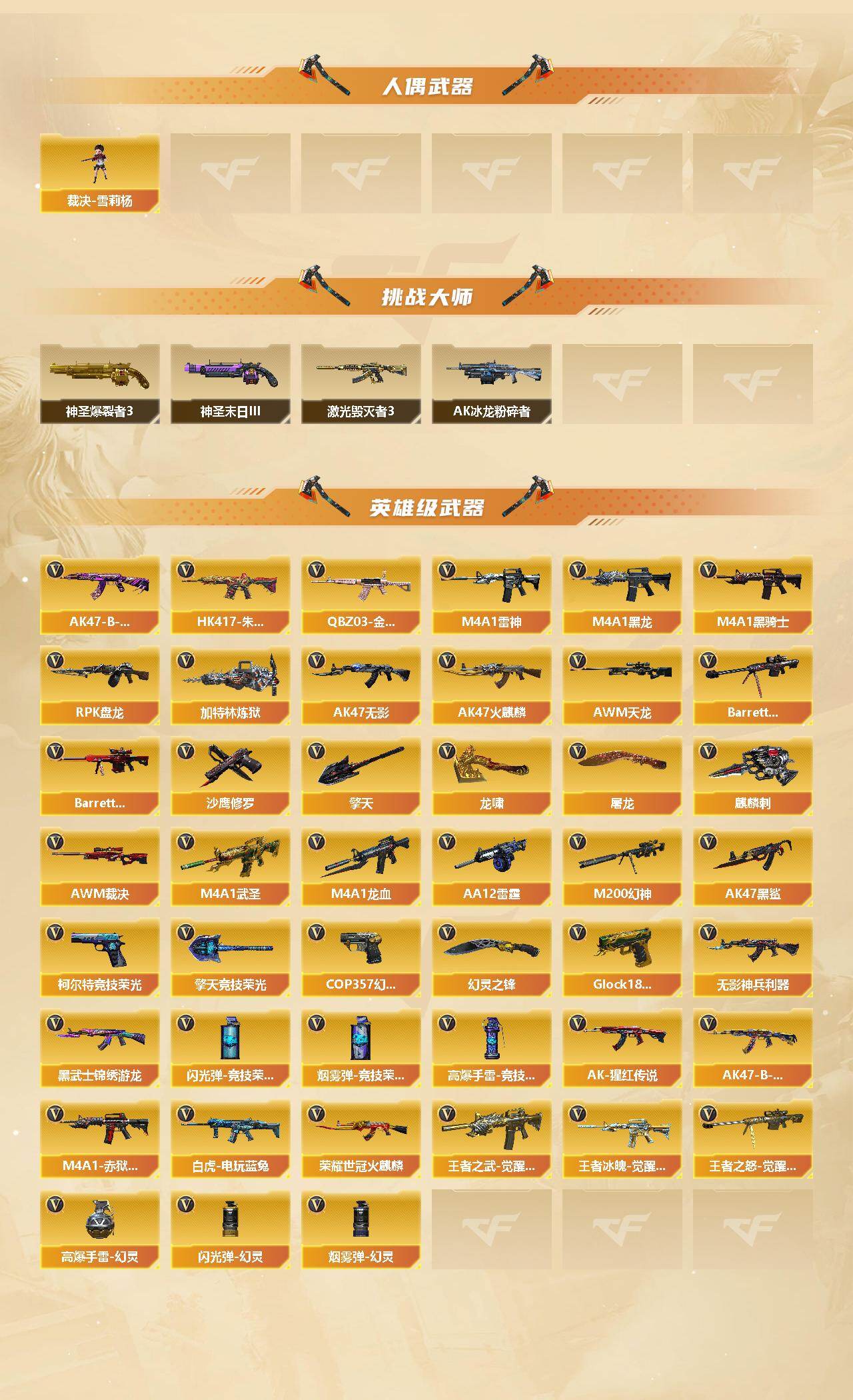 【英雄级武器】:AK47-火麒麟*2,M4A1-黑龙,M4A1-雷神*2,M4A1-黑骑士*3,AK47-无影,M4A1-武圣,AK47-黑鲨,M4A1-龙血,HK417-朱雀,无影-神兵利器,黑武士-锦绣游龙,QBZ03-金色蔷薇,王者之武-觉醒版,AK-47-猩红传说*2,AK47-B-战神,王者冰魄-觉醒版,AK47-B-常胜将军,白虎-电玩蓝兔,荣耀世冠-火麒麟,AWM-天龙*2