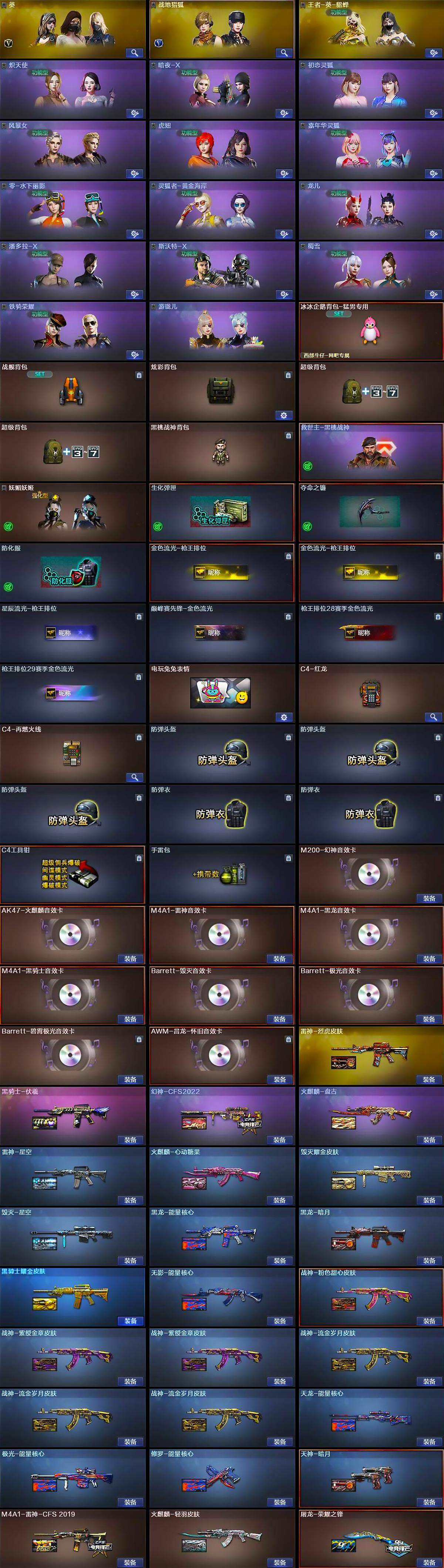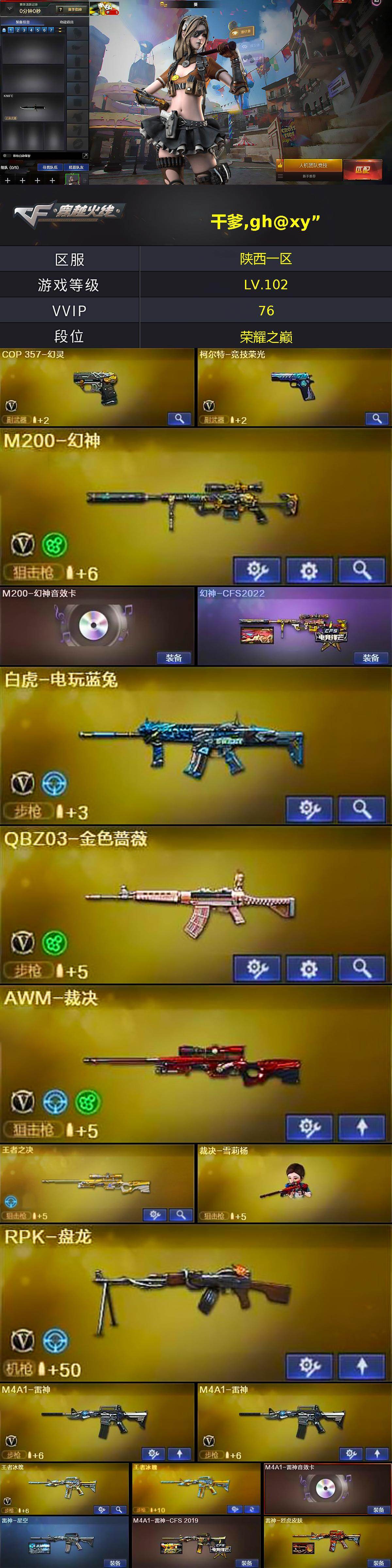 【皮肤】:幻神-CFS2022,雷神-星空,M4A1-雷神-CFS 2019,雷神-烈虎皮肤,火麒麟-轻羽皮肤,火麒麟-盘古,火麒麟-心动糖果,毁灭耀金皮肤,毁灭-星空,黑龙-能量核心,黑龙-暗月,黑骑士耀金皮肤,黑骑士-伏羲,无影-能量核心,战神-粉色甜心皮肤,战神-紫绶金章皮肤*2,战神-流金岁月皮肤*3,AK47-B-常胜将军-曹操*3,AK47-B-常胜将军-刘备,AK47-B-常胜将军-孙权,天龙-能量核心,极光-能量核心,修罗-能量核心,天神-暗月,屠龙-荣耀之锋