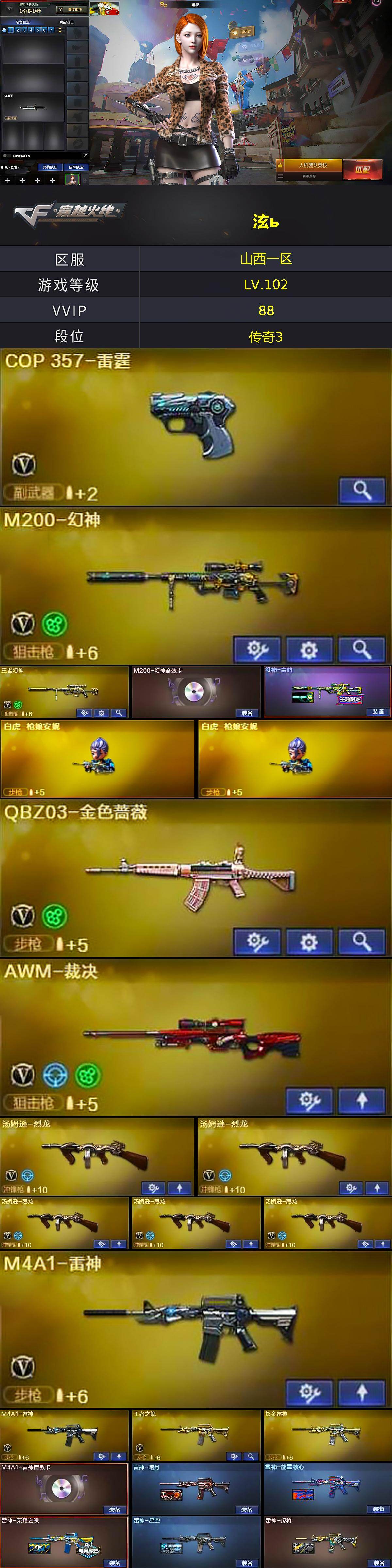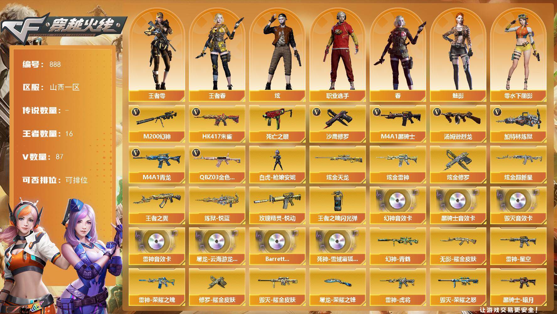 [14443100]山西一区-87V-16王者-4炫金 【热门武器】:QBZ03-金色蔷薇,HK417-朱雀,M4A1-青龙,M200-幻神,死亡之眼,M4A1-黑骑士*2,汤姆逊-烈龙*5,加特林-炼狱*3,白虎-枪娘安妮*2,沙鹰-修罗*3 【王者炫金武器】:王者之翼,玫瑰精灵-悦动,炼狱-悦蓝*2,炫金雷神,炫金超新星,炫金天龙,炫金修罗,王者之魄闪光弹 【音效卡】:屠龙-云海游龙音效卡,M200-幻神音效卡,M4A1-雷神音效卡,M4A1-黑骑士音效卡,Barrett-毁灭音效卡,Barrett-碧霄极光音效卡,死神-雪域霜狐-怀旧音效卡 【皮肤】:幻神-青鹤,雷神-暗月,雷神-能量核心,雷神-荣耀之魄,雷神-星空,雷神-虎将,火麒麟-雷神,毁灭-荣耀之怒,毁灭耀金皮肤,黑龙-能量核心,黑龙-暗月,黑骑士-暗月,无影-能量核心,无影耀金皮肤,战神-粉色甜心皮肤,战神-紫绶金章皮肤,战神-流金岁月皮肤,AK47-B-常胜将军-曹操,AK47-B-常胜将军-刘备,AK47-B-常胜将军-孙权,AWM-天龙-传奇70KG,AWM-天龙-传奇白鲨,极光-能量核心,修罗-能量核心,修罗耀金皮肤,屠龙-荣耀之锋 【角色】:魅影,炫,春,战地猎狐,王者-零,王者春,雪域霜狐,奇洋探员,乔伊教练,修道士,云海玲珑,初恋灵狐,电竞少女,芳心审判者,风暴女,虎妞,疾风,娟娟,兰-海滩派对,兰-新年限定,兰妹妹,0号玩家,零-水下丽影,灵狐者-X,龙儿,麻雀,女战神,潘多拉-X,蛇姬,斯沃特-X,蜀雪,铁骑荣耀,维纳斯,雪莉杨-摸金校尉,夜玫瑰-宠粉,影武者-X,职业选手 【人偶武器】:白虎-枪娘安妮*2,HK417-朱雀-枪娘菲,金色蔷薇-枪娘阿敏,星神-枪娘默,迷你深渊冰龙*3,迷你牛牛*3,迷你生化手雷,生化手雷-机甲核心,闪光弹-小乔,闪光弹-貂蝉,高爆手雷-大乔 【暴走生化】:死亡之眼,超级对讲机 【挑战大师】:火狱乱世-超越Max,AK47-冰龙粉碎者,激光毁灭者III,阐释者III 【英雄级武器】:AK47-火麒麟,AK47-麒麟,M4A1-黑龙,M4A1-雷神*2,M4A1-黑骑士*2,AK47-无影,AK47-黑武士,AK12-天启,AN94-超新星,M4A1-龙血,M4A1-雷霆,M4A1-青龙,HK417-朱雀,黑武士-锦绣游龙,死神-雪域霜狐,QBZ03-金色蔷薇,M4A1