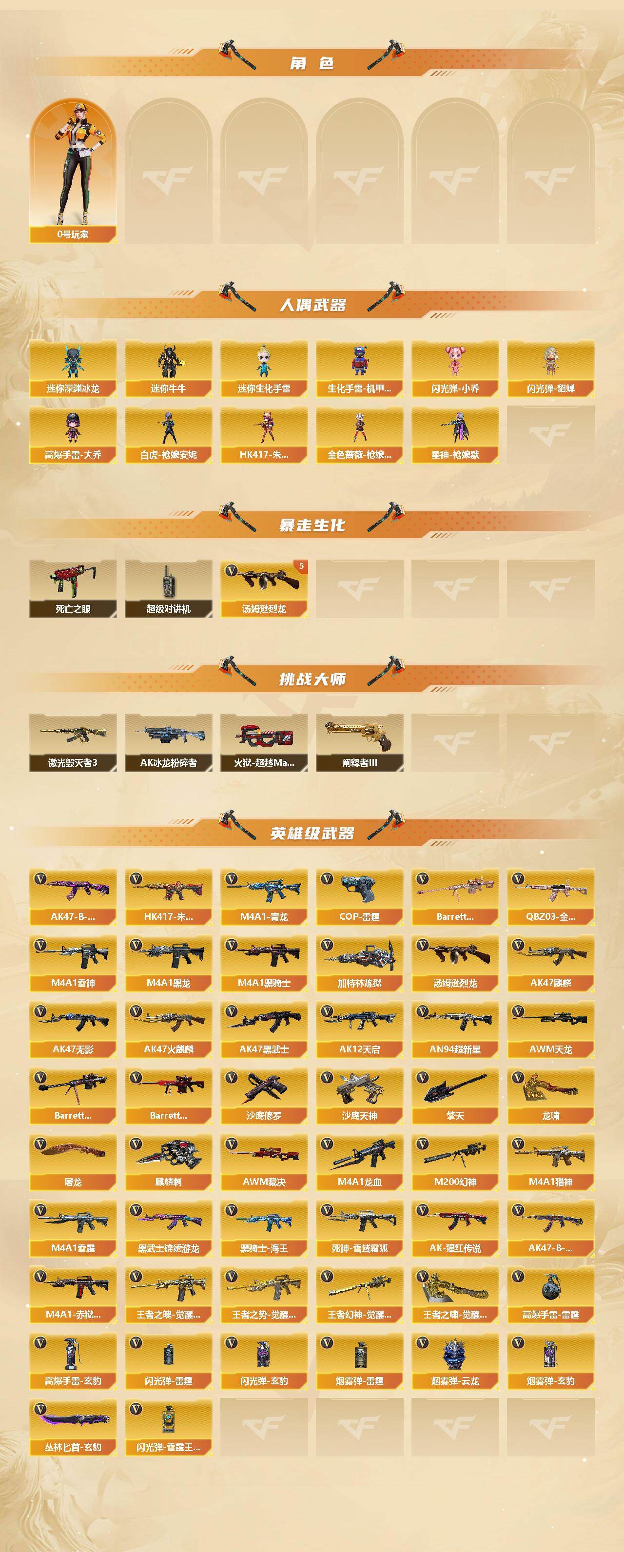 【英雄级武器】:AK47-火麒麟,AK47-麒麟,M4A1-黑龙,M4A1-雷神*2,M4A1-黑骑士*2,AK47-无影,AK47-黑武士,AK12-天启,AN94-超新星,M4A1-龙血,M4A1-雷霆,M4A1-青龙,HK417-朱雀,黑武士-锦绣游龙,死神-雪域霜狐,QBZ03-金色蔷薇,M4A1