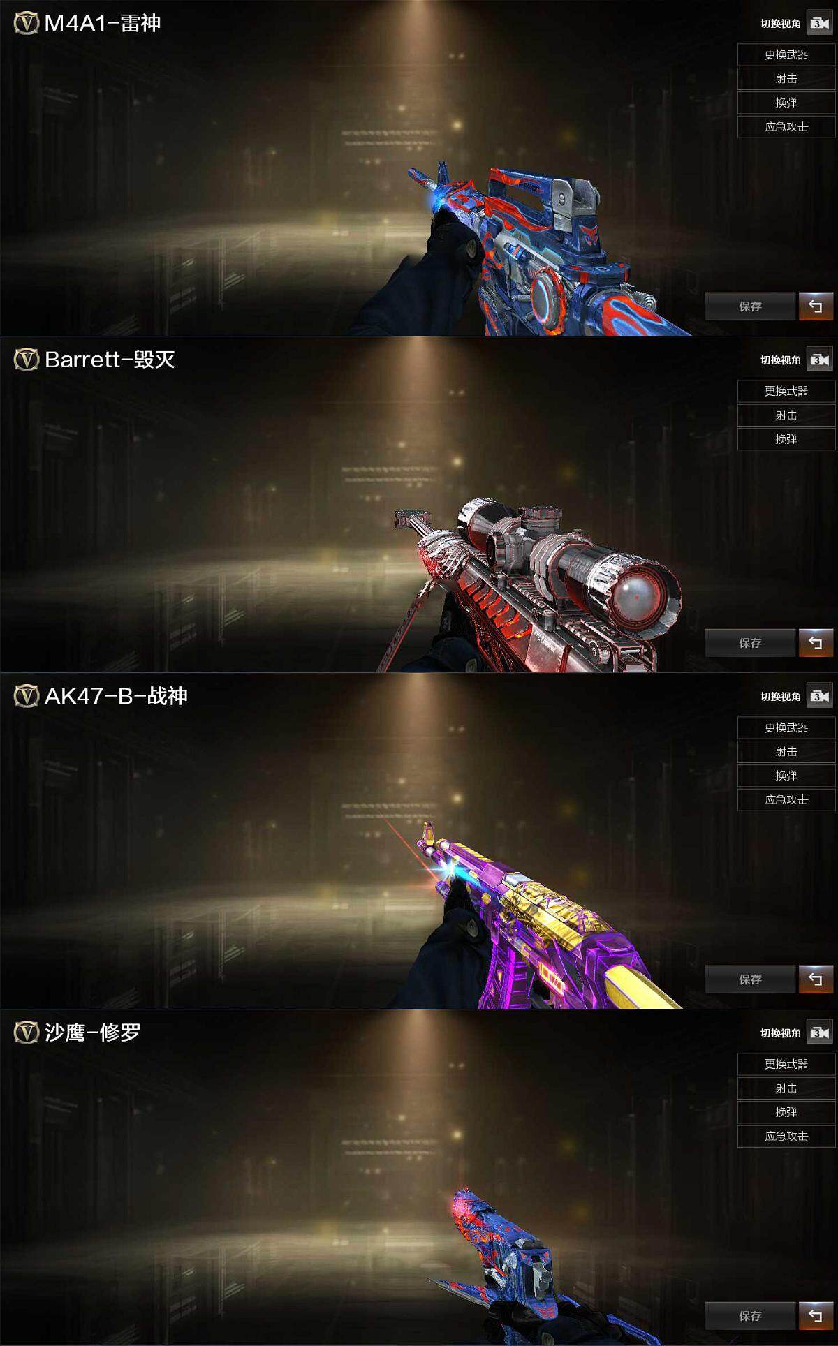 【英雄级武器】:AK47-火麒麟,M4A1-黑龙,M4A1-雷神,M4A1-黑骑士,AK12-天启,AN94-超新星,黑武士-锦绣游龙,QBZ03-金色蔷薇,AK-47-猩红传说*3,Barrett-毁灭,王者之怒-觉醒版,加特林-炼狱,汤姆逊-烈龙*5,AA-12-雷霆,沙鹰-修罗,沙鹰-天神,屠龙,龙啸,擎天,麒麟刺,高爆手雷-雷霆,手雷-云海游龙,闪光弹-雷霆,烟雾弹-雷霆,M4A1-赤狱骑士