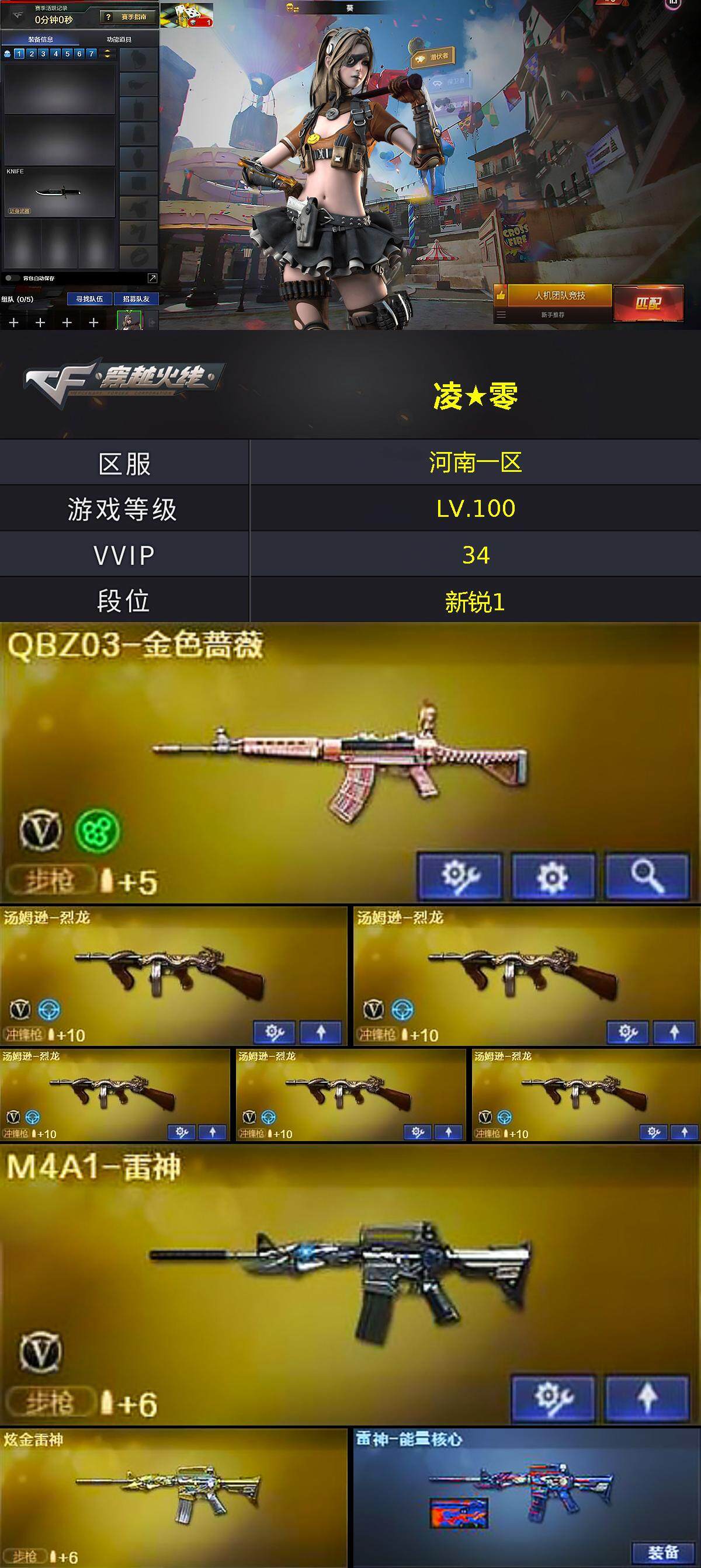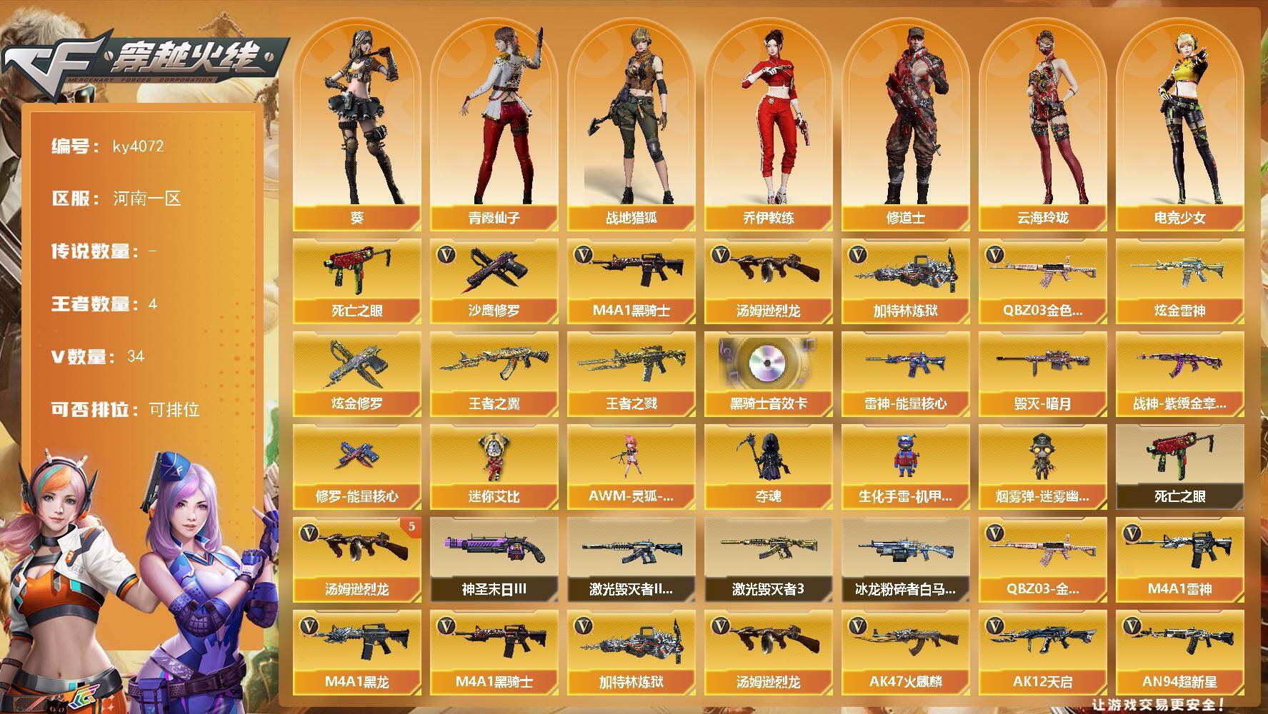 [14448096]河南一区-34V-4王者-2炫金 【热门武器】:QBZ03-金色蔷薇,死亡之眼*3,M4A1-黑骑士,汤姆逊-烈龙*5,加特林-炼狱,沙鹰-修罗 【王者炫金武器】:王者之戮,王者之翼*2,炫金雷神,炫金修罗 【音效卡】:M4A1-黑骑士音效卡 【皮肤】:雷神-能量核心,毁灭-暗月,战神-紫绶金章皮肤,修罗-能量核心 【角色】:葵,战地猎狐,乔伊教练,修道士,云海玲珑,电竞少女,芳心审判者,风暴女,嘉年华灵狐,龙儿,潘多拉-X,青霞仙子,斯沃特-X,维纳斯,影武者-X 【人偶武器】:AWM-灵狐-15周年嘉年华,夺魂,生化手雷-机甲核心*2,迷你艾比,烟雾弹-迷雾幽灵 【暴走生化】:死亡之眼*3 【挑战大师】:冰龙粉碎者-白马银枪,激光毁灭者III-白马银枪,激光毁灭者III,神圣爆裂者-末日III 【英雄级武器】:AK47-火麒麟,M4A1-黑龙,M4A1-雷神,M4A1-黑骑士,AK12-天启,AN94-超新星,黑武士-锦绣游龙,QBZ03-金色蔷薇,AK-47-猩红传说*3,Barrett-毁灭,王者之怒-觉醒版,加特林-炼狱,汤姆逊-烈龙*5,AA-12-雷霆,沙鹰-修罗,沙鹰-天神,屠龙,龙啸,擎天,麒麟刺,高爆手雷-雷霆,手雷-云海游龙,闪光弹-雷霆,烟雾弹-雷霆,M4A1-赤狱骑士 【道具】:CFS限定背包,战舰背包,炫彩背包,背包-洛丽塔,超级背包,女皇终结者-魔龙之吻,救世主-黑桃战神,黄金生化钩,绿色巨人,灵魂忍者*2,迷雾幽灵,夺命之镰,防化服*3,金色流光-枪王排位*2,星辰流光-枪王排位,流光-鎏金之域,枪王排位28赛季金色流光,枪王排位29赛季金色流光,EP战队名片,EP战队喷图,防弹头盔*7,防弹衣*6,C4工具钳*4,手雷包*8 【特殊枪械】:1黑骑士,5烈龙,1炼狱