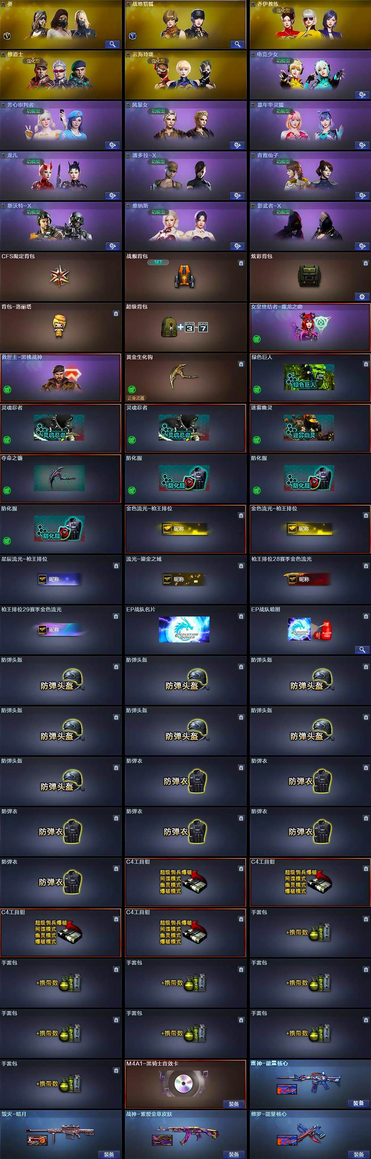 【道具】:CFS限定背包,战舰背包,炫彩背包,背包-洛丽塔,超级背包,女皇终结者-魔龙之吻,救世主-黑桃战神,黄金生化钩,绿色巨人,灵魂忍者*2,迷雾幽灵,夺命之镰,防化服*3,金色流光-枪王排位*2,星辰流光-枪王排位,流光-鎏金之域,枪王排位28赛季金色流光,枪王排位29赛季金色流光,EP战队名片,EP战队喷图,防弹头盔*7,防弹衣*6,C4工具钳*4,手雷包*8