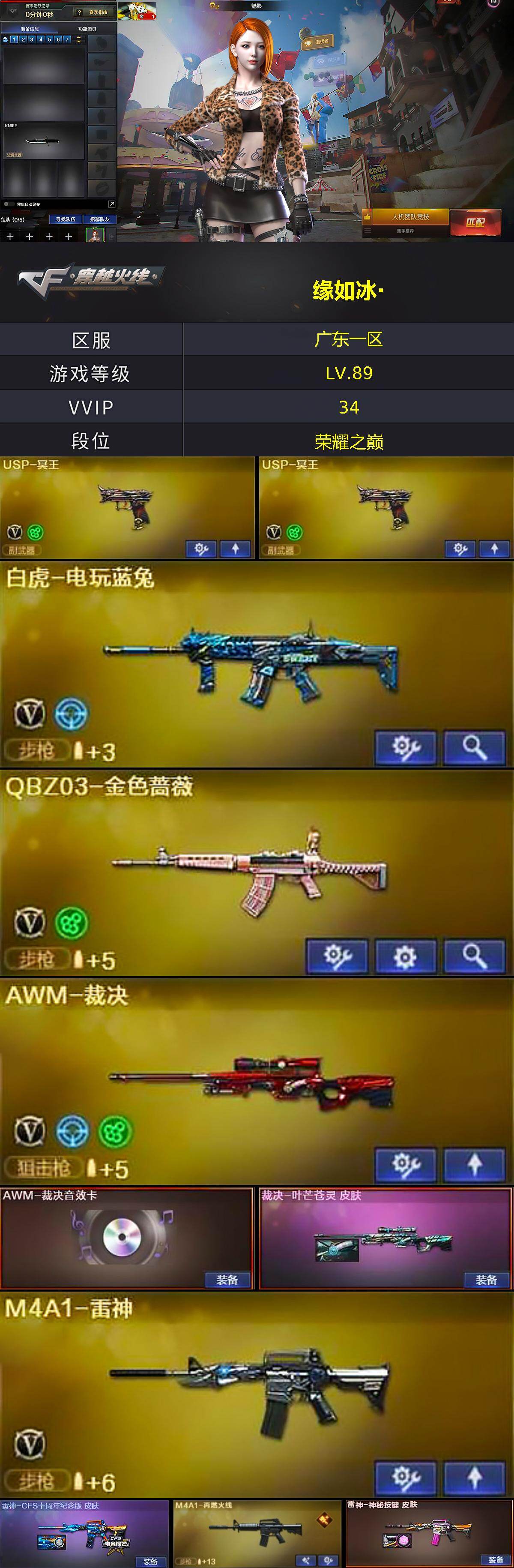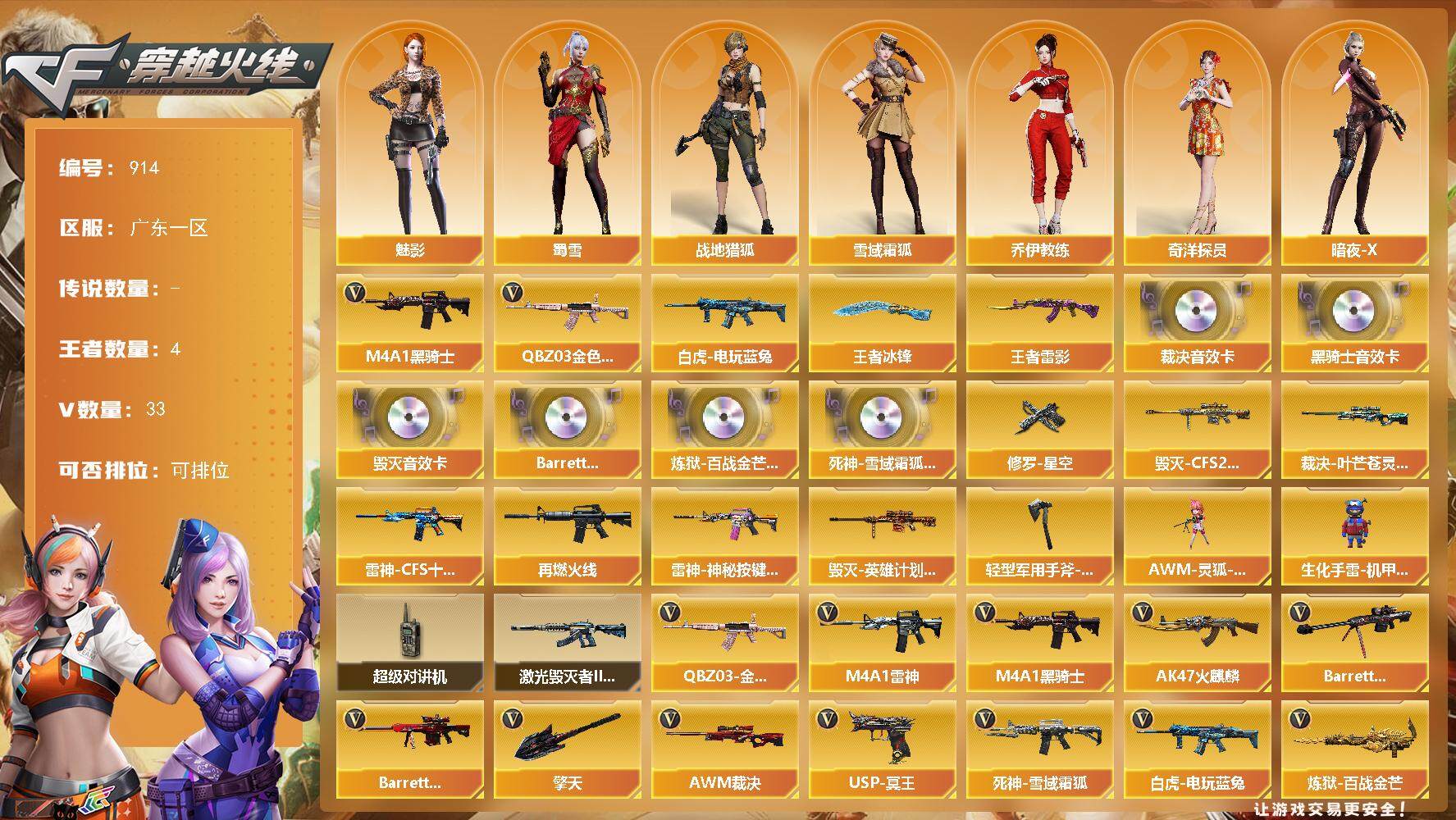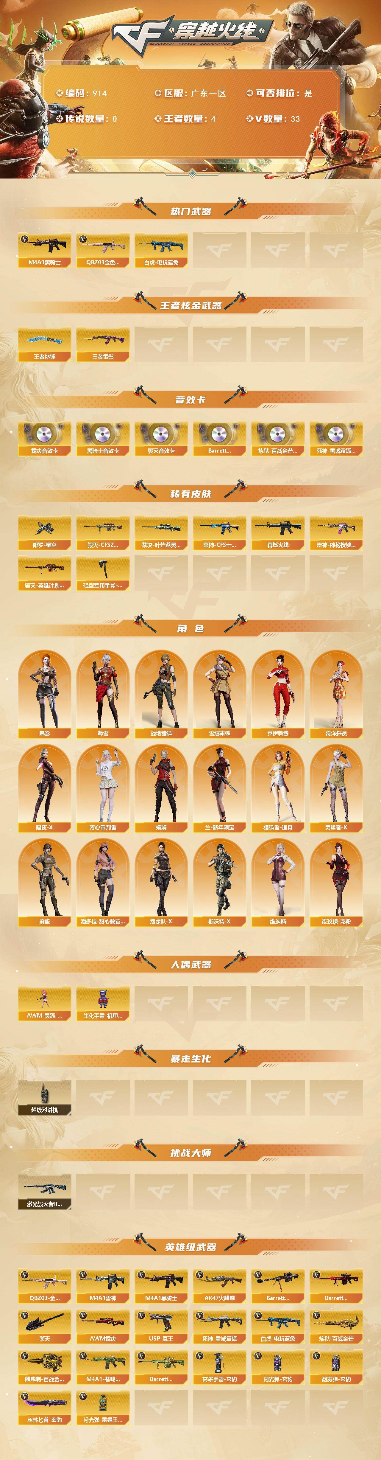 [14448425]广东一区-33V-4王者-0炫金 【热门武器】:QBZ03-金色蔷薇,白虎-电玩蓝兔,M4A1-黑骑士 【王者炫金武器】:王者雷影,王者冰锋 【音效卡】:M4A1-黑骑士音效卡,Barrett-毁灭音效卡,AWM-裁决音效卡,Barrett-碧霄极光音效卡,炼狱-百战金芒-庆典舞曲音效卡,死神-雪域霜狐-怀旧音效卡 【皮肤】:裁决-叶芒苍灵 皮肤,雷神-CFS十周年纪念版 皮肤,M4A1-再燃火线,雷神-神秘按键 皮肤,毁灭-CFS2020,毁灭-英雄计划 皮肤,修罗-星空,轻型军用手斧-再燃火线 【角色】:魅影,战地猎狐,雪域霜狐,奇洋探员,乔伊教练,暗夜-X,芳心审判者,娟娟,兰-新年限定,猎狐者-追月,灵狐者-X,麻雀,潘多拉-甜心教官,潜龙队-X,斯沃特-X,蜀雪,维纳斯,夜玫瑰-宠粉 【人偶武器】:AWM-灵狐-15周年嘉年华*2,生化手雷-机甲核心 【暴走生化】:超级对讲机 【挑战大师】:激光毁灭者III-白马银枪 【英雄级武器】:AK47-火麒麟,M4A1-雷神,M4A1-黑骑士,死神-雪域霜狐,QBZ03-金色蔷薇,白虎-电玩蓝兔,Barrett-毁灭,Barrett-极光,AWM-裁决,炼狱-百战金芒,USP-冥王*2,擎天,麒麟刺-百战金芒,丛林匕首-玄豹,高爆手雷-玄豹*2,闪光弹-玄豹*3,闪光弹-雷霆王者-觉醒版,烟雾弹-玄豹*3,M4A1-苍鸣雷神,Barrett-碧霄极光 【道具】:BS战队炫彩背包,CFS限定背包,云山科技背包,亚洲杯纪念炫彩背包,冰冰企鹅背包-猛男专用,炫彩背包-诺拉,百战金芒炫彩背包,老虎背包,背包-洛丽塔,迷你冰龙背包,雪域霜狐炫彩背包,女皇终结者-魔龙之吻,救世主-黑桃战神,绿色巨人,灵魂忍者,迷雾幽灵,夺命之镰,防化服*3,流光-鎏金之域,枪王排位28赛季金色流光,语音特效-盛典烟火,语音特效-怀旧,雪域霜狐表情,萌萌小葵表情,电玩兔兔表情,EP战队名片,EP战队喷图,C4-黑曜,C4-沙漠,防弹头盔*4,防弹衣*4,C4工具钳*4,手雷包*4 【特殊枪械】:1黑骑士
