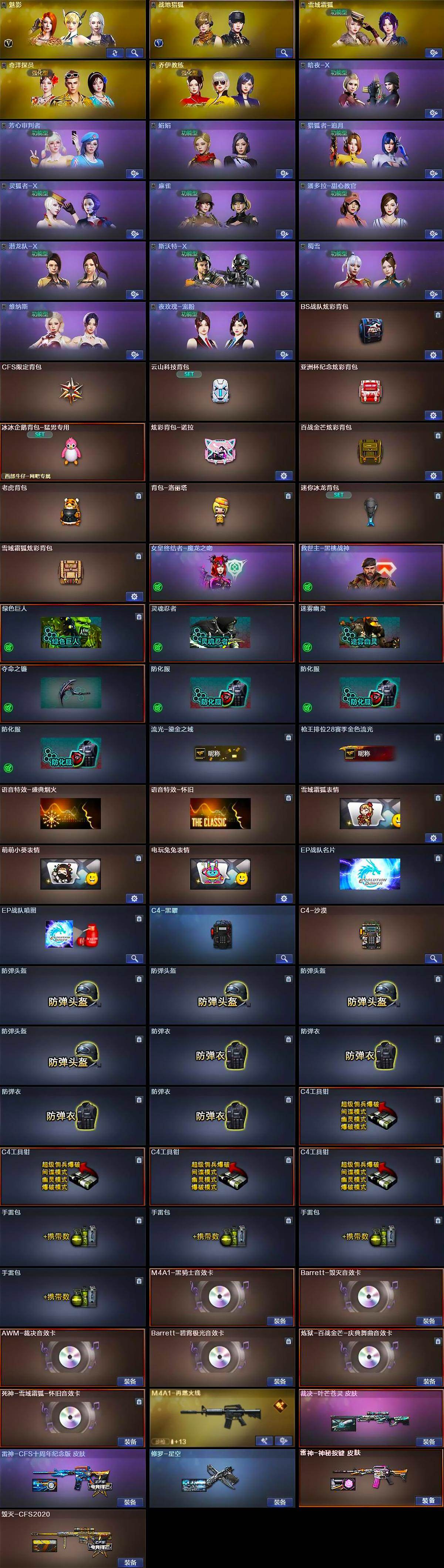 【道具】:BS战队炫彩背包,CFS限定背包,云山科技背包,亚洲杯纪念炫彩背包,冰冰企鹅背包-猛男专用,炫彩背包-诺拉,百战金芒炫彩背包,老虎背包,背包-洛丽塔,迷你冰龙背包,雪域霜狐炫彩背包,女皇终结者-魔龙之吻,救世主-黑桃战神,绿色巨人,灵魂忍者,迷雾幽灵,夺命之镰,防化服*3,流光-鎏金之域,枪王排位28赛季金色流光,语音特效-盛典烟火,语音特效-怀旧,雪域霜狐表情,萌萌小葵表情,电玩兔兔表情,EP战队名片,EP战队喷图,C4-黑曜,C4-沙漠,防弹头盔*4,防弹衣*4,C4工具钳*4,手雷包*4