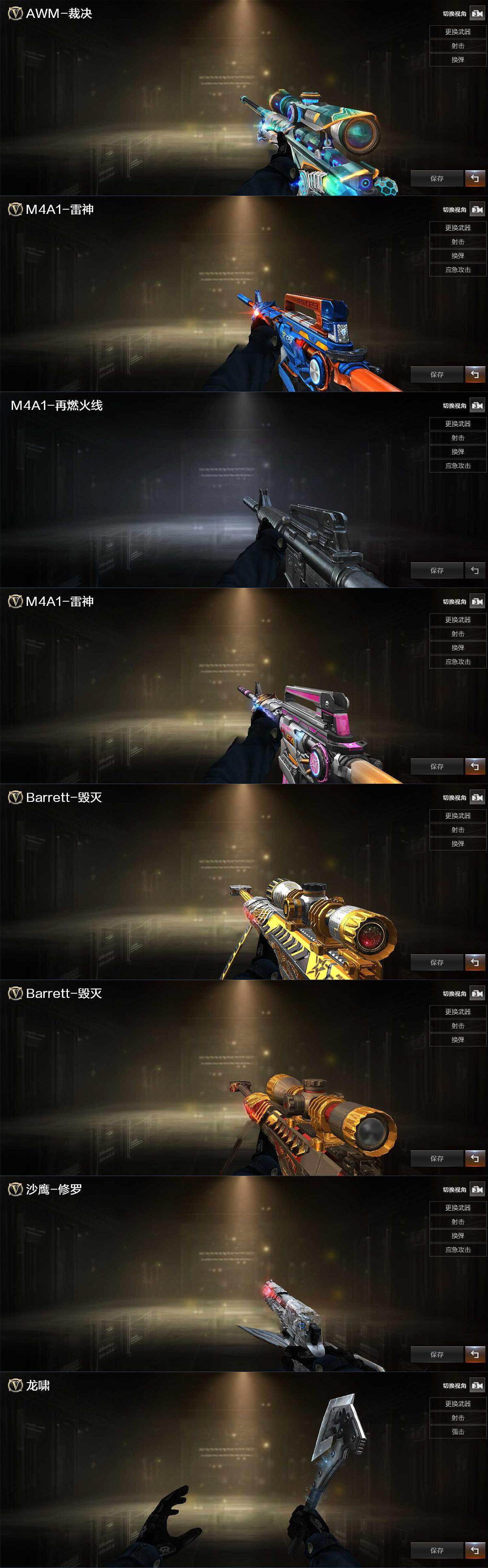 【音效卡】:M4A1-黑骑士音效卡,Barrett-毁灭音效卡,AWM-裁决音效卡,Barrett-碧霄极光音效卡,炼狱-百战金芒-庆典舞曲音效卡,死神-雪域霜狐-怀旧音效卡
