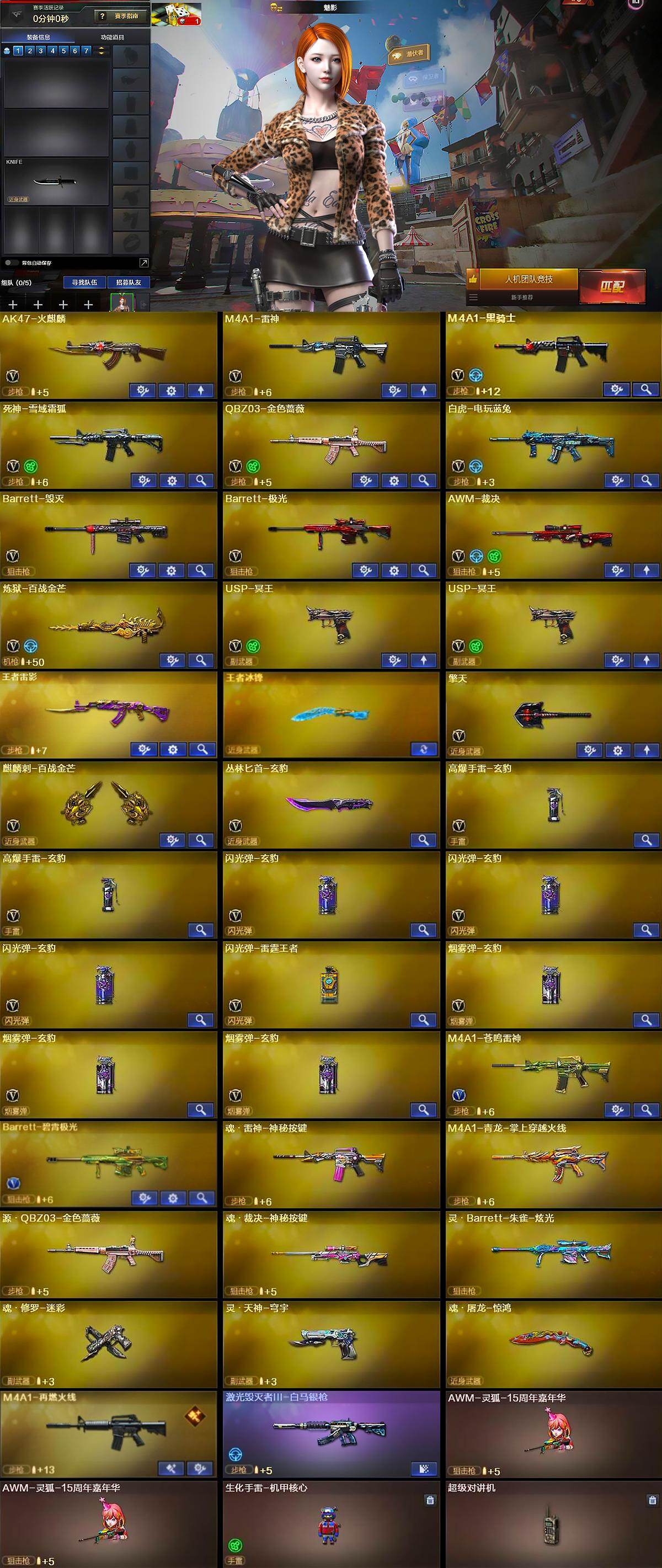【英雄级武器】:AK47-火麒麟,M4A1-雷神,M4A1-黑骑士,死神-雪域霜狐,QBZ03-金色蔷薇,白虎-电玩蓝兔,Barrett-毁灭,Barrett-极光,AWM-裁决,炼狱-百战金芒,USP-冥王*2,擎天,麒麟刺-百战金芒,丛林匕首-玄豹,高爆手雷-玄豹*2,闪光弹-玄豹*3,闪光弹-雷霆王者-觉醒版,烟雾弹-玄豹*3,M4A1-苍鸣雷神,Barrett-碧霄极光