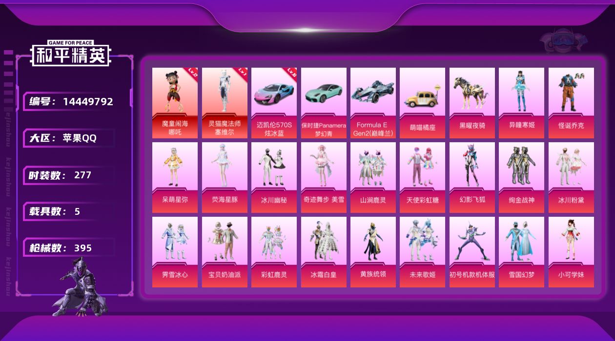[14449792]苹果 手Q-无敌战神框-2神装-38粉装-23特效枪-5载具-8粉色飞行器-147248热力值-17王牌印记-277套装-395枪皮
