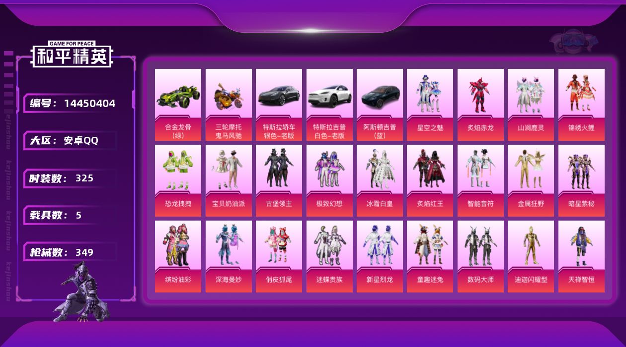 [14450404]安卓 手Q-22粉装-4特效枪-5载具-8粉色飞行器-132569热力值-9王牌印记-325套装-349枪皮