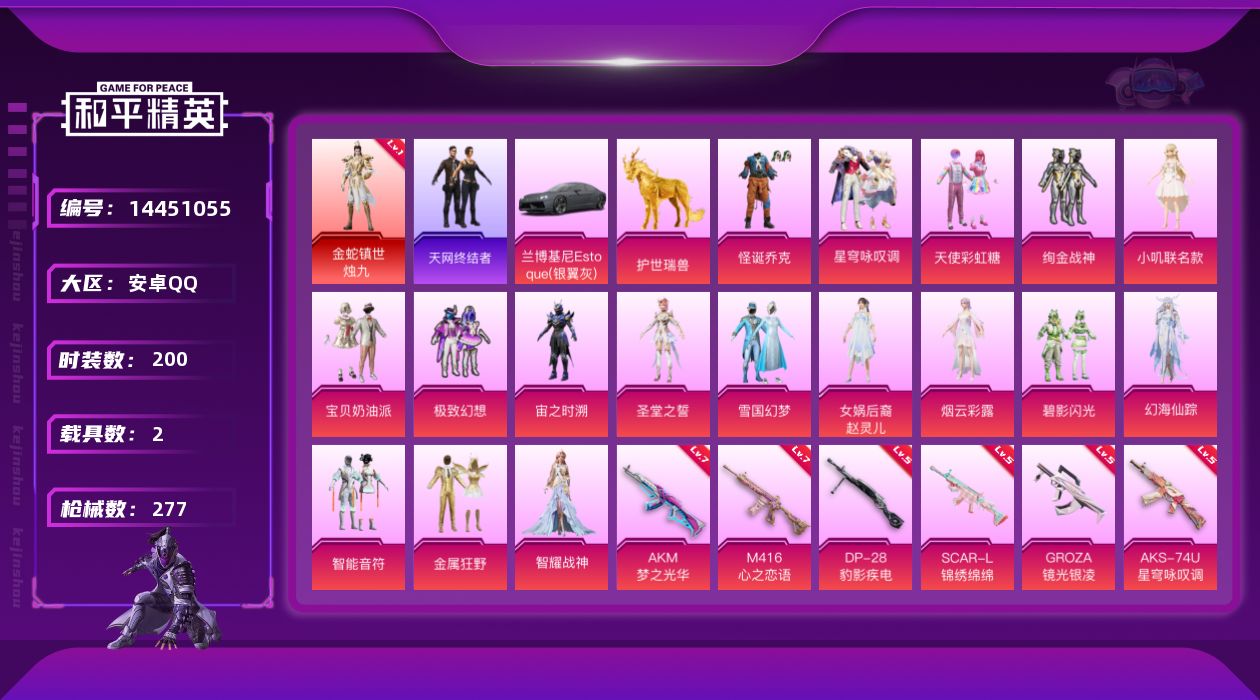 [14451055]安卓 手Q-无敌战神框-1神装-17粉装-8特效枪-2载具-7粉色飞行器-93866热力值-19王牌印记-200套装-277枪皮