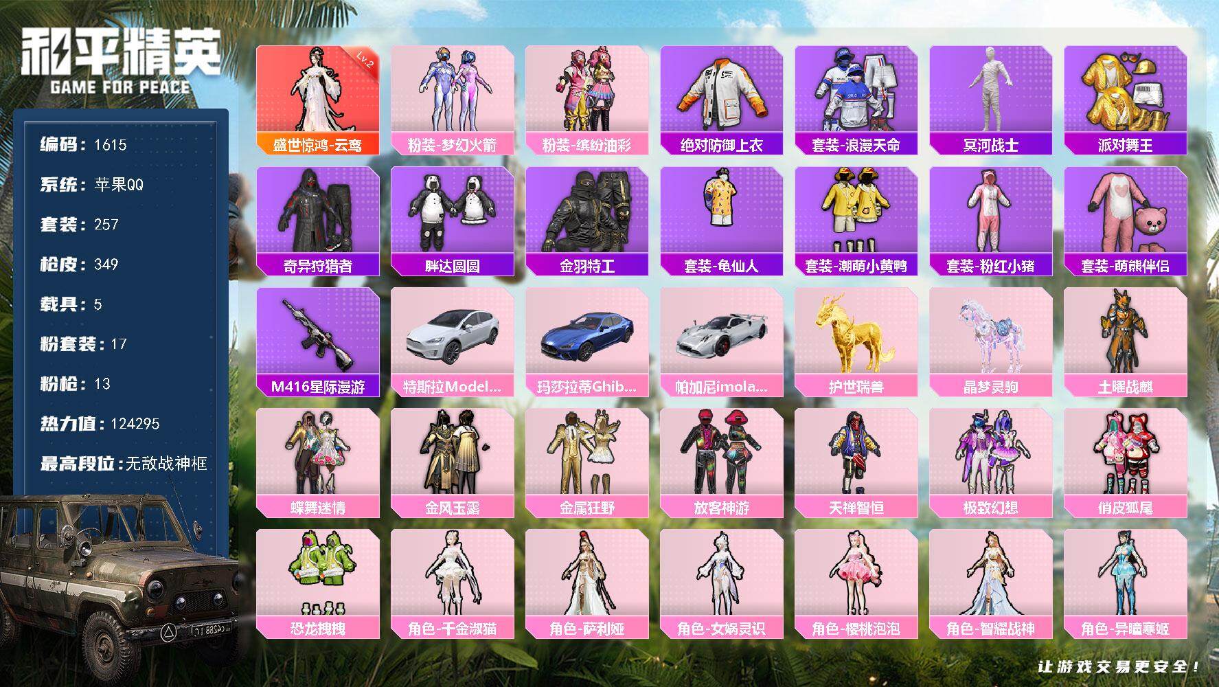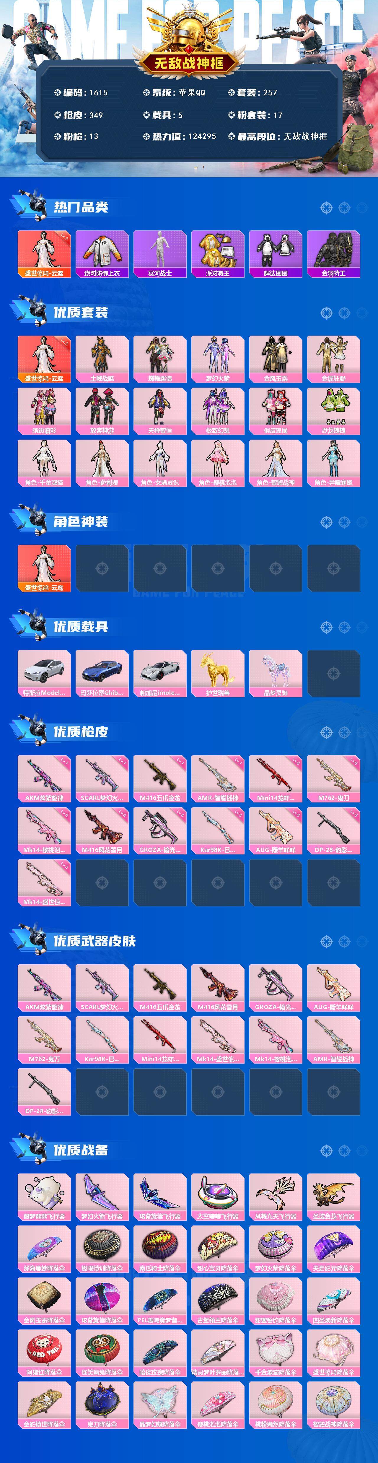 [14451326]苹果 手Q-无敌战神框-1神装-17粉装-13特效枪-5载具-7粉色飞行器-124295热力值-32王牌印记-257套装-349枪皮