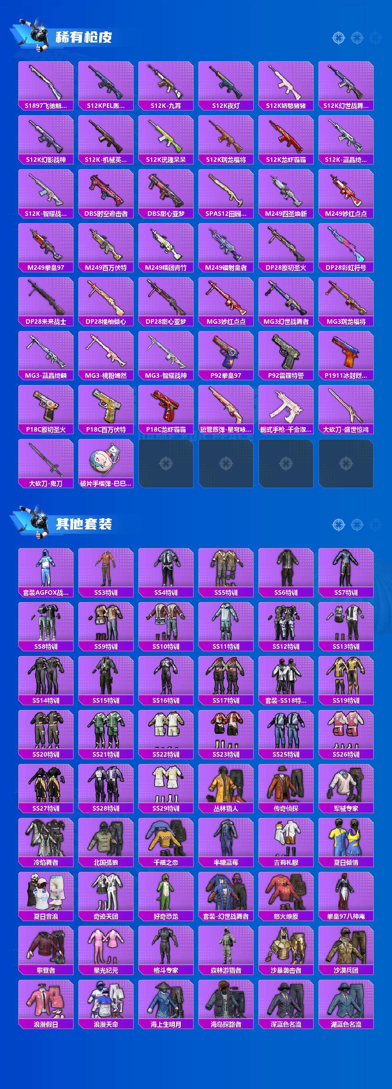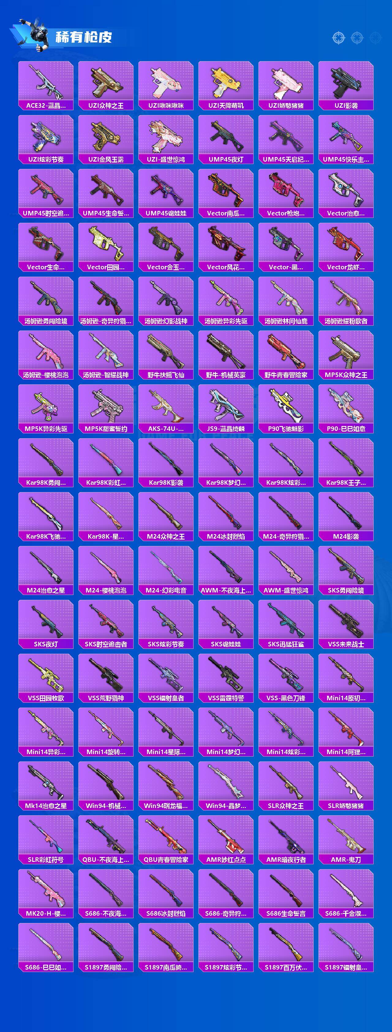 AKM-炫紫旋律,SCAR-L-梦幻火箭,M416-五爪金龙,M416-风花雪月,GROZA-镜光银凌,AUG-暖羊咩咩,M762-鬼刀,Kar98K-巳巳如意,Mini14-龙虾霸霸,Mk14-盛世惊鸿,Mk14-樱桃泡泡
