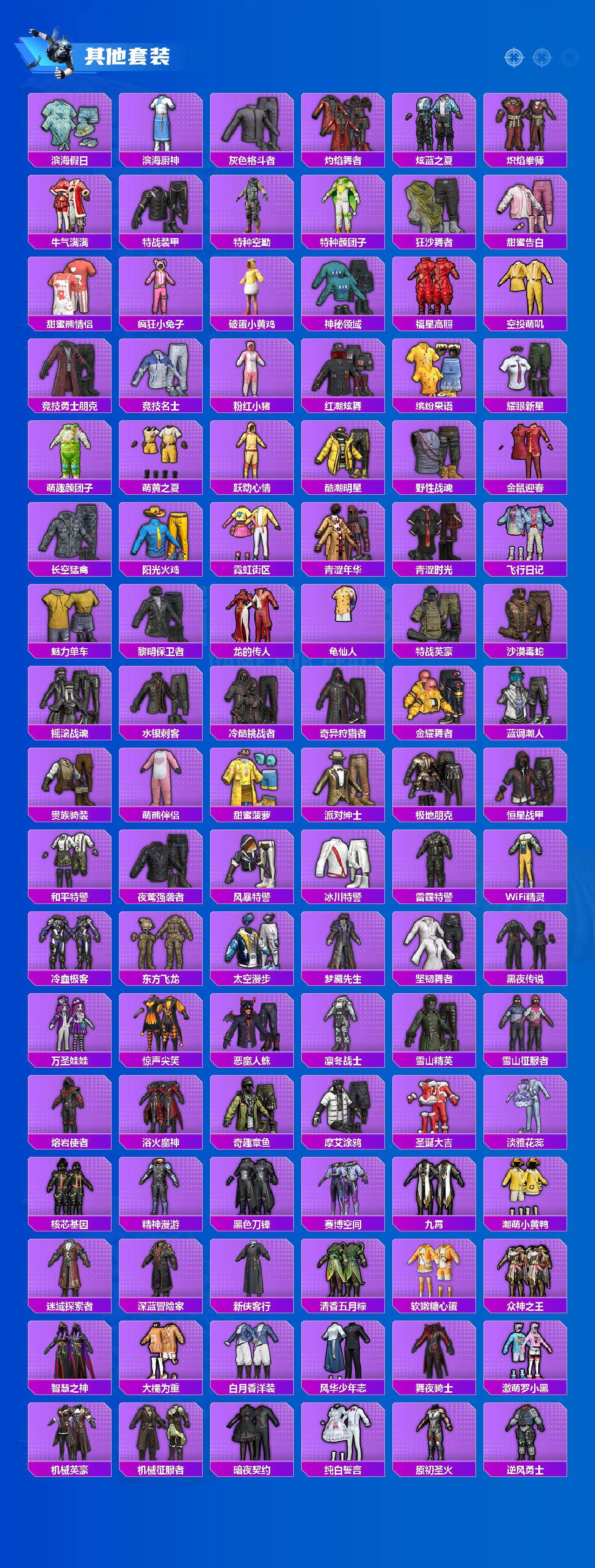 套装-浪漫天命,套装-金羽特工,套装-龟仙人,套装-粉红小猪,套装-狂沙舞者,套装-破蛋小黄鸡,套装-水银刺客,套装-恶魔人蛛,套装-雪山精英,套装-黑色刀锋,赛博空间套装,套装-九霄,新侠客行套装,套装-软嫩糖心蛋,白月香洋装套装,风华少年志套装,套装-机械英豪,套装-暗夜契约,套装-纯白誓言,粉甜马卡龙套装,套装-韶华初心,套装-梦之呓语,套装-冰爽海盐,套装-瑞龙福将,套装-团圆交子