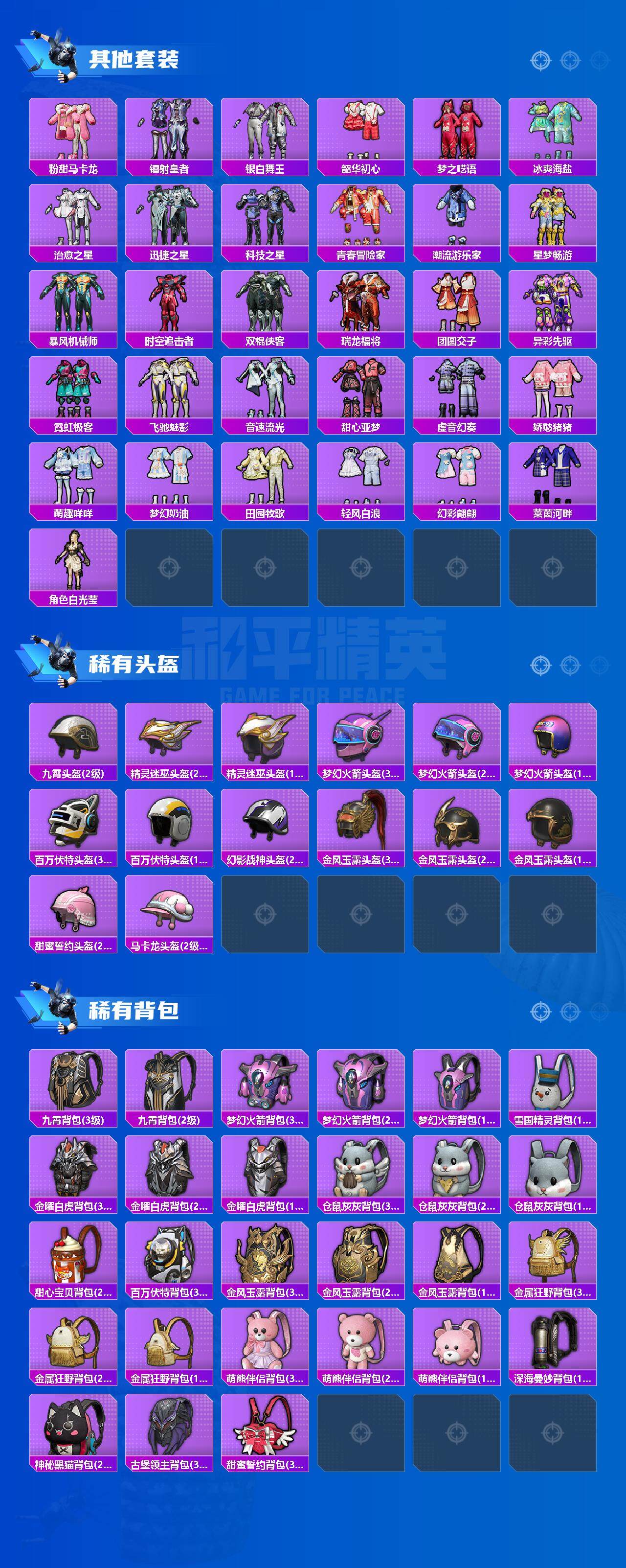 [14451326]苹果 手Q-无敌战神框-1神装-17粉装-13特效枪-5载具-7粉色飞行器-124295热力值-32王牌印记-257套装-349枪皮 【红色神装等级】:盛世惊鸿-云鸾(二级) 【红色角色神装】:盛世惊鸿-云鸾 【热门品类】:粉装-梦幻火箭,粉装-缤纷油彩,绝对防御上衣,套装-浪漫天命,套装-冥河战士,套装-派对舞王,套装-奇异狩猎者,套装-胖达圆圆,套装-金羽特工,套装-龟仙人,套装-潮萌小黄鸭,套装-粉红小猪,套装-萌熊伴侣,M416-星际漫游 【粉色载具】:特斯拉Model X(珍珠白),玛莎拉蒂Ghibli(蓝),帕加尼imola(艺术银),护世瑞兽,晶梦灵驹 【粉色套装】:粉装-土曜战麒,粉装-蝶舞迷情,粉装-梦幻火箭,粉装-金风玉露,粉装-金属狂野,粉装-缤纷油彩,粉装-放客神游,粉装-天禅智恒,粉装-极致幻想,粉装-俏皮狐尾,粉装-恐龙拽拽,角色-千金淑猫,角色-萨利娅,角色-女娲灵识,角色-樱桃泡泡,角色-智耀战神,角色-异瞳寒姬 【粉色枪皮等级】:AKM-炫紫旋律(七级),SCAR-L-梦幻火箭(七级),M416-五爪金龙(七级),M416-风花雪月(五级),GROZA-镜光银凌(五级),AUG-暖羊咩咩(五级),M762-鬼刀(六级),Kar98K-巳巳如意(五级),Mini14-龙虾霸霸(六级),Mk14-盛世惊鸿(三级),Mk14-樱桃泡泡(六级),AMR-智耀战神(七级),DP-28-豹影疾电(五级) 【粉色枪皮】:AKM-炫紫旋律,SCAR-L-梦幻火箭,M416-五爪金龙,M416-风花雪月,GROZA-镜光银凌,AUG-暖羊咩咩,M762-鬼刀,Kar98K-巳巳如意,Mini14-龙虾霸霸,Mk14-盛世惊鸿,Mk14-樱桃泡泡,AMR-智耀战神,DP-28-豹影疾电 【粉色飞行器】:酣梦熊熊飞行器,梦幻火箭飞行器,炫紫旋律飞行器,太空嘟嘟飞行器,凤舞九天飞行器,圣域金龙飞行器 【粉色降落伞】:深海曼妙降落伞,极限特训降落伞,南瓜骑士降落伞,甜心宝贝降落伞,梦幻火箭降落伞,天启纪元降落伞,金风玉露降落伞,炫紫旋律降落伞,PEL轰鸣竞梦者降落伞,古堡领主降落伞,甜蜜誓约降落伞,四圣焕新降落伞,阿狸红降落伞,怪笑疯兔降落伞,暗夜玫瑰降落伞,精灵梦叶罗丽降落伞,千金淑猫降落伞,盛世惊鸿降落伞,金蛇镇世降落伞,鬼刀降落伞,晶梦幻蝶降落伞,樱