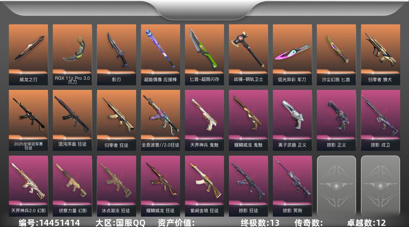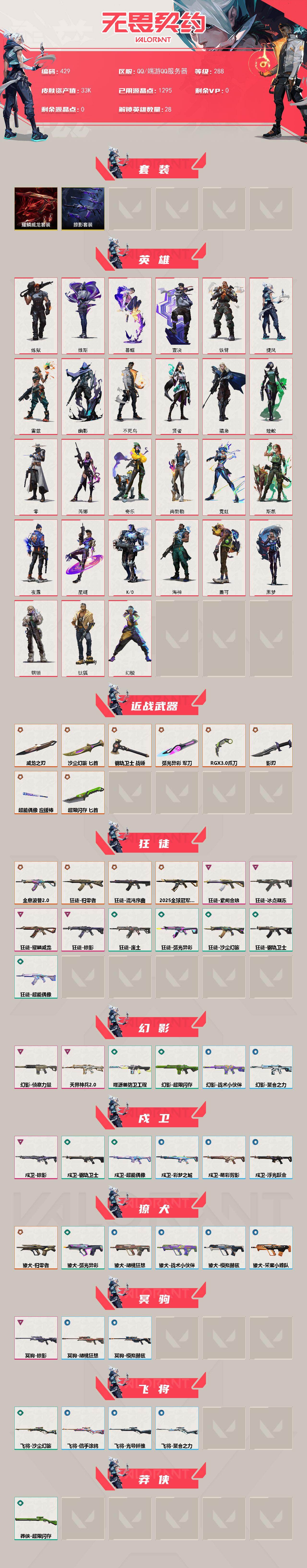 [14451414]【套装】:掠影套装,耀鳞威龙套装 【英雄】:幻棱,炼狱,维斯,暮蝶,钛狐,壹决,铁臂,捷风,雷兹,幽影,不死鸟,贤者,猎枭,蝰蛇,零,芮娜,奇乐,尚勃勒,霓虹,斯凯,夜露,星礈,K/O,海神,盖可,黑梦,钢锁 【近战 武器】:近战武器-RGX 11z Pro//3.0 爪刀,近战武器-威龙之刃,近战武器-超能偶像 应援棒,近战武器-超限闪存 匕首,近战武器-钢轨卫士 战锤,近战武器-弧光异彩 军刀,近战武器-沙尘幻旅 匕首,近战武器-影刃 【狂徒】:狂徒-2025全球冠军赛,狂徒-归零者,狂徒-混沌序曲,狂徒-全息波普//2.0,狂徒-冰点凝冻,狂徒-掠影,狂徒-耀鳞威龙,狂徒-紫阙金琅,狂徒-超能偶像,狂徒-废土,狂徒-钢轨卫士,狂徒-弧光异彩,狂徒-沙尘幻旅 【幻影】:幻影-天界神兵//2.0,幻影-侦察力量,幻影-超限闪存,幻影-噬源兽防卫工程,幻影-聚合之力,幻影-战术小伙伴 【戍卫】:戍卫-掠影,戍卫-超能偶像,戍卫-钢轨卫士,戍卫-彩梦之城,戍卫-浮光跃金,戍卫-萌彩剪影 【獠犬】:獠犬-归零者,獠犬-弧光异彩,獠犬-采蜜小蜂队,獠犬-胡桃狂想,獠犬-模拟赫兹,獠犬-战术小伙伴 【冥驹】:冥驹-掠影,冥驹-胡桃狂想,冥驹-模拟赫兹 【飞将】:飞将-沙尘幻旅,飞将-聚合之力,飞将-信手涂鸦,飞将-光导纤维 【莽侠】:莽侠-超限闪存 【战神】:战神-采蜜小蜂队,战神-浮光跃金,战神-萌彩剪影 【奥丁】:奥丁-信手涂鸦,奥丁-战术小伙伴 【判官】:判官-超能偶像,判官-采蜜小蜂队,判官-萌彩剪影 【雄鹿】:雄鹿-彩梦之城,雄鹿-模拟赫兹 【骇灵】:骇灵-沙尘幻旅,骇灵-浮光跃金,骇灵-光导纤维,骇灵-信手涂鸦 【蜂刺】:蜂刺-超限闪存,蜂刺-弧光异彩,蜂刺-胡桃狂想,蜂刺-聚合之力,蜂刺-战术小伙伴 【标配】:标配-超能偶像,标配-彩梦之城,标配-浮光跃金,标配-光导纤维 【正义】:正义-掠影,正义-离子武器,正义-超限闪存,正义-沙尘幻旅,正义-复古浪潮,正义-天涯浪客 【鬼魅】:鬼魅-天界神兵,鬼魅-耀鳞威龙,鬼魅-流星兵团,鬼魅-采蜜小蜂队,鬼魅-光导纤维,鬼魅-胡桃狂想,鬼魅-模拟赫兹,鬼魅-信手涂鸦 【狂怒】:狂怒-钢轨卫士,狂怒-聚合之力,狂怒-萌彩剪影 【短炮】:短炮-钢轨卫士,短炮-弧光异彩 【卡面】:《双城之战》拥抱 卡面,精灵大战 卡面,