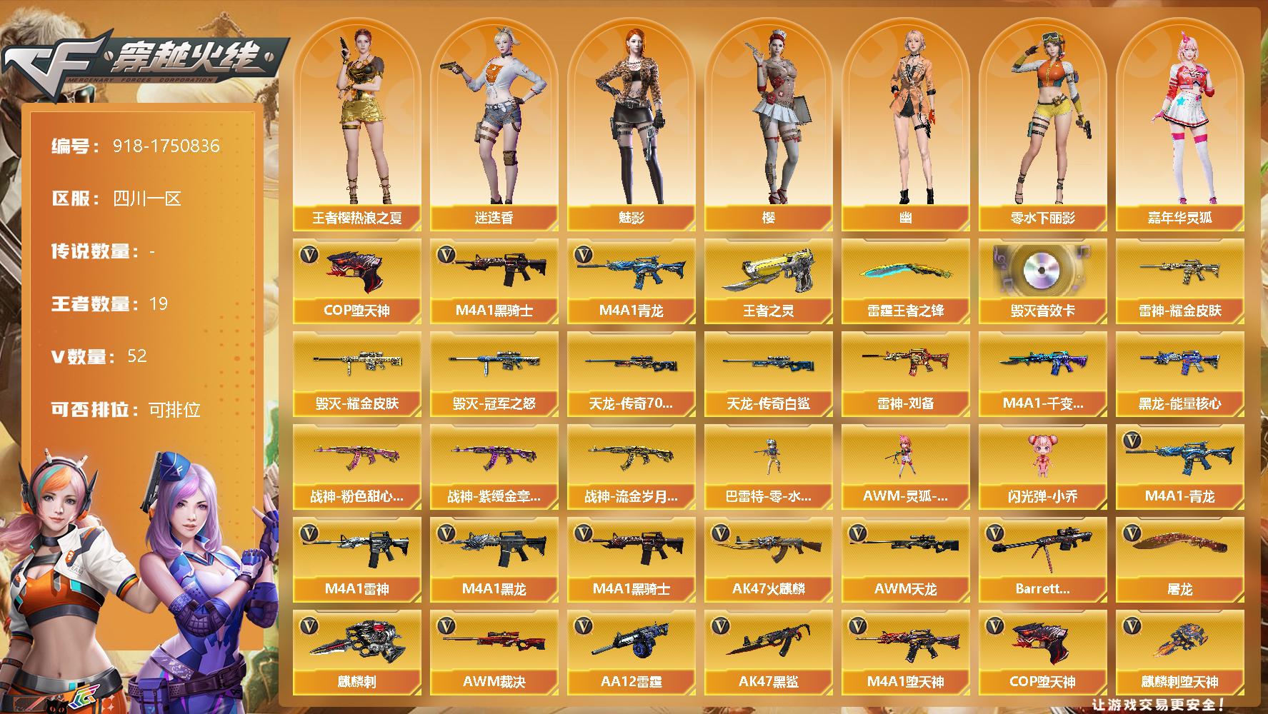 [14469546]四川一区-52V-19王者-0炫金 【热门武器】:M4A1-青龙,M4A1-黑骑士,COP-堕天神 【王者炫金武器】:王者之灵*2,雷霆王者之锋 【音效卡】:Barrett-毁灭音效卡 【皮肤】:雷神-耀金皮肤,雷神-刘备 皮肤,毁灭耀金皮肤,毁灭-冠军之怒,M4A1-千变-孔明皮肤,黑龙-能量核心,战神-粉色甜心皮肤*3,战神-紫绶金章皮肤*7,战神-流金岁月皮肤*3,AWM-天龙-传奇70KG,AWM-天龙-传奇白鲨 【角色】:樱,魅影,迷迭香,王者樱-热浪之夏,嘉年华灵狐,兰-海滩派对,零-水下丽影,影武者-X,幽 【人偶武器】:巴雷特-零-水下丽影,AWM-灵狐-15周年嘉年华,闪光弹-小乔 【英雄级武器】:AK47-火麒麟,M4A1-黑龙,M4A1-雷神,M4A1-黑骑士,AK47-黑鲨,M4A1-青龙,M4A1-堕天神,王者之魄-觉醒版,AK-47-猩红传说*9,AK47-B-战神,M4A1-雷霆王者-觉醒版,AWM-天龙,Barrett-毁灭*4,AWM-裁决,Barrett-雷霆王者-觉醒版,AA-12-雷霆,COP-堕天神,COP 357-雷霆王者-觉醒版*2,屠龙,麒麟刺-堕天神,麒麟刺,龙啸-堕天神,高爆手雷-堕天神*6,闪光弹-堕天神*6,闪光弹-雷霆王者-觉醒版*2,烟雾弹-堕天神*6,烟雾弹-雷霆王者-觉醒版 【道具】:KZ战队炫彩背包,超级背包,绿色巨人,灵魂忍者,迷雾幽灵,夺命之镰,防化服*2,金色流光-枪王排位,防弹头盔*4,防弹衣*3,C4工具钳*3,手雷包*3 【特殊枪械】:1黑骑士