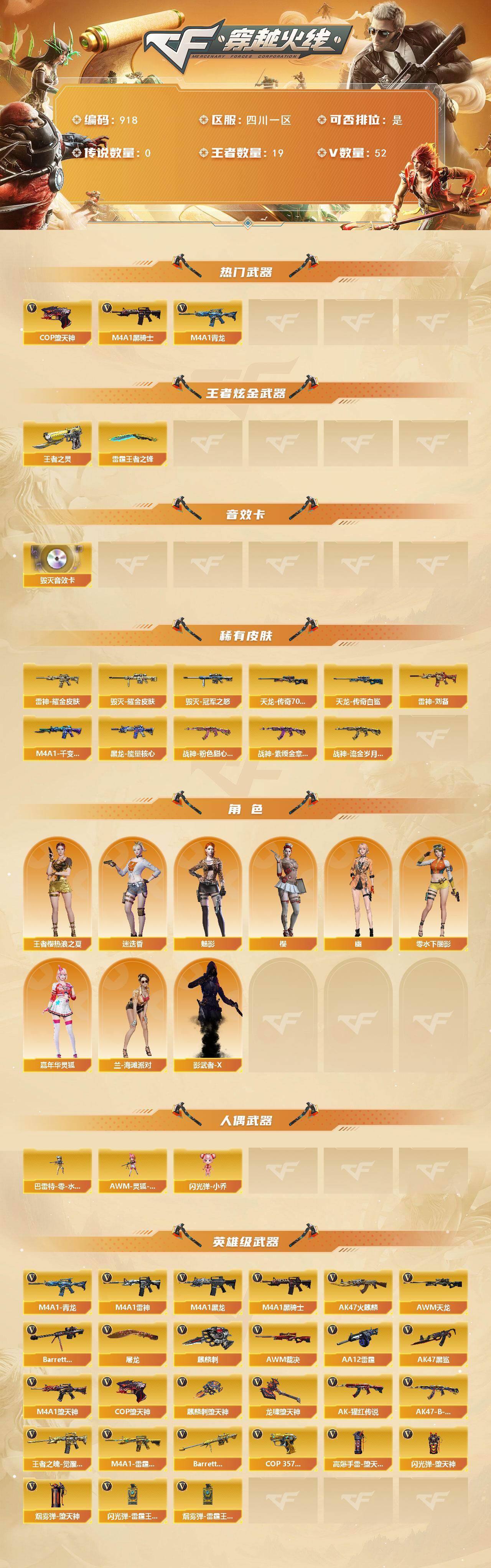 [14469543]四川一区-52V-19王者-0炫金 【热门武器】:M4A1-青龙,M4A1-黑骑士,COP-堕天神 【王者炫金武器】:王者之灵*2,雷霆王者之锋 【音效卡】:Barrett-毁灭音效卡 【皮肤】:雷神-耀金皮肤,雷神-刘备 皮肤,毁灭耀金皮肤,毁灭-冠军之怒,M4A1-千变-孔明皮肤,黑龙-能量核心,战神-粉色甜心皮肤*3,战神-紫绶金章皮肤*7,战神-流金岁月皮肤*3,AWM-天龙-传奇70KG,AWM-天龙-传奇白鲨 【角色】:樱,魅影,迷迭香,王者樱-热浪之夏,嘉年华灵狐,兰-海滩派对,零-水下丽影,影武者-X,幽 【人偶武器】:巴雷特-零-水下丽影,AWM-灵狐-15周年嘉年华,闪光弹-小乔 【英雄级武器】:AK47-火麒麟,M4A1-黑龙,M4A1-雷神,M4A1-黑骑士,AK47-黑鲨,M4A1-青龙,M4A1-堕天神,王者之魄-觉醒版,AK-47-猩红传说*9,AK47-B-战神,M4A1-雷霆王者-觉醒版,AWM-天龙,Barrett-毁灭*4,AWM-裁决,Barrett-雷霆王者-觉醒版,AA-12-雷霆,COP-堕天神,COP 357-雷霆王者-觉醒版*2,屠龙,麒麟刺-堕天神,麒麟刺,龙啸-堕天神,高爆手雷-堕天神*6,闪光弹-堕天神*6,闪光弹-雷霆王者-觉醒版*2,烟雾弹-堕天神*6,烟雾弹-雷霆王者-觉醒版 【道具】:KZ战队炫彩背包,超级背包,绿色巨人,灵魂忍者,迷雾幽灵,夺命之镰,防化服*2,金色流光-枪王排位,防弹头盔*4,防弹衣*3,C4工具钳*3,手雷包*3 【特殊枪械】:1黑骑士