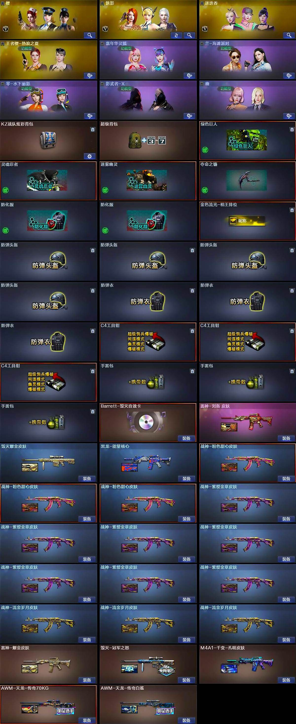【皮肤】:雷神-耀金皮肤,雷神-刘备 皮肤,毁灭耀金皮肤,毁灭-冠军之怒,M4A1-千变-孔明皮肤,黑龙-能量核心,战神-粉色甜心皮肤*3,战神-紫绶金章皮肤*7,战神-流金岁月皮肤*3,AWM-天龙-传奇70KG,AWM-天龙-传奇白鲨