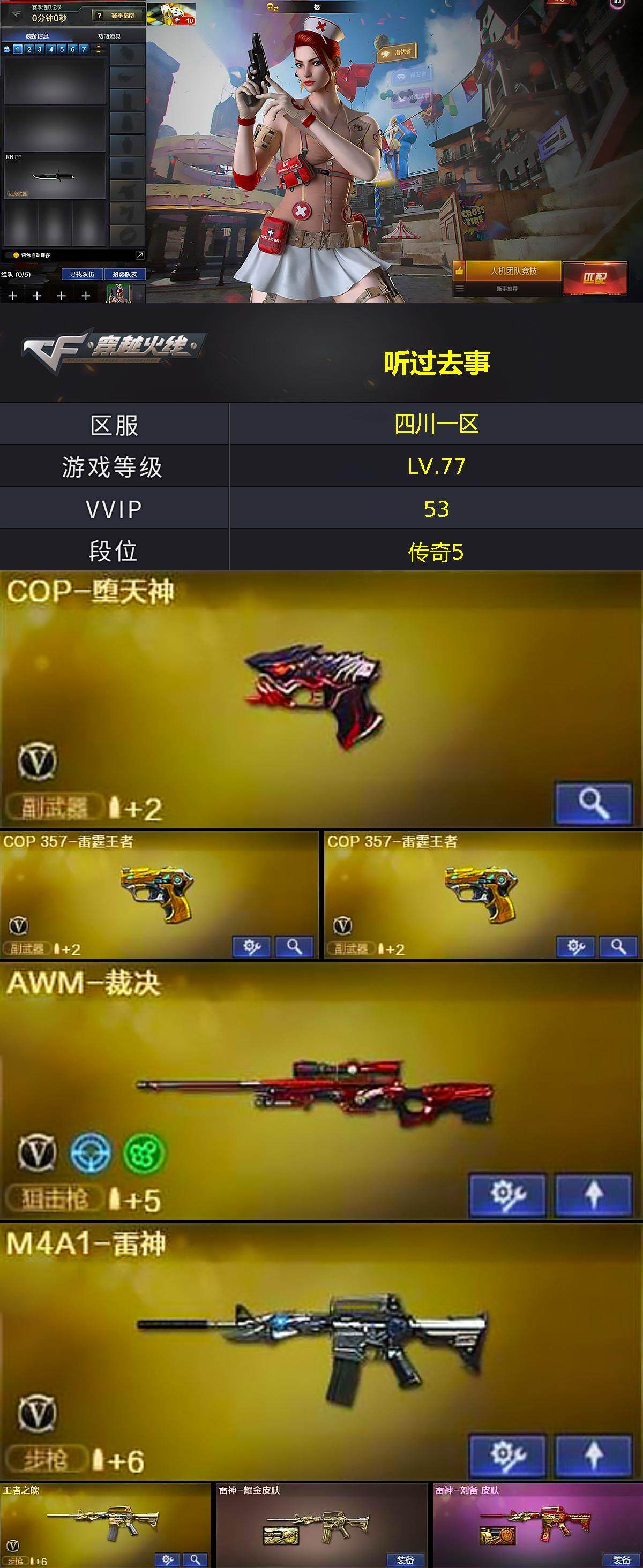 - [12959295]浙江一区-87V-7王者-10炫金 【传说角色】:传说影煞 【热门武器】:QBZ03-金色蔷薇,M4A1-黑骑士,RPK-盘龙,加特林-炼狱,斯泰尔-蝴蝶,USP-雷暴,沙鹰-修罗*8 【王者炫金武器】:炫金骑士,炫金天龙*4,炫金毁灭*3,炫金雷神,炫金武士,超新星-悦享,王者之幻,王者之心 【音效卡】:M4A1-黑骑士音效卡,Barrett-毁灭音效卡 【稀有皮肤】:雷神-能量核心,雷神-荣耀之魄,M4A1-雷神-CFS 2019,M4A1-黑龙-361,毁灭-荣耀之怒,极光-高能霹雳 皮肤,天龙-秘银,屠龙-星火燎原*2 【角色】:传说影煞,零-水下丽影,零,瞳,魅影,春,蜀雪 【人偶武器】:斯泰尔-蝴蝶,AWM-灵狐-15周年嘉年华,COP-旗袍 【暴走生化】:斯泰尔-蝴蝶 【挑战大师】:神圣爆裂者III,阐释者III,激光毁灭者III-白马银枪 【英雄级武器】:AK47-雷暴*2,USP-雷暴,斩神刀-雷暴,M4A1-武圣*4,QBZ03-金色蔷薇,M4A1-雷神*4,M4A1-黑龙*2,M4A1-玫瑰精灵,M4A1-黑骑士,M4A1-死神*2,RPK-盘龙,加特林-炼狱,AK47-火麒麟*2,AK47-黑武士*2,AWM-天龙,Barrett-毁灭*3,Barrett-极光,AWM-裁决,M4A1-龙血,AK47-机械迷城,AA-12-雷霆,AK47-黑鲨,M4A1-千变*2,黑武士-锦绣游龙,沙鹰-天神*2,沙鹰-修罗*8,麒麟刺*3,擎天*2,龙啸,屠龙*4 【特殊枪械】:蝴蝶斯泰尔+0烈龙,1黑骑士,1盘龙,1炼狱,1蝴蝶斯泰尔