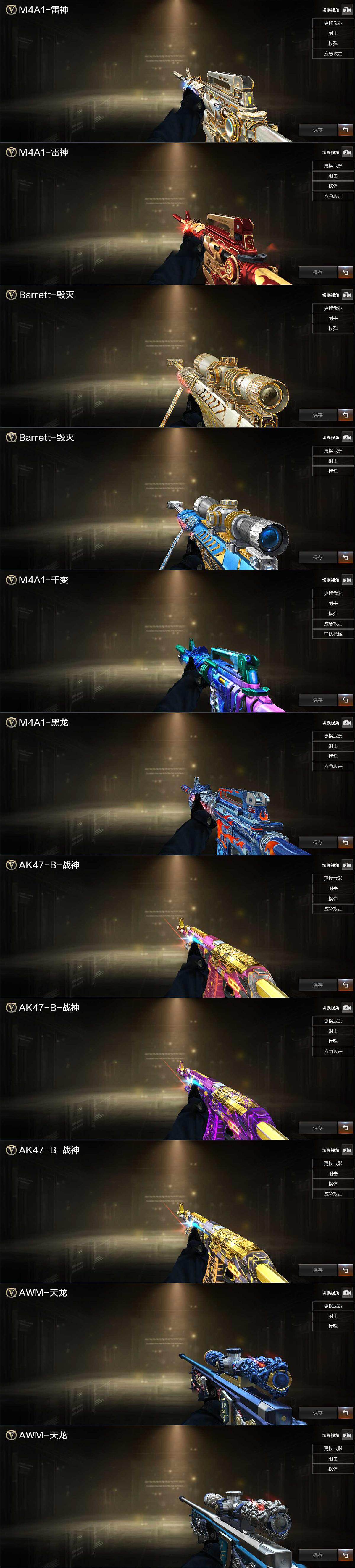 【英雄级武器】:AK47-火麒麟,M4A1-黑龙,M4A1-雷神,M4A1-黑骑士,AK47-黑鲨,M4A1-青龙,M4A1-堕天神,王者之魄-觉醒版,AK-47-猩红传说*9,AK47-B-战神,M4A1-雷霆王者-觉醒版,AWM-天龙,Barrett-毁灭*4,AWM-裁决,Barrett-雷霆王者-觉醒版,AA-12-雷霆,COP-堕天神,COP 357-雷霆王者-觉醒版*2,屠龙,麒麟刺-堕天神,麒麟刺,龙啸-堕天神,高爆手雷-堕天神*6,闪光弹-堕天神*6,闪光弹-雷霆王者-觉醒版*2,烟雾弹-堕天神*6,烟雾弹-雷霆王者-觉醒版