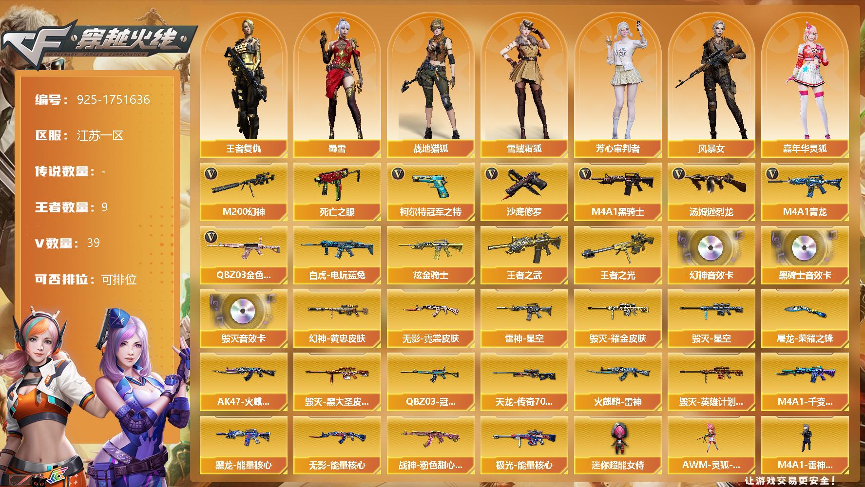 [14469706]江苏一区-39V-9王者-1炫金 【热门武器】:QBZ03-金色蔷薇*3,M4A1-青龙,M200-幻神,死亡之眼,白虎-电玩蓝兔,柯尔特-冠军之特,M4A1-黑骑士,汤姆逊-烈龙,沙鹰-修罗 【王者炫金武器】:王者之武*2,王者之光,炫金骑士 【音效卡】:M200-幻神音效卡,M4A1-黑骑士音效卡,Barrett-毁灭音效卡 【皮肤】:M200-幻神-黄忠皮肤,QBZ03-冠军之薇,雷神-星空,火麒麟-雷神,AK47-火麒麟-传奇EVEN,毁灭耀金皮肤,毁灭-星空,毁灭-黑大圣皮肤,毁灭-英雄计划 皮肤,M4A1-千变-孔明皮肤,黑龙-能量核心,无影-能量核心,无影-霓裳皮肤,战神-粉色甜心皮肤,AWM-天龙-传奇70KG,极光-能量核心,屠龙-荣耀之锋 【角色】:战地猎狐,王者复仇,雪域霜狐,芳心审判者,风暴女,嘉年华灵狐,卡塔琳娜,灵狐者-七夕宝贝,龙儿-小淘气,麻雀,曼陀罗-X,曼陀罗-礼服,潘多拉-X,潘多拉-甜心教官,潜龙队-X,蛇姬,蜀雪,兔囡囡,影武者-X 【人偶武器】:M4A1-雷神-精英刀锋,AWM-灵狐-15周年嘉年华,迷你波特博士,迷你牛牛,闪光弹-小乔,迷你超能女侍 【暴走生化】:死亡之眼 【挑战大师】:冰龙粉碎者-白马银枪 【英雄级武器】:AK47-火麒麟,M4A1-黑龙,M4A1-雷神,M4A1-黑骑士,AK47-无影*2,AK47-机械迷城,AK47-黑鲨*2,M4A1-龙血,M4A1-青龙,无影-神兵利器,M4A1-玫瑰精灵,QBZ03-金色蔷薇*3,王者之心-觉醒版,王者之势-觉醒版,AK-47-猩红传说,AK47-B-战神,白虎-电玩蓝兔,AWM-天龙,Barrett-毁灭,Barrett-极光,AWM-裁决*2,M200-幻神,Barrett-朱雀,王者之光-觉醒版,汤姆逊-烈龙,AA-12-雷霆,沙鹰-修罗,柯尔特-冠军之特,王者之魂-觉醒版,屠龙,擎天,高爆手雷-古蛇迷踪,闪光弹-雷霆,烟雾弹-雷霆,烟雾弹-古蛇迷踪 【道具】:云山科技背包,亚洲杯纪念炫彩背包,战舰背包,炫彩背包,超级背包,救世主-黑桃战神,黄金生化钩,绿色巨人,灵魂忍者,迷雾幽灵,夺命之镰,防化服*2,金色流光-枪王排位*2,星辰流光-枪王排位,流光-再燃火线,枪王排位29赛季金色流光,电玩兔兔表情,动感闪耀表情,防弹头盔*2,防弹衣*3,C4工具钳