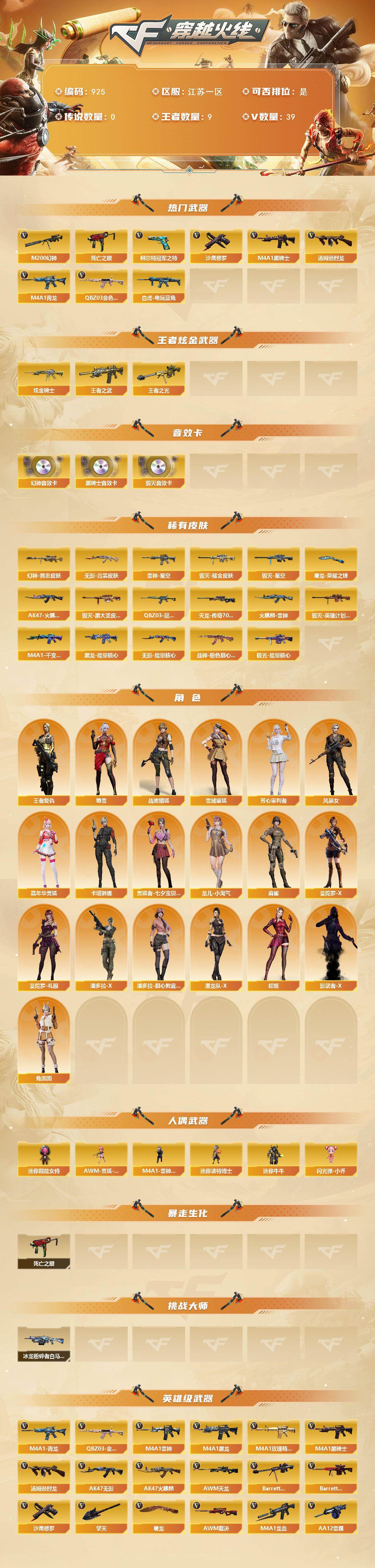 [14469703]江苏一区-39V-9王者-1炫金 【热门武器】:QBZ03-金色蔷薇*3,M4A1-青龙,M200-幻神,死亡之眼,白虎-电玩蓝兔,柯尔特-冠军之特,M4A1-黑骑士,汤姆逊-烈龙,沙鹰-修罗 【王者炫金武器】:王者之武*2,王者之光,炫金骑士 【音效卡】:M200-幻神音效卡,M4A1-黑骑士音效卡,Barrett-毁灭音效卡 【皮肤】:M200-幻神-黄忠皮肤,QBZ03-冠军之薇,雷神-星空,火麒麟-雷神,AK47-火麒麟-传奇EVEN,毁灭耀金皮肤,毁灭-星空,毁灭-黑大圣皮肤,毁灭-英雄计划 皮肤,M4A1-千变-孔明皮肤,黑龙-能量核心,无影-能量核心,无影-霓裳皮肤,战神-粉色甜心皮肤,AWM-天龙-传奇70KG,极光-能量核心,屠龙-荣耀之锋 【角色】:战地猎狐,王者复仇,雪域霜狐,芳心审判者,风暴女,嘉年华灵狐,卡塔琳娜,灵狐者-七夕宝贝,龙儿-小淘气,麻雀,曼陀罗-X,曼陀罗-礼服,潘多拉-X,潘多拉-甜心教官,潜龙队-X,蛇姬,蜀雪,兔囡囡,影武者-X 【人偶武器】:M4A1-雷神-精英刀锋,AWM-灵狐-15周年嘉年华,迷你波特博士,迷你牛牛,闪光弹-小乔,迷你超能女侍 【暴走生化】:死亡之眼 【挑战大师】:冰龙粉碎者-白马银枪 【英雄级武器】:AK47-火麒麟,M4A1-黑龙,M4A1-雷神,M4A1-黑骑士,AK47-无影*2,AK47-机械迷城,AK47-黑鲨*2,M4A1-龙血,M4A1-青龙,无影-神兵利器,M4A1-玫瑰精灵,QBZ03-金色蔷薇*3,王者之心-觉醒版,王者之势-觉醒版,AK-47-猩红传说,AK47-B-战神,白虎-电玩蓝兔,AWM-天龙,Barrett-毁灭,Barrett-极光,AWM-裁决*2,M200-幻神,Barrett-朱雀,王者之光-觉醒版,汤姆逊-烈龙,AA-12-雷霆,沙鹰-修罗,柯尔特-冠军之特,王者之魂-觉醒版,屠龙,擎天,高爆手雷-古蛇迷踪,闪光弹-雷霆,烟雾弹-雷霆,烟雾弹-古蛇迷踪 【道具】:云山科技背包,亚洲杯纪念炫彩背包,战舰背包,炫彩背包,超级背包,救世主-黑桃战神,黄金生化钩,绿色巨人,灵魂忍者,迷雾幽灵,夺命之镰,防化服*2,金色流光-枪王排位*2,星辰流光-枪王排位,流光-再燃火线,枪王排位29赛季金色流光,电玩兔兔表情,动感闪耀表情,防弹头盔*2,防弹衣*3,C4工具钳