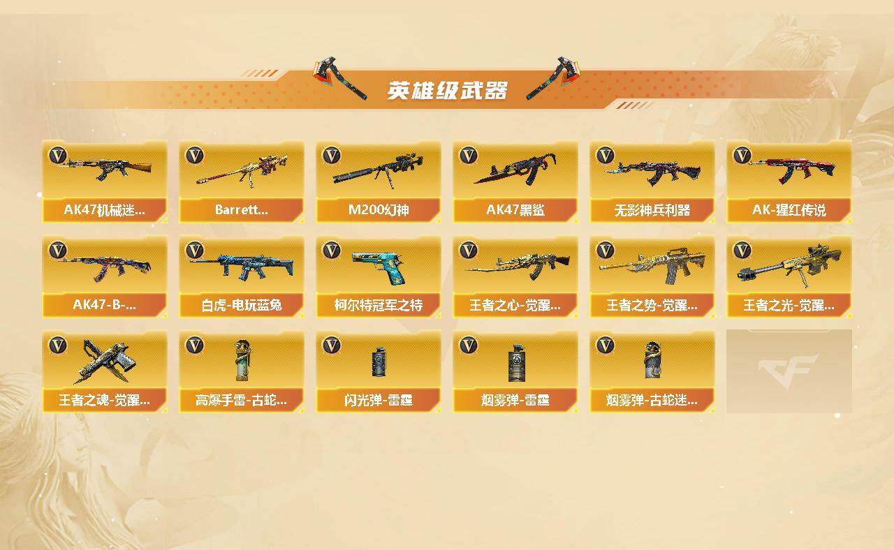 【英雄级武器】:AK47-火麒麟,M4A1-黑龙,M4A1-雷神,M4A1-黑骑士,AK47-无影*2,AK47-机械迷城,AK47-黑鲨*2,M4A1-龙血,M4A1-青龙,无影-神兵利器,M4A1-玫瑰精灵,QBZ03-金色蔷薇*3,王者之心-觉醒版,王者之势-觉醒版,AK-47-猩红传说,AK47-B-战神,白虎-电玩蓝兔,AWM-天龙,Barrett-毁灭,Barrett-极光,AWM-裁决*2,M200-幻神,Barrett-朱雀,王者之光-觉醒版,汤姆逊-烈龙,AA-12-雷霆,沙鹰-修罗,柯尔特-冠军之特,王者之魂-觉醒版,屠龙,擎天,高爆手雷-古蛇迷踪,闪光弹-雷霆,烟雾弹-雷霆,烟雾弹-古蛇迷踪