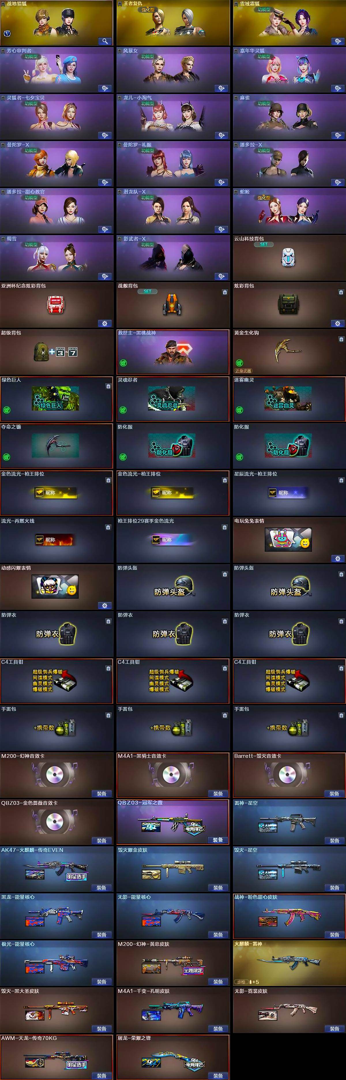 【道具】:云山科技背包,亚洲杯纪念炫彩背包,战舰背包,炫彩背包,超级背包,救世主-黑桃战神,黄金生化钩,绿色巨人,灵魂忍者,迷雾幽灵,夺命之镰,防化服*2,金色流光-枪王排位*2,星辰流光-枪王排位,流光-再燃火线,枪王排位29赛季金色流光,电玩兔兔表情,动感闪耀表情,防弹头盔*2,防弹衣*3,C4工具钳