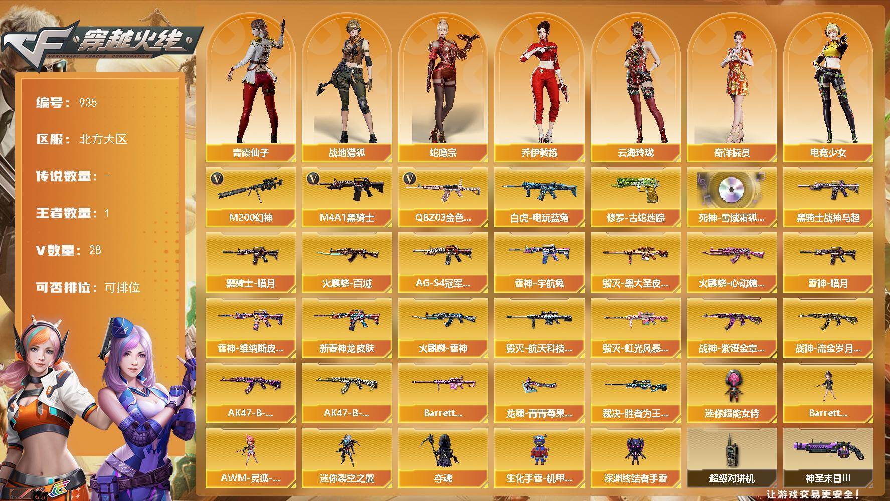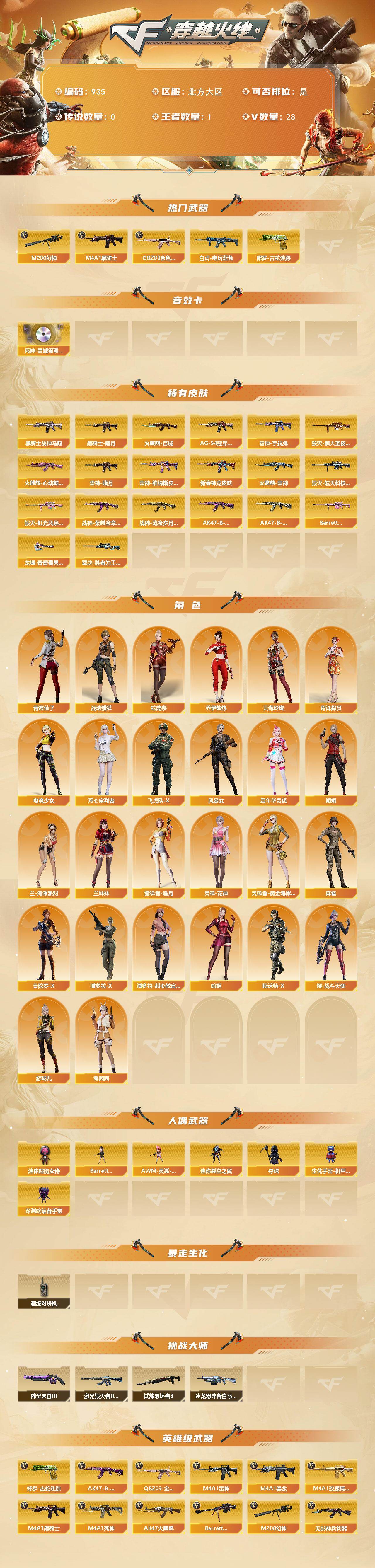 [14471149]北方大区-28V-1王者-0炫金 【热门武器】:QBZ03-金色蔷薇,M200-幻神,修罗-古蛇迷踪,白虎-电玩蓝兔,M4A1-黑骑士 【音效卡】:死神-雪域霜狐-怀旧音效卡 【皮肤】:裁决-胜者为王 皮肤,雷神-暗月,雷神-宇航兔皮肤,雷神-维纳斯皮肤,M4A1-雷神-新春神龙皮肤,火麒麟-雷神,火麒麟-百城,火麒麟-心动糖果,毁灭-黑大圣皮肤,毁灭-航天科技皮肤,毁灭-虹光风暴 皮肤,黑骑士-暗月*2,黑骑士-战神马超,黑骑士-AG-S4冠军典藏,战神-紫绶金章皮肤,战神-流金岁月皮肤,AK47-B-常胜将军-曹操,AK47-B-常胜将军-刘备,Barrett-金色蔷薇-蛇姬 皮肤,龙啸-青青莓果 皮肤 【角色】:战地猎狐,蛇隐宗,奇洋探员,乔伊教练,云海玲珑,电竞少女,芳心审判者,飞虎队-X,风暴女,嘉年华灵狐,娟娟,兰-海滩派对,兰妹妹,猎狐者-追月,灵狐-花神,灵狐者-黄金海岸,麻雀,曼陀罗-X,潘多拉-X,潘多拉-甜心教官,青霞仙子,蛇姬,斯沃特-X,兔囡囡,樱-战斗天使,游珑儿 【人偶武器】:AWM-灵狐-15周年嘉年华,迷你裂空之翼*2,夺魂,生化手雷-机甲核心*2,深渊终结者手雷,Barrett-夜玫瑰,迷你超能女侍 【暴走生化】:超级对讲机 【挑战大师】:冰龙粉碎者-白马银枪,激光毁灭者III-白马银枪,试炼破坏者III*2,神圣爆裂者-末日III 【英雄级武器】:AK47-火麒麟,M4A1-黑龙,M4A1-雷神,M4A1-黑骑士,M4A1-死神,无影-神兵利器,黑武士-锦绣游龙,M4A1-玫瑰精灵,QBZ03-金色蔷薇,烈火-动感闪耀,王者之影-觉醒版,AK-47-猩红传说,AK47-B-常胜将军,白虎-电玩蓝兔,Barrett-毁灭,M200-幻神,烈龙-云海游龙,天神-动感闪耀,修罗-古蛇迷踪,屠龙-动感闪耀,擎天-云海游龙,龙啸-热带奇洋,手雷-动感闪耀,手雷-云海游龙,手雷-热带奇洋,高爆手雷-古蛇迷踪,烟雾弹-古蛇迷踪,M4A1-赤狱骑士 【道具】:CFS限定背包,云山科技背包,云海游龙炫彩背包,全能枪王背包,古蛇迷踪炫彩背包,奇洋探员-海龟背包,背包-洛丽塔,虎牙炫彩背包,超级背包,雪域霜狐炫彩背包,女皇终结者-魔龙之吻,救世主-黑桃战神,绿色巨人,灵魂忍者,迷雾幽灵,夺命之镰,防化服*3,金色流光-枪王排位*2,星辰流光-枪王排