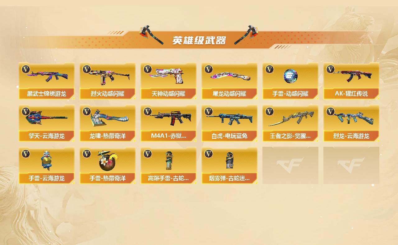 【英雄级武器】:AK47-火麒麟,M4A1-黑龙,M4A1-雷神,M4A1-黑骑士,M4A1-死神,无影-神兵利器,黑武士-锦绣游龙,M4A1-玫瑰精灵,QBZ03-金色蔷薇,烈火-动感闪耀,王者之影-觉醒版,AK-47-猩红传说,AK47-B-常胜将军,白虎-电玩蓝兔,Barrett-毁灭,M200-幻神,烈龙-云海游龙,天神-动感闪耀,修罗-古蛇迷踪,屠龙-动感闪耀,擎天-云海游龙,龙啸-热带奇洋,手雷-动感闪耀,手雷-云海游龙,手雷-热带奇洋,高爆手雷-古蛇迷踪,烟雾弹-古蛇迷踪,M4A1-赤狱骑士