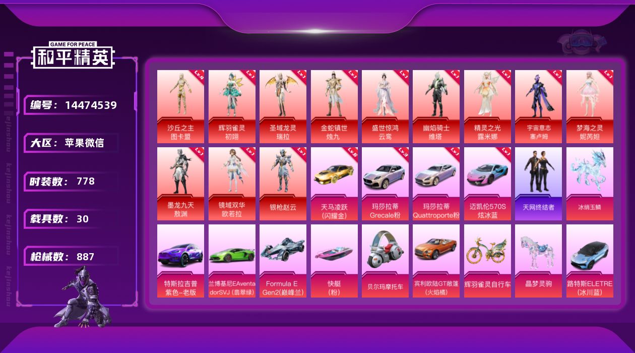 - [11355234]WBDS0061 苹果Q 148套装 176枪皮 1神装25粉装9特效枪2载具 沙丘之主-图卡盟 (1级) M416-超新星 (9级) 宾利BATUR(极速紫) 越野奶龙龙 赤蝎幽灵 AKM-缤纷海域 浪漫天命 圣堂之誓 梦幻火箭 雪国幻梦 赵灵儿 蔷薇星 白兰星 茉莉星 憨憨奶龙 天使彩虹糖 小叽联名款 怪诞乔克 镜光幻境 酣梦娃娃 缤纷油彩 放客神游 心之回忆 新星烈龙 星空之魅 童趣迷兔 冰霜白皇 炙焰红王 暖熊萌萌 馨动时刻 音爆索尼克 海盐物语 SCAR-L-纯梦嫁纱 (4级) M416-心之恋语 (1级) P90-沙丘之主 (1级) Kar98K-巳巳如意 (5级) AKM-百合蜜语 (7级) MG3-酷泡奶龙 (2级) DP-28-豹影疾电 (5级) AUG-超新星 (4级) 梦幻火箭飞行器 镜光幻境飞行翼 萌物绒绒飞行器 龟仙人 动感兔斯基 潮萌小黄鸭 呆萌铁蟹 万圣娃娃 鹰眼刺客 兔兔白日梦 奶芙汪汪 恶魔喵喵 激萌罗小黑 胖达圆圆 胖达团团 暗影哥特 雪国精灵头盔 深海小丑鱼头盔 梦幻火箭背包 雪国精灵背包 甜心宝贝背包 深海小丑鱼背包