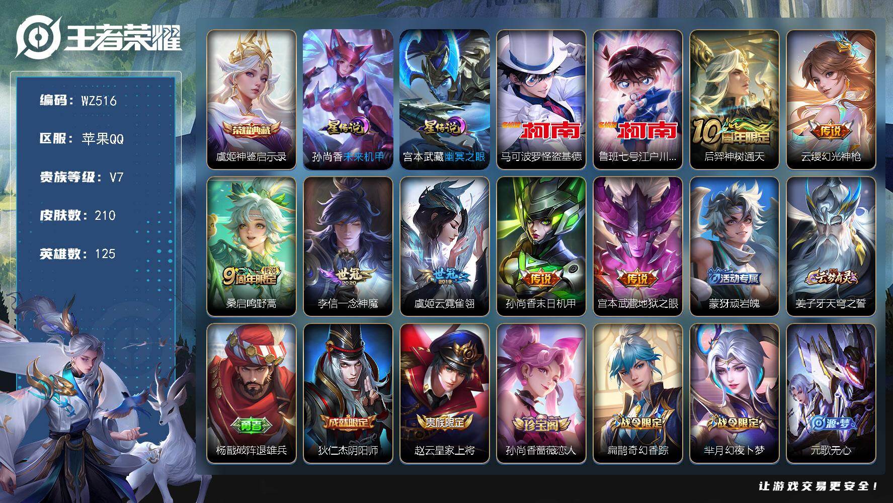 - [12147591]V9 5典藏 1珍品传说 35传说 125英雄 432皮肤 可修改实名 优质装备:鸣剑·曳影,九霄神辉(木兰典藏),赤影疾锋,弑枪猎影(韩信典藏),神鉴启示录,怪盗基德,黄金狮子座,黄金射手座,云鹰飞将(小将军),绛天战甲(鸡嘴战神),黄金白羊座,久胜战神,炽阳神光,一念神魔,末日机甲-孙尚香(绿蚂蚱),仲夏夜之梦(大飞蛾),地狱之眼,飞鸢探春,时之恋人-刘备(电焊工),超时空战士-狄仁杰,末日机甲-孙策,无双飞将,浮生妄,妄想实况,澜逐花归海,黄金天蝎座,涂山容容 传说皮:乘龙·铭钟鼎(赵云年限),铠冥王哈迪斯,幻光神枪 珍宝阁皮:妄想食味,胡桃夹子,优雅恋人 限定皮:愿照·九州拓(澜年限),愿照·众生和(妲己年限),逐霄战戟,映山客,陌上桑,鸣野蒿,夏侯惇霜北刀,至尊宝,白虎志(电光耗子),傲雪梅枪,时雨天司(水龙头),飞衡(韩信年限),匿光决锋者,怒海麟威,五谷丰年,冰锋战神,武圣,梁祝,御风骁将(吕布年限),李小龙,朱雀志(守约年限),默契交锋-花木兰,大圣娶亲,寅虎·赤拳(老虎年限),启示之音 史诗皮:鸭鸭历险记-刘禅,苍鳞隐世,器灵·浮梦炉,糖绘人间,绮世丹青,瑰影绮梦,化蝶舞,灵蛊蚀心,星界战将,谪仙醉月,龙之律动,雪豹·霜爪,百相守梦-周瑜,茶境仙,怒海争锋,炽弈燎原,撼地雄心,破空之剑,战舞者,涂山红红,东方月初,埋骨钱,芈月浮光幕影,海诺心动手记,琥珀纪元伽罗,决胜骁骑,蔬乡物语(鲁班七号),百相守梦-百里守约,星界特工,百相守梦-黄忠,守夜人,紫霞仙子,苍穹之光,电玩小子(小书包),黄金分割率,特工魅影,千年之狐,永昼,江河有灵,魅语,百解令(蒙犽),高渐离燃音魔法,蒙恬荣光圣徽,无限星赏官,匿光破解者,冰冠公主,偶像歌手,白蛇,晚萤,暗夜猫娘,银翎春语,龙骑士(小龙虾),末日机甲-吕布,猫狗日记-孙策,猫狗日记-大乔,乱世虎臣,节奏热浪,修罗,女仆咖啡,摇滚巨星,水果甜心,绅士熊喵,天才门将,星夜王子,心灵骇客,功夫厨神,德古拉伯爵,暗隐猎兽者,幽灵船长,鬼剑武藏,暗渊魔法,心灵战警,乐园奇幻夜,天秀·启明,舞动绿茵,地狱岩魂,纤云弄巧,拒霜思,缤纷独角兽,乘风破浪,逐浪之夏,月团寄思,水晶猎龙者,曙光守护者,箭羽风息,金属风暴,原初追逐者,圣诞狂欢,圣诞恋歌,鹰眼统帅,暗夜贵公子,魅力维加斯,黎明之约,雪上飞焰,赏金猎手,滕王阁序,无心
