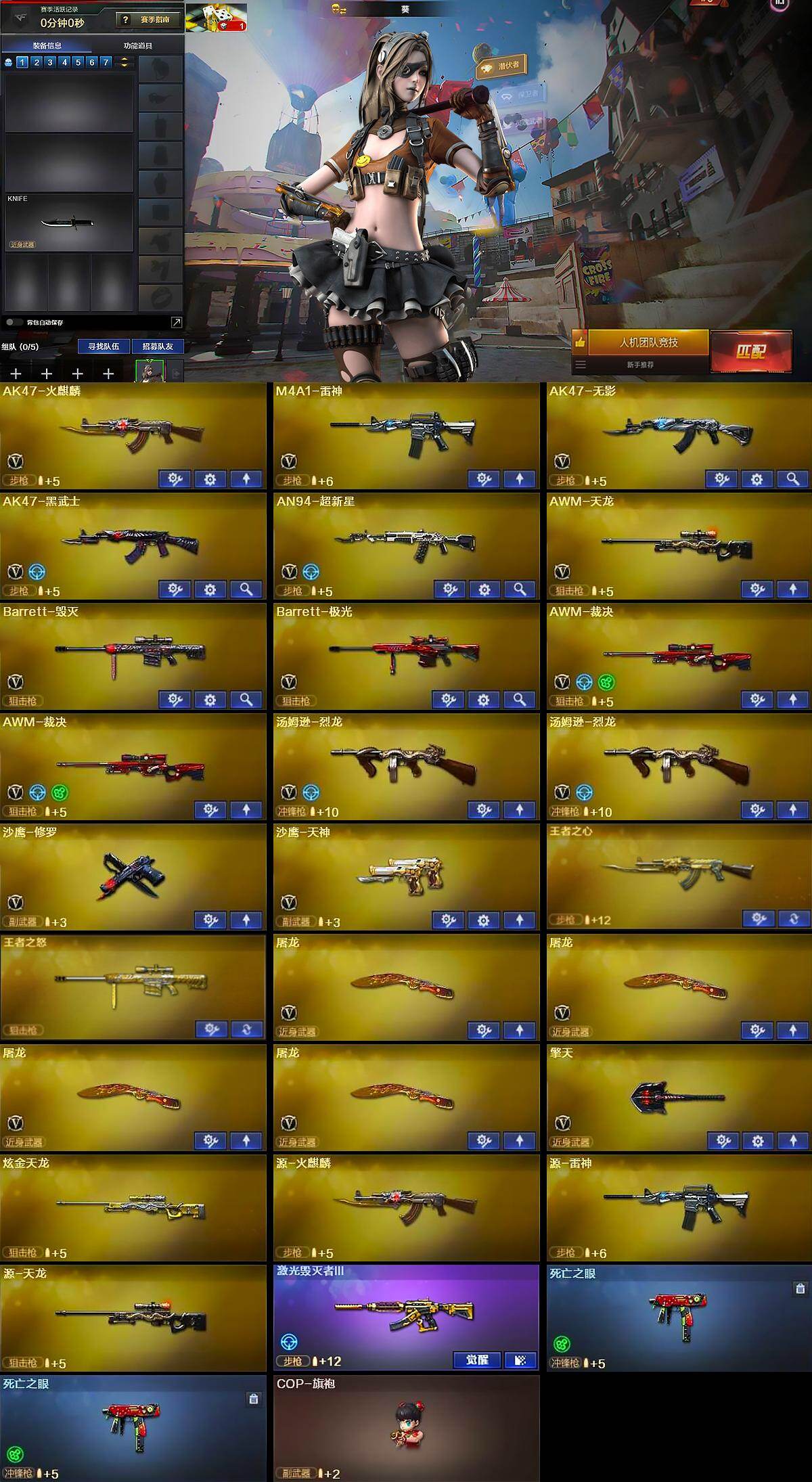 【英雄级武器】:AK47-火麒麟,M4A1-雷神,AK47-无影,AK47-黑武士,AN94-超新星,AWM-天龙,Barrett-毁灭,Barrett-极光,AWM-裁决*2,汤姆逊-烈龙*2,沙鹰-修罗,沙鹰-天神,屠龙*4,擎天