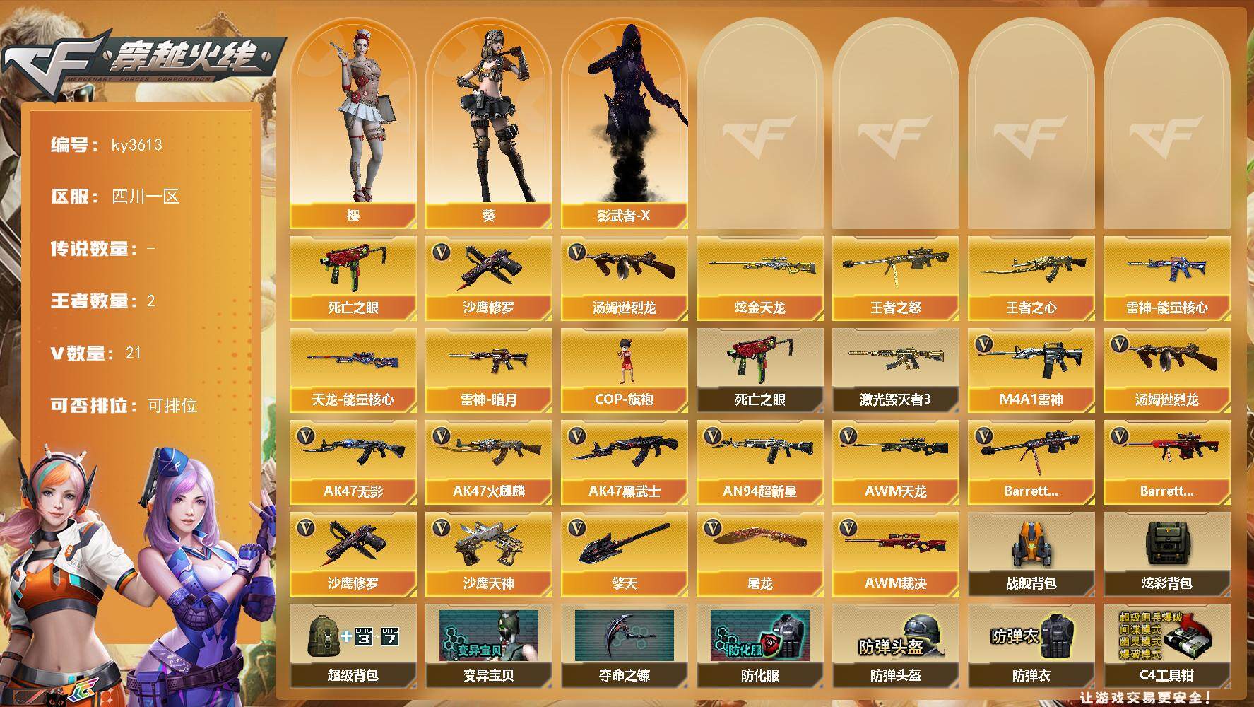 [14479020]四川一区-21V-2王者-1炫金 【热门武器】:死亡之眼*2,汤姆逊-烈龙*2,沙鹰-修罗 【王者炫金武器】:王者之心,王者之怒,炫金天龙 【皮肤】:雷神-暗月,雷神-能量核心,天龙-能量核心 【角色】:葵,樱,影武者-X 【人偶武器】:COP-旗袍 【暴走生化】:死亡之眼*2 【挑战大师】:激光毁灭者III 【英雄级武器】:AK47-火麒麟,M4A1-雷神,AK47-无影,AK47-黑武士,AN94-超新星,AWM-天龙,Barrett-毁灭,Barrett-极光,AWM-裁决*2,汤姆逊-烈龙*2,沙鹰-修罗,沙鹰-天神,屠龙*4,擎天 【道具】:战舰背包,炫彩背包,超级背包,变异宝贝,夺命之镰,防化服,防弹头盔,防弹衣,C4工具钳,手雷包 【特殊枪械】:2烈龙