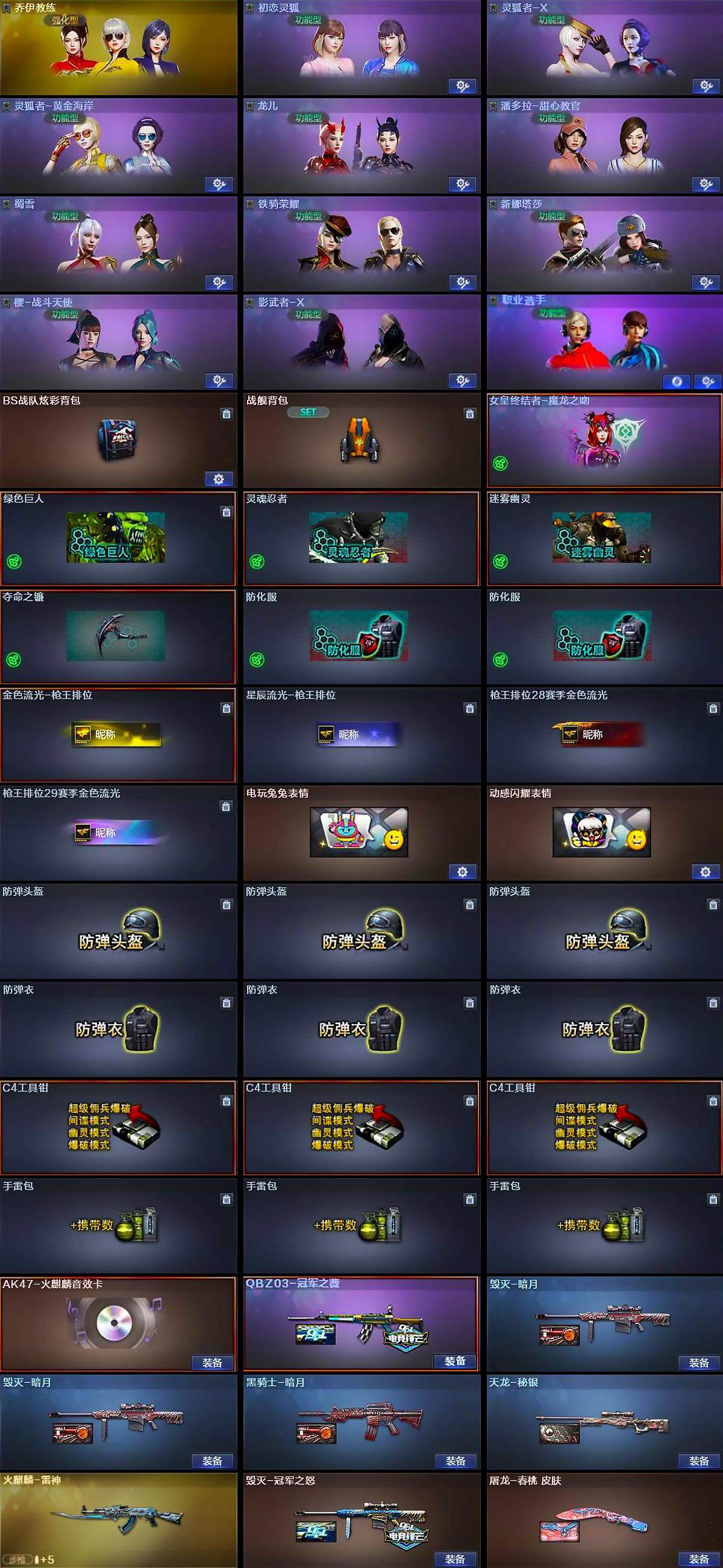 【道具】:BS战队炫彩背包,战舰背包,女皇终结者-魔龙之吻,绿色巨人,灵魂忍者,迷雾幽灵,夺命之镰,防化服*2,金色流光-枪王排位,星辰流光-枪王排位,枪王排位28赛季金色流光,枪王排位29赛季金色流光,电玩兔兔表情,动感闪耀表情,防弹头盔*3,防弹衣*3,C4工具钳*3,手雷包*3