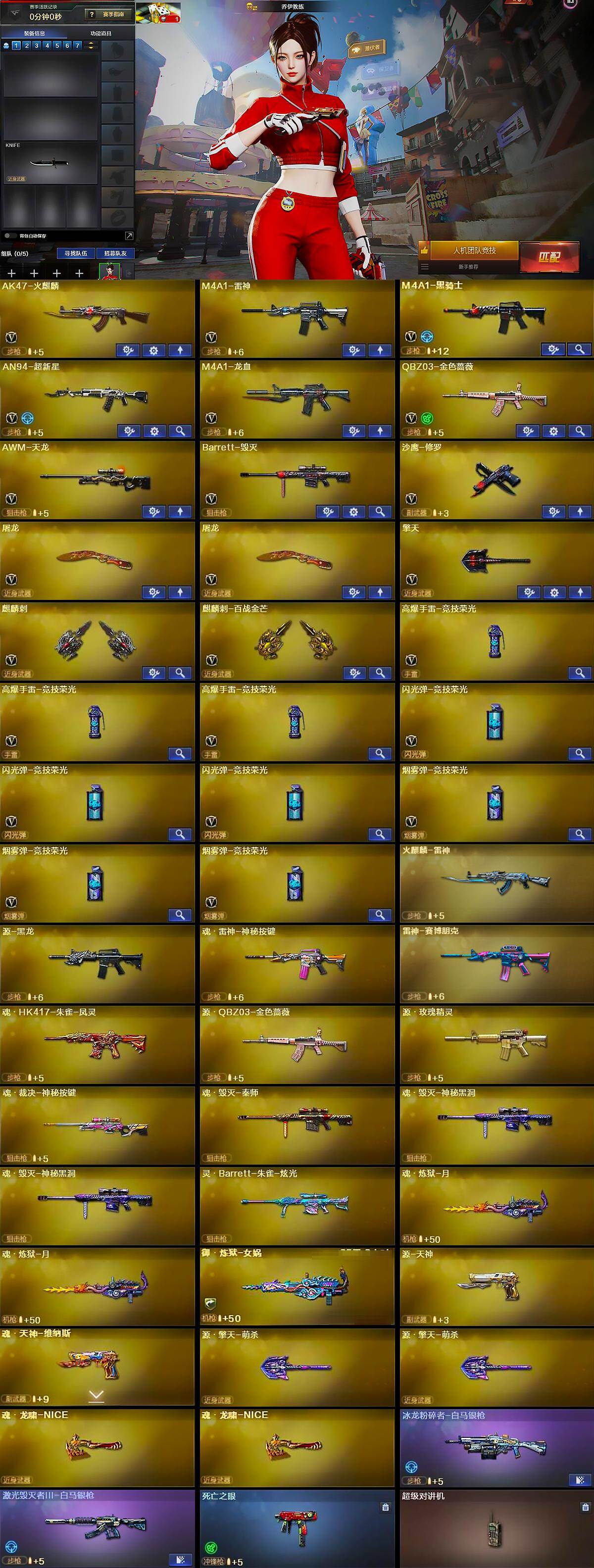 【英雄级武器】:AK47-火麒麟,M4A1-雷神,M4A1-黑骑士,AN94-超新星,M4A1-龙血,QBZ03-金色蔷薇,AWM-天龙,Barrett-毁灭,沙鹰-修罗,屠龙*2,擎天,麒麟刺,麒麟刺-百战金芒,高爆手雷-竞技荣光*3,闪光弹-竞技荣光*3,烟雾弹-竞技荣光*3