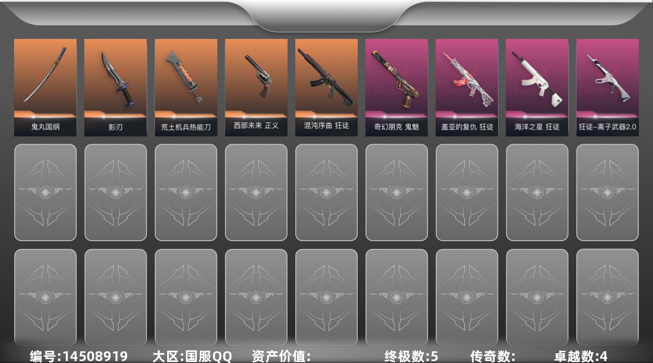 - [12175869]4橙皮 4紫皮 26皮肤 27英雄 82卡面 390已用源晶 未定级 优质装备:耀鳞威龙套装,狂徒-归零者,狂徒-塑水宗,狂徒-紫阙金琅,狂徒-耀鳞威龙,威龙之刃,幻影-源能者危机001,鬼魅-耀鳞威龙 近战武器皮肤:匕首-沙尘幻旅