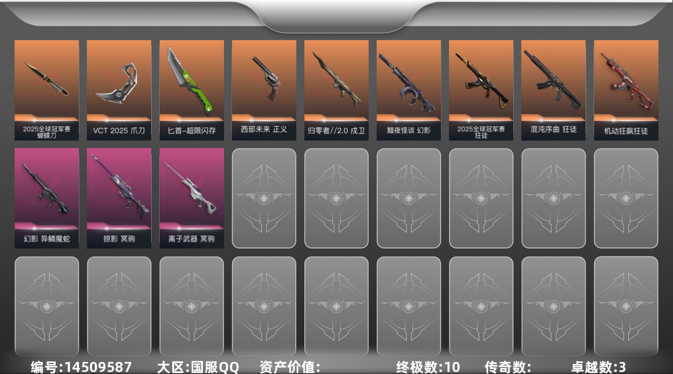 [14509587]【套装】:2025全球冠军赛套装,VCT 2025 赛季套装 【英雄】:幻棱,炼狱,维斯,暮蝶,钛狐,壹决,铁臂,捷风,雷兹,幽影,不死鸟,贤者,猎枭,蝰蛇,零,芮娜,奇乐,尚勃勒,霓虹,斯凯,夜露,星礈,K/O,海神,盖可,黑梦,钢锁 【近战 武器】:近战武器-2025全球冠军赛 蝴蝶刀,近战武器-VCT 2025 爪刀,近战武器-超限闪存 匕首 【狂徒】:狂徒-2025全球冠军赛,狂徒-混沌序曲,狂徒-机动狂飙 【幻影】:幻影-黯夜怪谈,幻影-异鳞魔蛇,幻影-超限闪存 【戍卫】:戍卫-归零者//2.0,戍卫-浮光跃金 【獠犬】:獠犬-模拟赫兹 【冥驹】:冥驹-掠影,冥驹-离子武器,冥驹-模拟赫兹 【莽侠】:莽侠-超限闪存 【战神】:战神-浮光跃金 【雄鹿】:雄鹿-模拟赫兹 【骇灵】:骇灵-无限竞技,骇灵-浮光跃金 【蜂刺】:蜂刺-超限闪存 【标配】:标配-浮光跃金 【正义】:正义-西部未来,正义-超限闪存,正义-纳米打击 【鬼魅】:鬼魅-诡秘蛇影,鬼魅-模拟赫兹,鬼魅-星云暗涌 【卡面】:终章:激斗汉堡 卡面,进入射程 卡面,《双城之战》拥抱 卡面,精灵大战 卡面,欢迎来到底城 卡面,南瓜盛典 卡面,VCT CN首冠 卡面,唱片的故事 卡面,钢弓与箭弦 卡面,排除故障 卡面,战术桌游 卡面,悠享食光 卡面,修车达人 卡面,热舞环节 卡面,模拟赫兹 卡面,浮光跃金 卡面,超限闪存 卡面,维斯工牌 卡面,正义的化身 卡面,时间到 卡面,最高舞台 卡面,声感陷阱设计图 卡面,红鳞松叶 卡面,Clutch 卡面,梦幻奶茶 卡面,流星兵团 卡面,脚踝终结者 卡面 ,无畏契约GO!第一卷:芮娜 卡面,复古浪潮 卡面,无畏契约GO!第一卷:零 卡面,《双城之战》金克丝 卡面,没有什么能逃过我的眼睛 卡面,代号红色 卡面,冰淇淋店 卡面,新兵报到 卡面,友军火力 卡面,V契约 卡面,无畏契约 卡面 【喷漆】:纳米打击 喷漆,荒土机兵 喷漆,嗨宝南瓜灯 喷漆,嘭! 喷漆,都算到了 喷漆,控场勿近 喷漆,皮蛋呼呼 喷漆,像素星礈 喷漆,图谋不轨的零 喷漆,小丑猫 喷漆,模拟赫兹 喷漆,高丽风情小熊 喷漆,蹲到一个 喷漆,全力集中 喷漆,超限闪存 喷漆,RUA一下 喷漆,熊抱 喷漆,蛋糕还是爆能器? 喷漆,高丽风情小虎 喷漆,记在小本本 喷漆,防弹企鹅 喷漆,高丽风情小蛙 喷漆,超