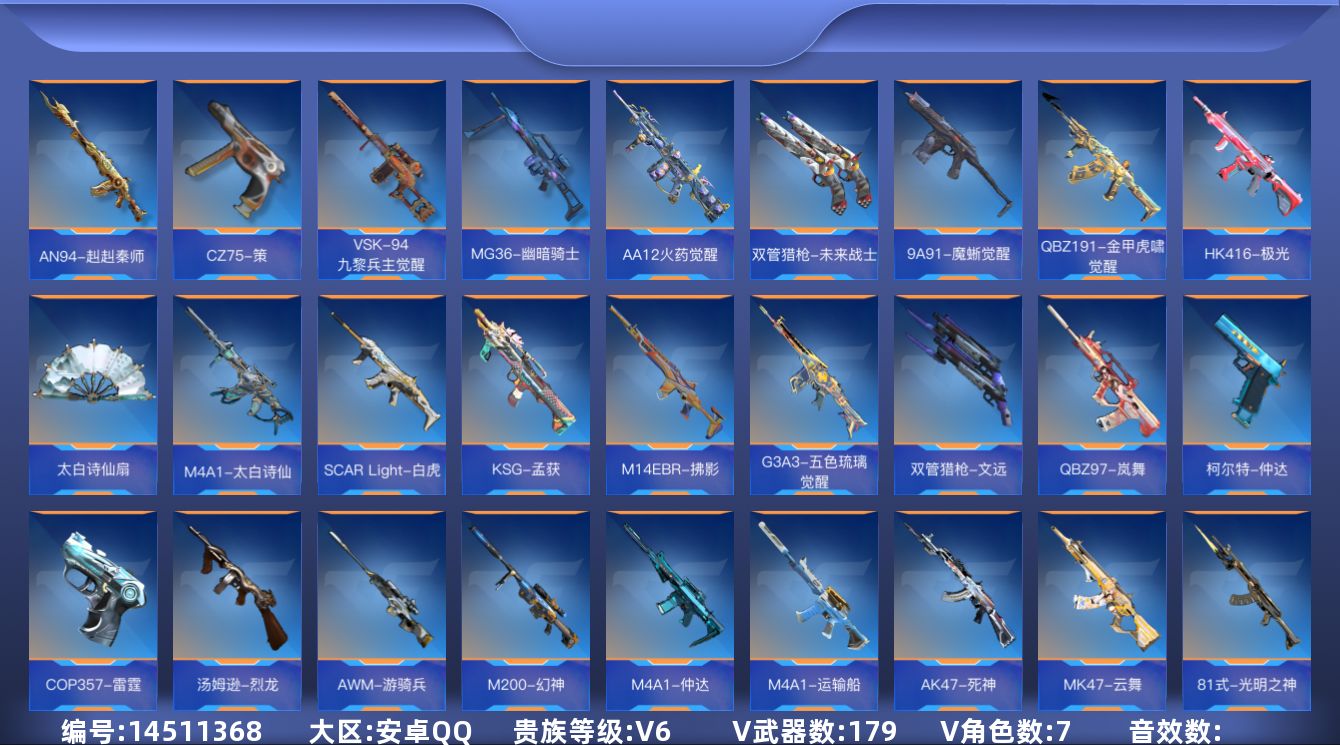 [14511368]v6-8英雄角色数-171英雄武器数-8王者 9稀有武器! 【王者系列】:王者之心,王者之迹,王者之蝶,王者之兽,王者之狱,王者之魂,王者之霆,王者之业 【热门武器】:KSG-孟获,81式-光明之神,M4A1-仲达,M4A1-游骑兵,M200-幻神,AWM-游骑兵,COP 357-雷霆,CZS2-仲康,AN94-盖 【角色】:审判者,瞳,关小雨*2,零-水下丽影,炽天使-X,零-新生,步练师 【英雄武器】:AK47-火麒麟*2,AK47-沙漠领主*2,AK47-猩红传说,AK47-血武士,AK47-死神,AK47-黑鲨,AK47-谜城烟火*2,M4A1-雷神*2,M4A1-黑骑士,M4A1-黑龙,M4A1-死神*2,M4A1-游骑兵,M4A1-仲达,M4A1-运输船,M4A1-太白诗仙,SCAR-幽暗骑士,SCAR Light-白虎,SCAR-守护者觉醒,SCAR-心动PICK,AN94-卷帘大将军,AN94-赳赳秦师,AN94-盖,9A91-魔蜥觉醒,M14EBR-拂影,AK12-天启,HK416-极光,81式-光明之神,QBZ19-天使,MK47-云舞,G3A3-五色琉璃觉醒,G3A3-衍神兵,QBZ97-岚舞,QBZ97-浩瀚征途,QBZ191-金甲虎啸觉醒,AWM-天龙,AWM-游骑兵,AWM-裁决,巴雷特-毁灭*3,M200-幻神,09式狙-天神,98K-黑骑士,98K-星神,TAC-晴舞,VSK-94-九黎兵主觉醒,VSK-94-金蚀,MG36-幽暗骑士,QBB95-极光,MK5-极光,MK5-魔鲲,汤姆逊-烈龙,寒霜烈龙*4,CZS2-仲康,DDM4-PDW-星际宇航觉醒,地狱火,嗜血金鲨,地狱烈炎,毁灭征服者-超越Max,AA12-火药觉醒,KSG-天蓬元帅,KSG-极光,KSG-孟获,KSG-钟馗觉醒,M1887-幽冥玄喵觉醒,M1216-血月,Origin12-机变奇蛇觉醒,USP-机械迷城,沙鹰-修罗,沙鹰-飞电,双持沙鹰-雷麒麟,沙鹰-宇航兔兔*2,双持沙鹰-元让,蚩尤战弓觉醒,双持GLOCK18-本初,COP 357-雷霆,双管猎枪-文远,双管猎枪-未来战士,柯尔特-仲达,双持柯尔特-极光,CZ75-策,掠夺者P365-虹舞,白骨利刃,炽芒蝶刃,清刚-觉醒,香蕉匕首觉醒,匕首-浩瀚征途,龙啸,龙啸-堕天神,气勇胆烈戟,屠龙*4,血月,尼泊
