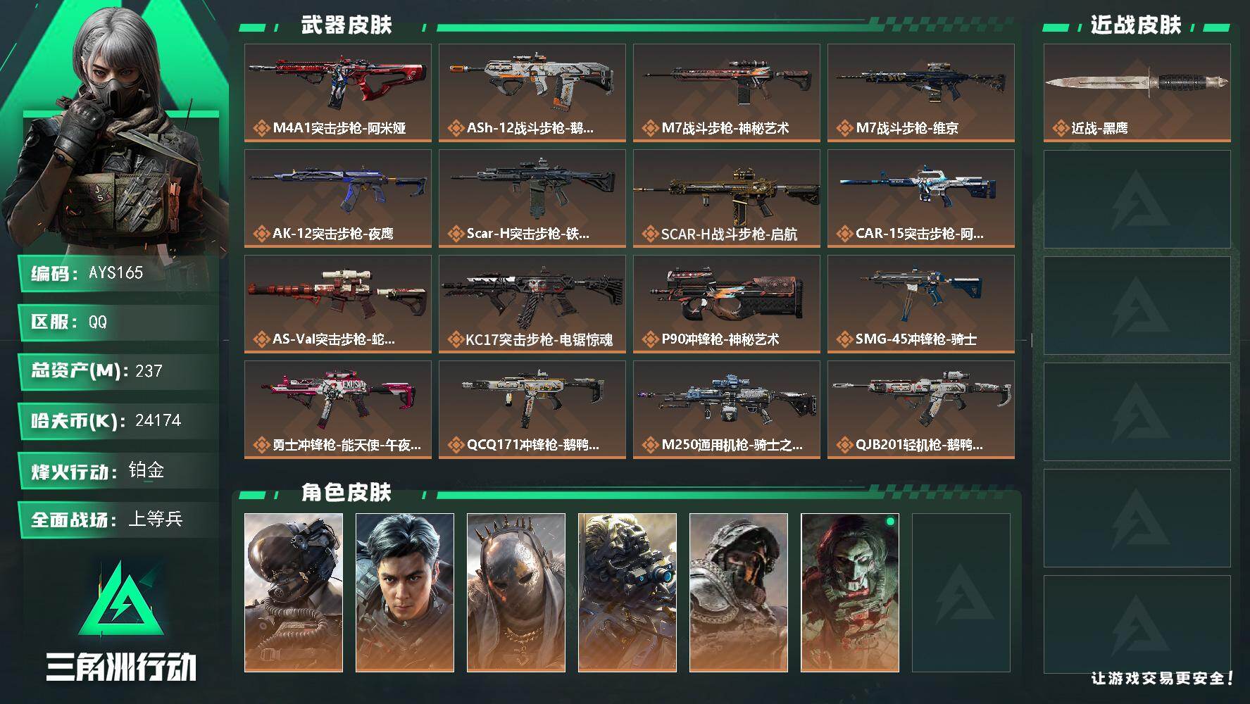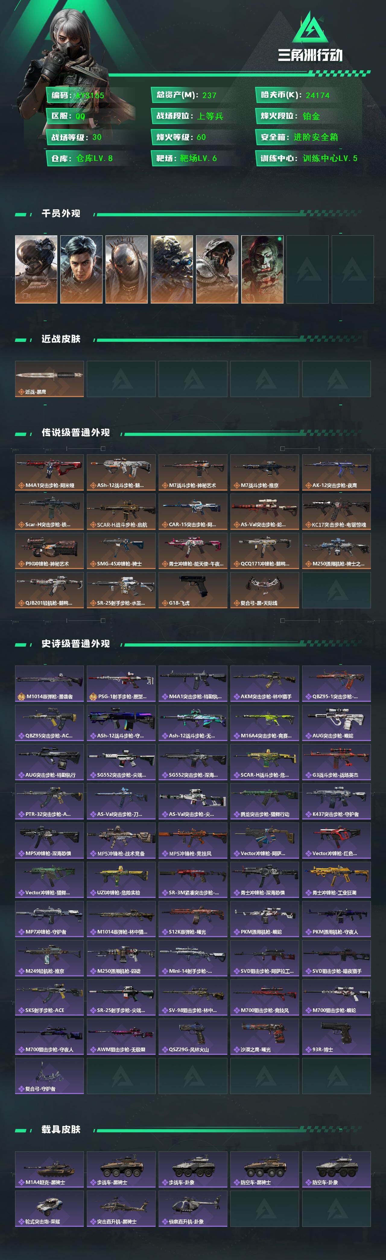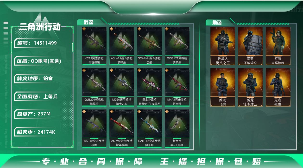 [14511499],【店主推荐捡漏号!可直接换绑】24174k哈伏币-204m流动资产-60烽火等级-铂金-30战场等级-上等兵 【干员外观】:威龙-壮志凌云,威龙-飞虎,牧羊人-街头之王,无名-夜鹰,深蓝-不破誓约,红狼-电锯惊魂 【近战皮肤】:近战-黑鹰 【传说外观】:M4A1突击步枪-阿米娅,ASh-12战斗步枪-鹅鸭杀,M7战斗步枪-神秘艺术,M7战斗步枪-维京,AK-12突击步枪-夜鹰,SCAR-H战斗步枪-铁艺苍穹,SCAR-H战斗步枪-启航,CAR-15突击步枪-阿米娅,AS Val突击步枪-蛇年祥瑞,KC17突击步枪-电锯惊魂,P90冲锋枪-神秘艺术,SMG-45冲锋枪-骑士,勇士冲锋枪-能天使-午夜邮差,QCQ171冲锋枪-鹅鸭杀,M250通用机枪-骑士之心,QJB201轻机枪-鹅鸭杀,SR-25射手步枪-水墨云图,G18-飞虎,复合弓-黑·天际线 【史诗外观】:M1014霰弹枪-潜袭者,PSG-1射手步枪-原型机,M4A1突击步枪-特勤执行,AKM突击步枪-林中猎手,QBZ95-1突击步枪-曙光,QBZ95-1突击步枪-ACE,ASh-12战斗步枪-守夜人,ASh-12战斗步枪-无极限,M16A4突击步枪-竞赛选手,AUG突击步枪-蝮蛇,AUG突击步枪-特勤执行,SG552突击步枪-尖端治疗,SG552突击步枪-深海恐惧,SCAR-H战斗步枪-危险实验,G3战斗步枪-战场英杰,PTR-32突击步枪-ACE,AS Val突击步枪-刀锋,AS Val突击步枪-尖端治疗,腾龙突击步枪-猎鳄行动,K437突击步枪-守护者,MP5冲锋枪-深海恐惧,MP5冲锋枪-战术竞备,MP5冲锋枪-竞技风,Vector冲锋枪-阿萨拉文明,Vector冲锋枪-红色彗星,Vector冲锋枪-猎鳄行动,UZI冲锋枪-危险实验,SR-3M紧凑突击步枪-英雄,勇士冲锋枪-深海恐惧,勇士冲锋枪-工业狂潮,MP7冲锋枪-守护者,M1014霰弹枪-林中猎手,S12K霰弹枪-曙光,PKM通用机枪-蝮蛇,PKM通用机枪-守夜人,M249轻机枪-维京,M250通用机枪-囚徒,Mini-14射手步枪-守护者,SVD狙击步枪-阿萨拉工艺,SVD狙击步枪-暗夜猎手,SKS射手步枪-ACE,SR-25射手步枪-尖端治疗,SV-98狙击步枪-林中猎手,M700狙击步枪-竞技风,M700狙击步枪-蝮蛇,M700狙击步枪