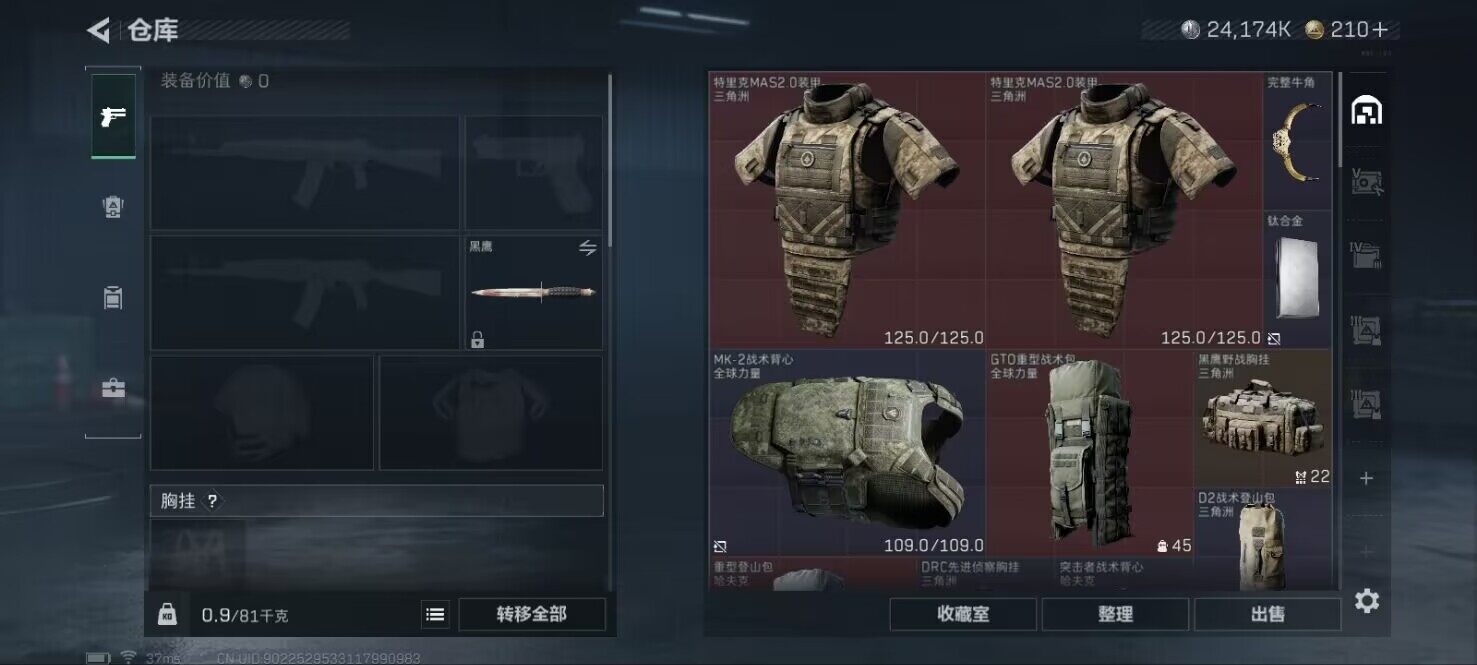 - [15605023]总资产153m【店主推荐捡漏号!可直接换绑】 31943k哈伏币-106m流动资产-60烽火等级-黄金-8战场等级-列兵 【干员外观】:骇爪-维什戴尔,红狼-电锯惊魂 【近战皮肤】:近战-黑鹰 【传说级普通外观】:M4A1突击步枪-蚀金玫瑰,SCAR-H战斗步枪-启航,KC17突击步枪-电锯惊魂,勇士冲锋枪-能天使-午夜邮差,R93狙击步枪-维什戴尔 【史诗级普通外观】:MP5冲锋枪-战术竞备,SR-3M紧凑突击步枪-战术竞备,沙漠之鹰-曙光 【稀有级普通外观】:SMG-45-行动开启,Mini-14射手步枪-荣耀列队,G18-星链科技 【普通级普通外观】:M4A1突击步枪-海色,K416突击步枪-几何迷彩,M16A4突击步枪-山林猎人,SG552突击步枪-浅蓝涂装,SG552突击步枪-海浪,SCAR-H战斗步枪-红色涂装,MP5冲锋枪-海色,Vector冲锋枪-几何迷彩,QCQ171冲锋枪-三角洲力量,M1014霰弹枪-高雅黑,M1014霰弹枪-海浪,M249轻机枪-黄蜂,SR-25射手步枪-黄蜂 【军牌】:军牌-装备修理,军牌-来点薯条,军牌-信誉优秀 【挂饰】:挂饰-火箭玫瑰,挂饰-窃风密探,挂饰-能天使,挂饰-维什戴尔,挂饰-阿萨拉狙击兵,挂饰-阿萨拉霰弹兵,挂饰-诡影狙击兵,挂饰-诡影喷火兵,挂饰-启程,挂饰-阿萨拉徽章