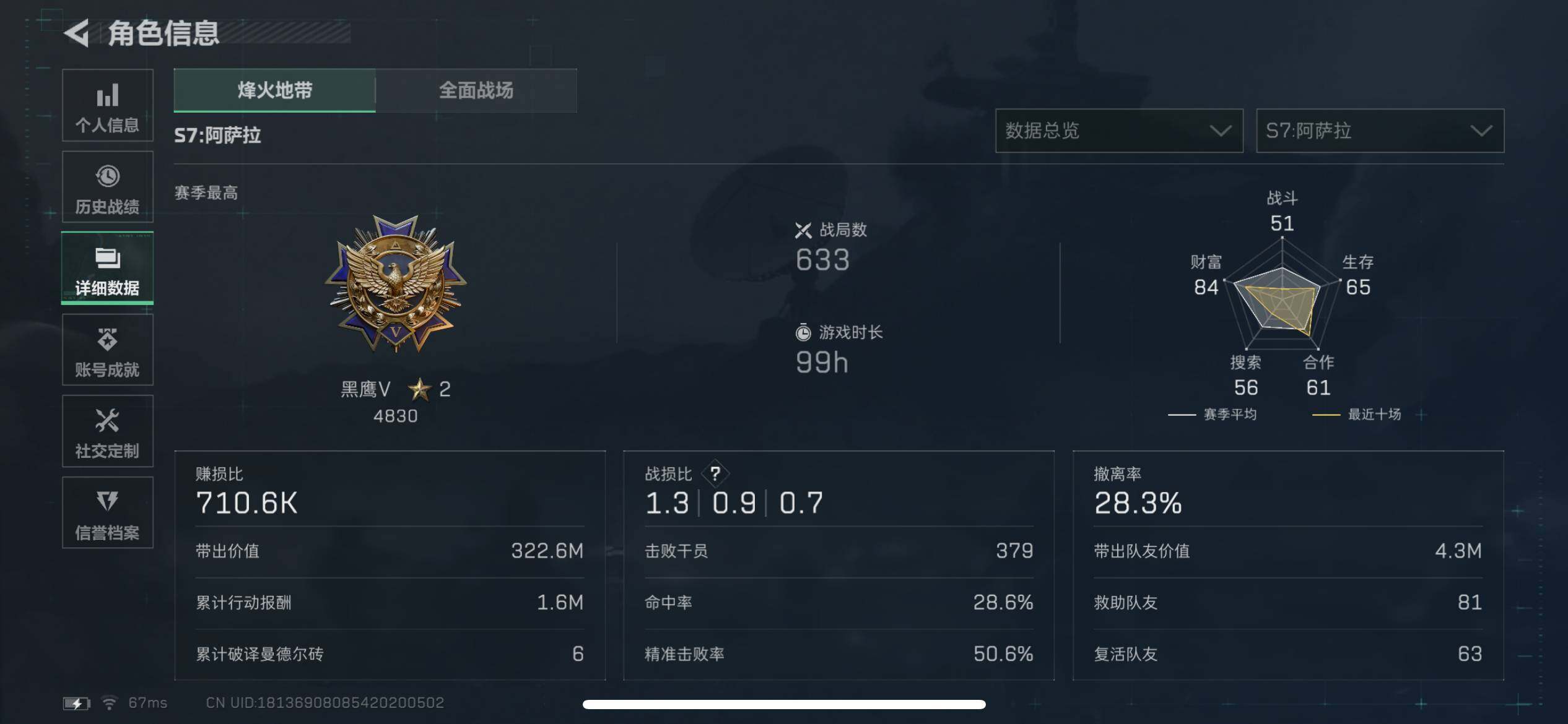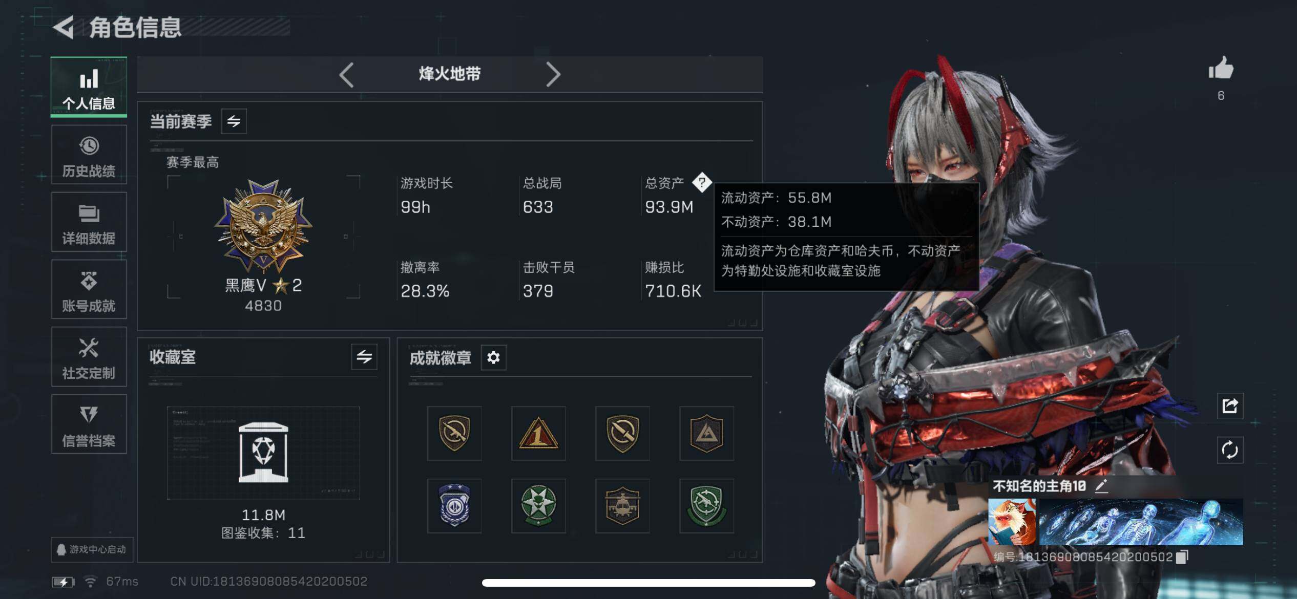 93m总资产 1382k哈伏币-55m流动资产-60烽火等级-钻石-1战场等级-无军衔