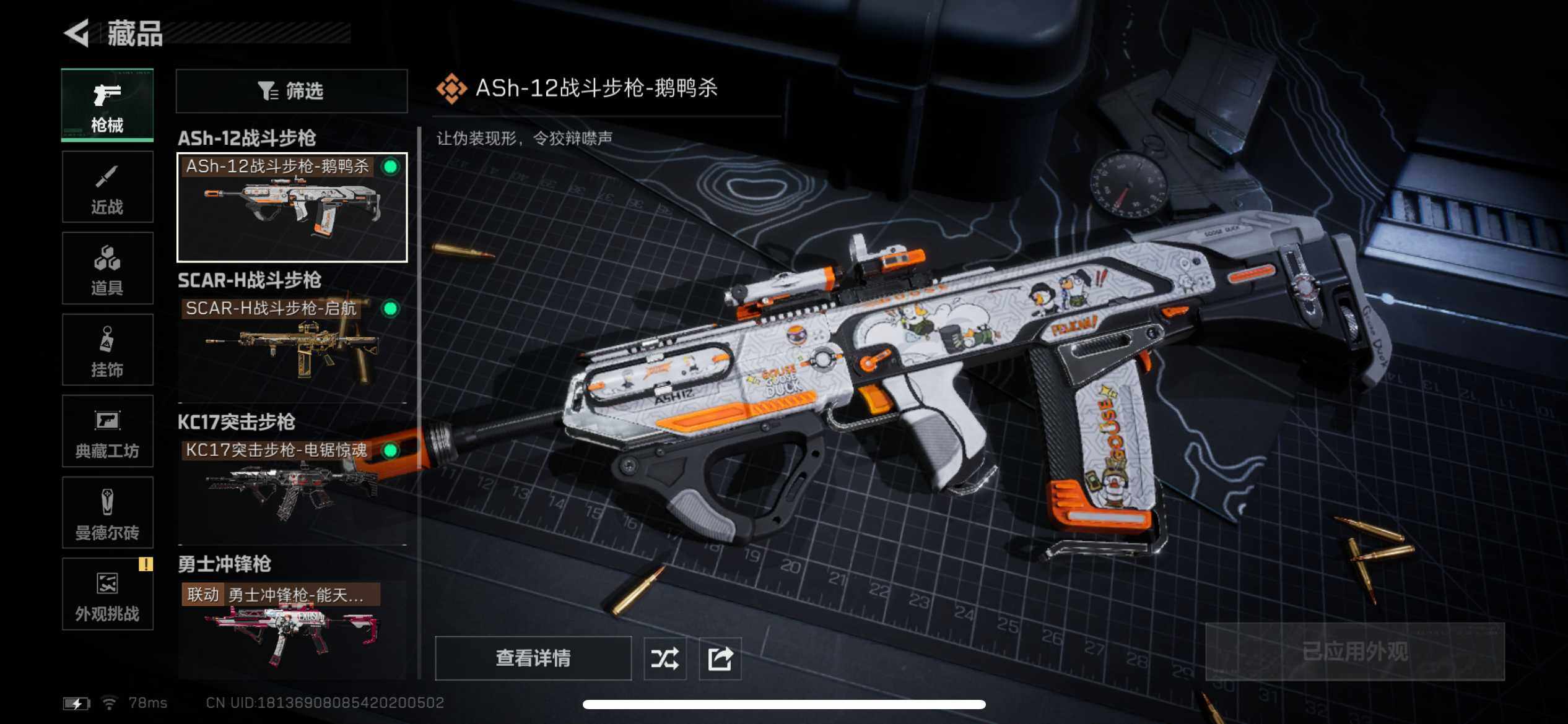 【传说外观】:ASh-12战斗步枪-鹅鸭杀,SCAR-H战斗步枪-启航,KC17突击步枪-电锯惊魂,勇士冲锋枪-能天使-午夜邮差,QCQ171冲锋枪-鹅鸭杀,QJB201轻机枪-鹅鸭杀,R93狙击步枪-维什戴尔