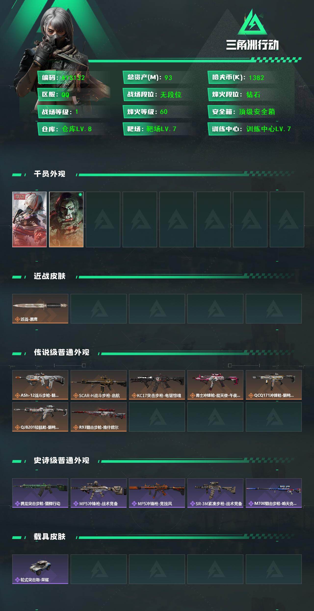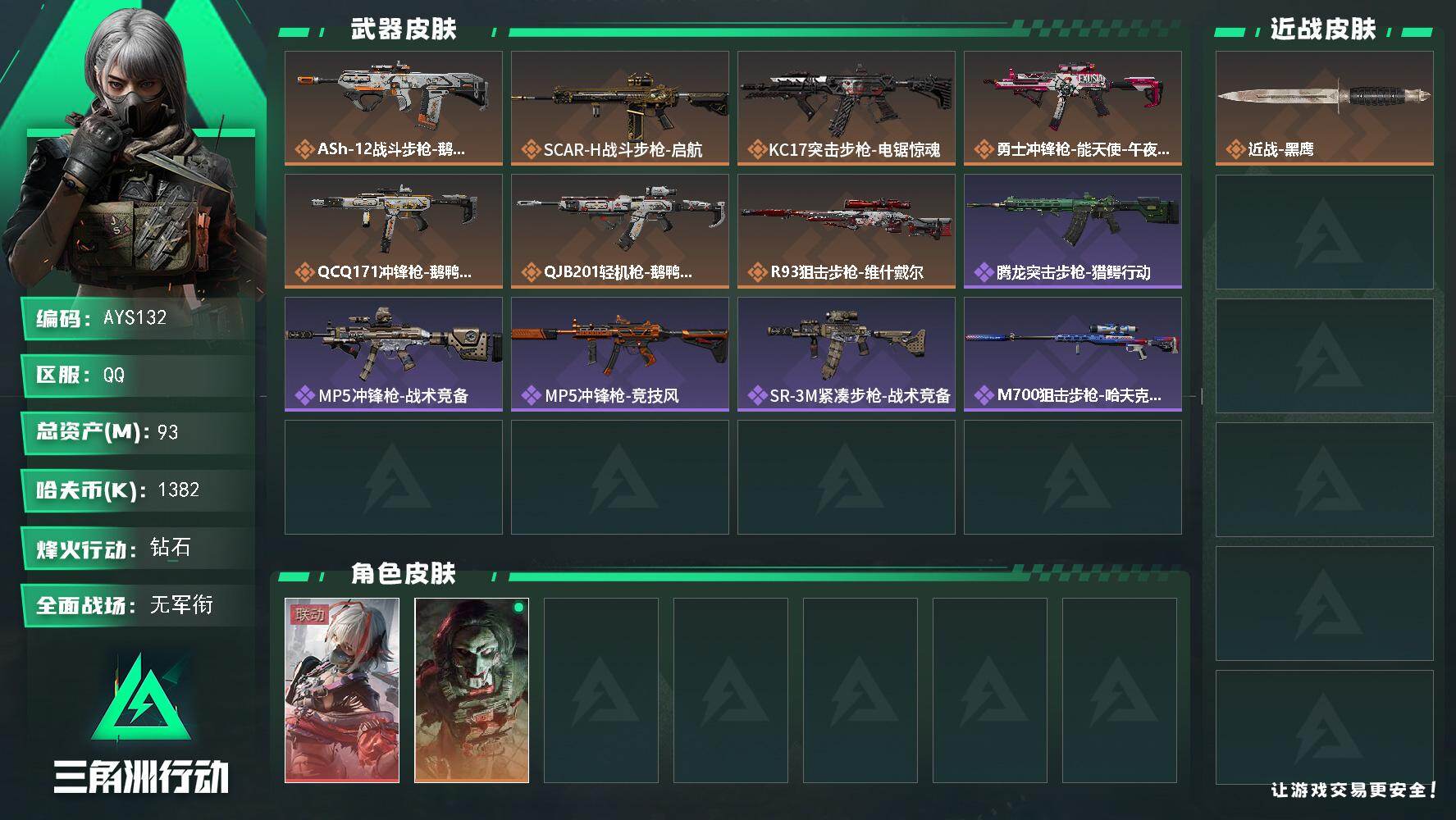 [14511526]【店主推荐捡漏号!可直接换绑】 93m总资产 1382k哈伏币-55m流动资产-60烽火等级-钻石-1战场等级-无军衔 【干员外观】:骇爪-维什戴尔,红狼-电锯惊魂 【近战皮肤】:近战-黑鹰 【传说外观】:ASh-12战斗步枪-鹅鸭杀,SCAR-H战斗步枪-启航,KC17突击步枪-电锯惊魂,勇士冲锋枪-能天使-午夜邮差,QCQ171冲锋枪-鹅鸭杀,QJB201轻机枪-鹅鸭杀,R93狙击步枪-维什戴尔 【史诗外观】:腾龙突击步枪-猎鳄行动,MP5冲锋枪-战术竞备,MP5冲锋枪-竞技风,SR-3M紧凑突击步枪-战术竞备,M700狙击步枪-哈夫克警备 【稀有外观】:AKM突击步枪-肃杀,QBZ95-1突击步枪-公平竞技,M7战斗步枪-捣蛋鬼,SCAR-H战斗步枪-荣耀列队,腾龙突击步枪-冰天雪地,MP5冲锋枪-哈夫克卫队,P90冲锋枪-黄昏,P90冲锋枪-捣蛋鬼,UZI冲锋枪-亚特兰蒂斯,野牛冲锋枪-精英联盟,SMG-45-行动开启,SMG-45冲锋枪-幻影结构,勇士冲锋枪-冰天雪地,QJB201轻机枪-哈夫克卫队,Mini-14射手步枪-荣耀列队,SR-25射手步枪-开拓 【普通外观】:R93狙击步枪-监察,M4A1突击步枪-粉色涂装,M4A1突击步枪-高雅黑,M4A1突击步枪-海色,QBZ95-1突击步枪-高雅黑,QBZ95-1突击步枪-海浪,QBZ95-1突击步枪-海色,QBZ191突击步枪-三角洲力量,K416突击步枪-几何迷彩,M16A4突击步枪-高雅黑,AUG突击步枪-浅蓝涂装,SG552突击步枪-三角洲力量,SG552突击步枪-浅蓝涂装,SG552突击步枪-海浪,PTR-32突击步枪-黄蜂,MP5冲锋枪-黄蜂,野牛冲锋枪-高雅黑,M1014霰弹枪-高雅黑,M1014霰弹枪-海浪,M250通用机枪-条纹,SVD狙击步枪-高雅黑,SKS射手步枪-三角洲力量,SR-25射手步枪-黄蜂,SV-98狙击步枪-红色涂装,QSZ92G-条纹,沙漠之鹰-高雅黑 【载具外观】:轮式突击炮-荣耀 【军牌】:军牌-永恒,军牌-信誉优秀,军牌-小心鳄鱼 【挂饰】:挂饰-黄金视野,挂饰-维什戴尔,挂饰-阿萨拉狙击兵*2,挂饰-阿萨拉霰弹兵,挂饰-诡影狙击兵,挂饰-诡影喷火兵*2,挂饰-崩岩重炮*3,挂饰-暗行哨兵,挂饰-启程,挂饰-阿萨拉徽章