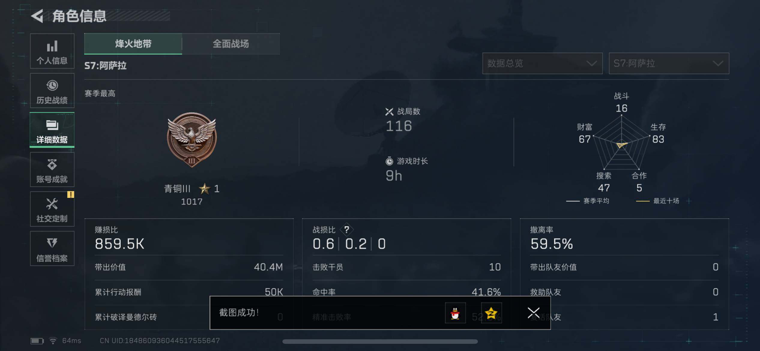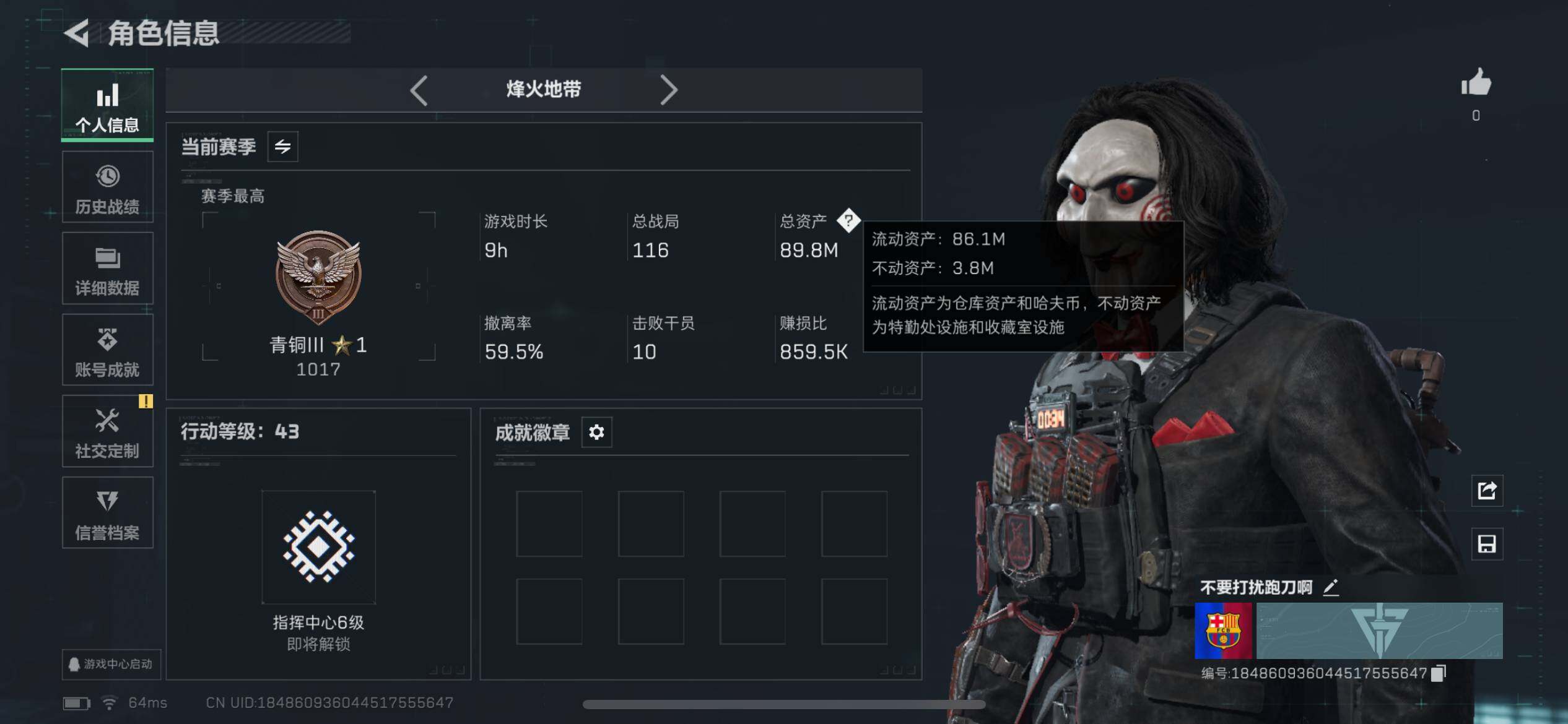 总资产89m 80258k哈伏币-86m流动资产-43烽火等级-青铜-8战场等级-列兵